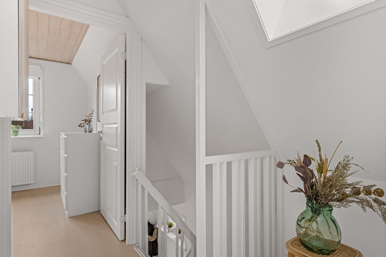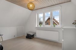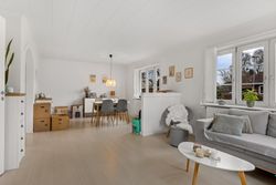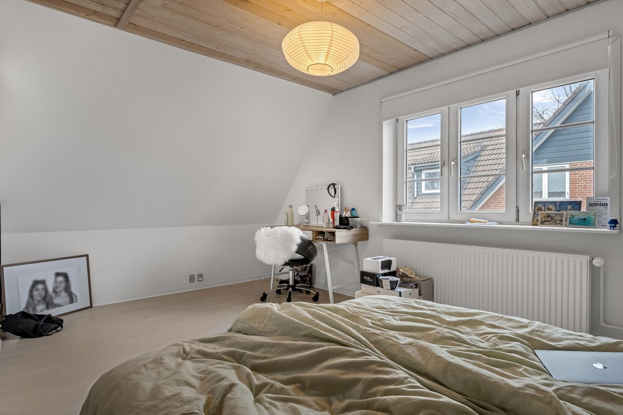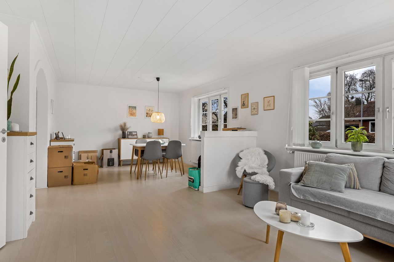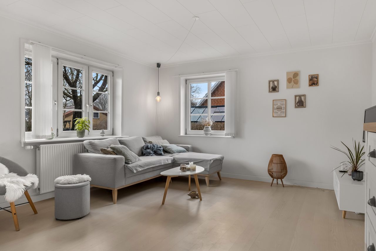 Opholdsstuen fremstår som boligens oase af ro, hvor naturligt lys strømmer ind gennem vinduerne og skaber en varm atmosfære. Her kan du nyde hyggelige stunder med familie eller venner eller blot slappe af med en god bog.