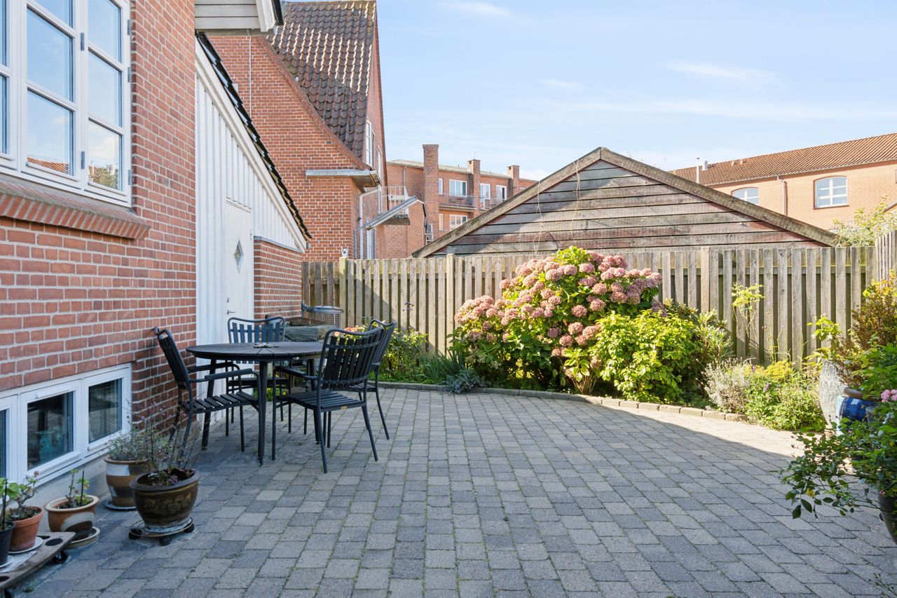 Haven fremstår nem og overskuelig da matriklen stort set er flisebelagt og terrassen har gode solkroge og vender syd/vestvendt med plads til hele familien.
