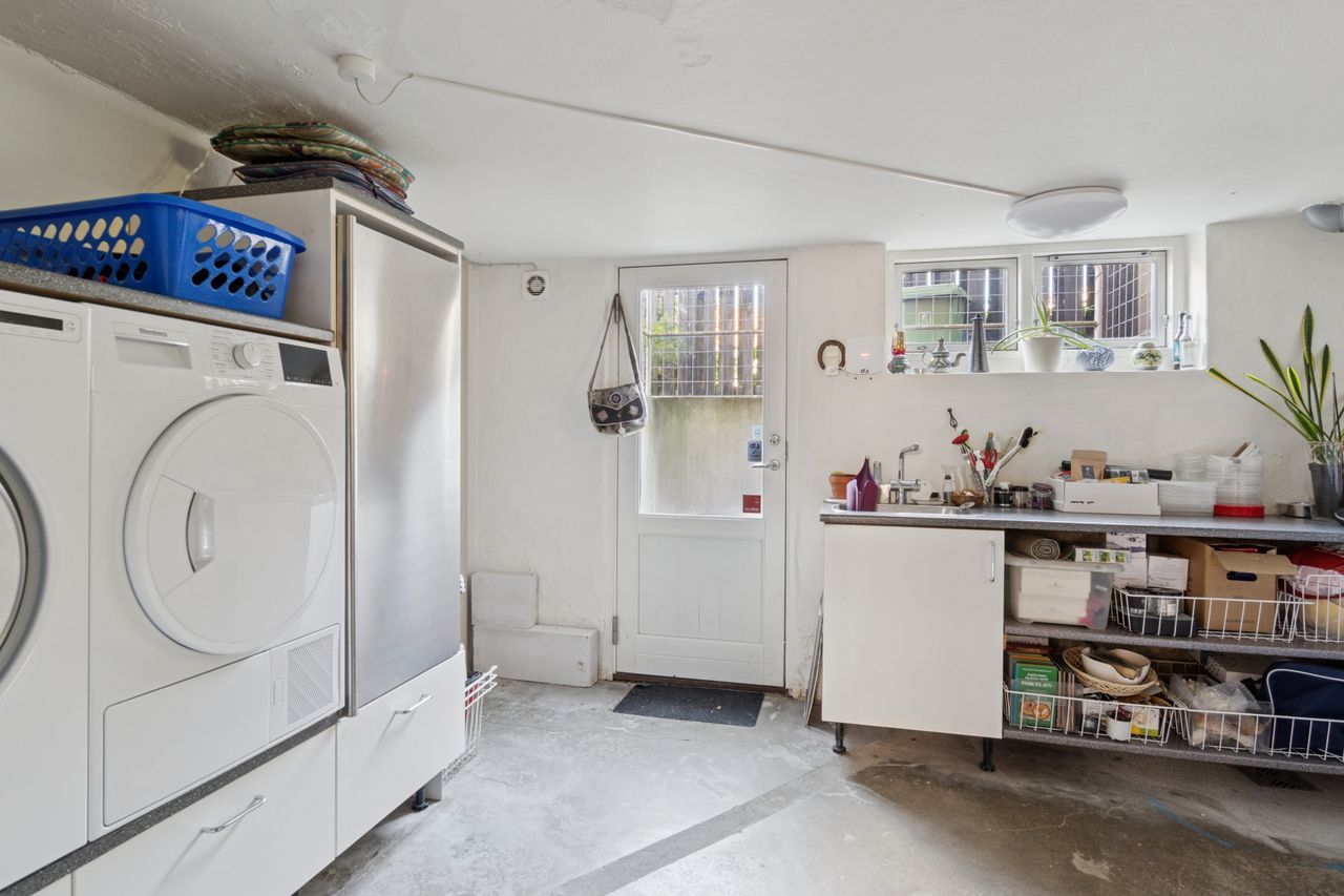 Kælderen med egen indgang byder på flere disponible rum, som kan anvendes til hobbyrum, opbevaring, fitness eller gæsteafdeling. Der er også et stort og funktionelt bryggers med mulighed for vaskefaciliteter.