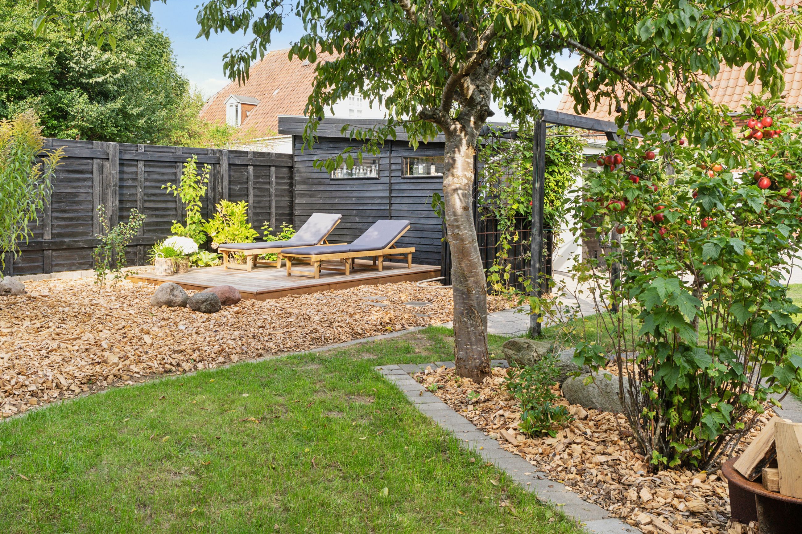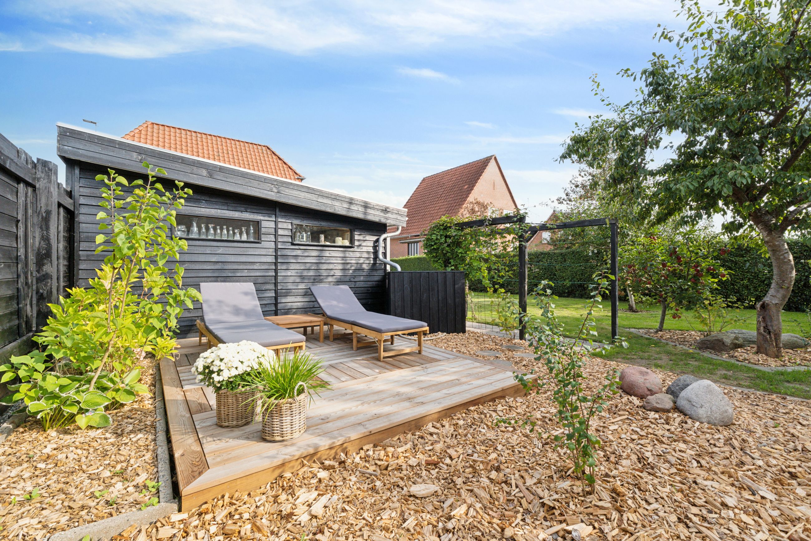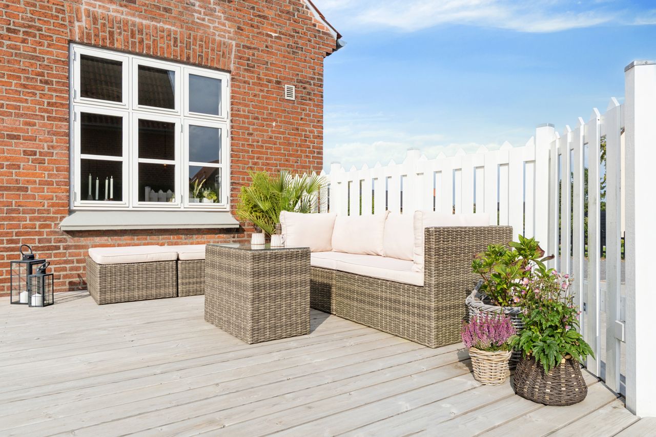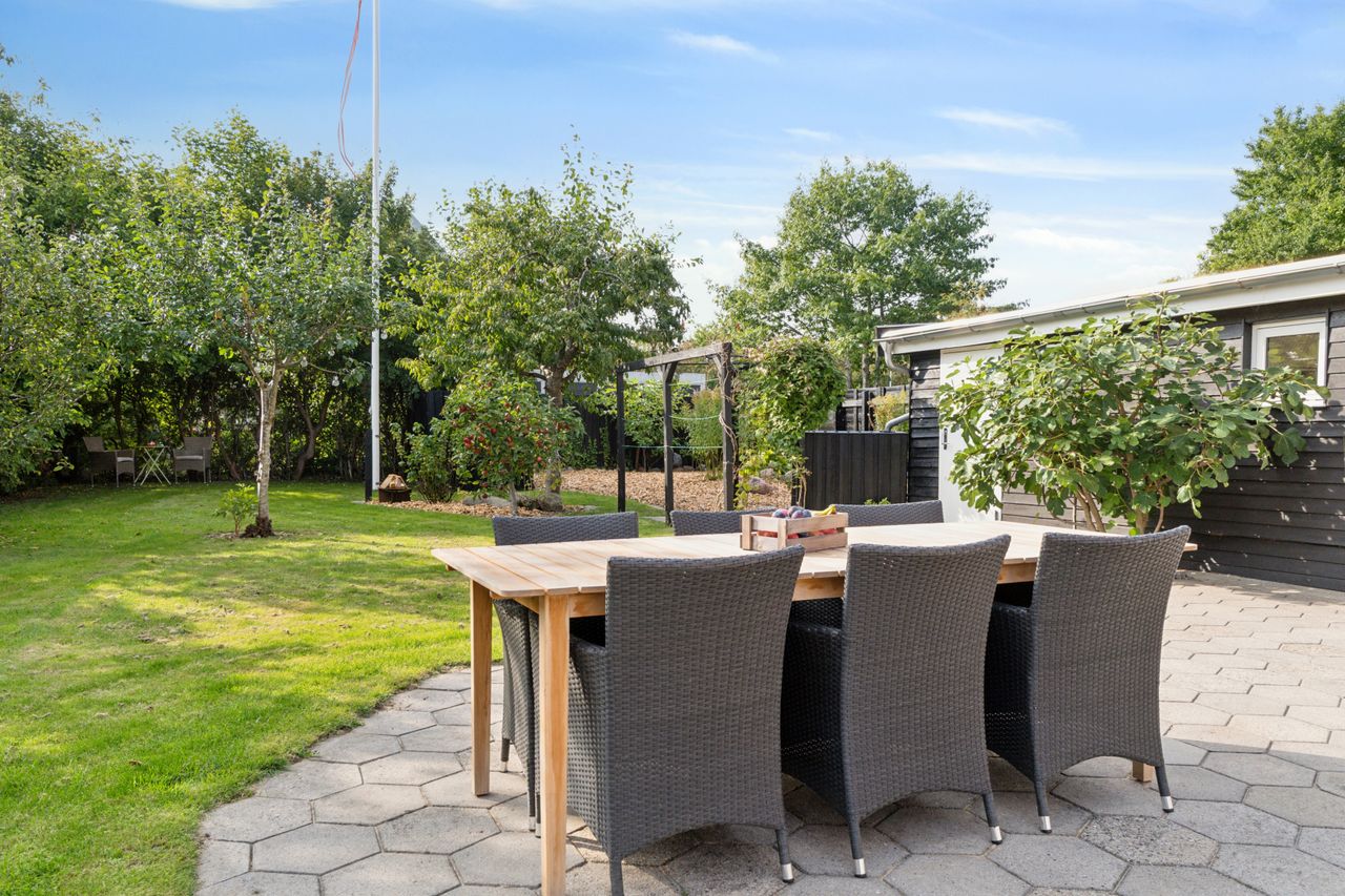 Udeområdet er ændret til stor lækker træterrasse med plads til hele familien og der er nyanlagt fliser, nye skæver samt ny sået græsplæne.