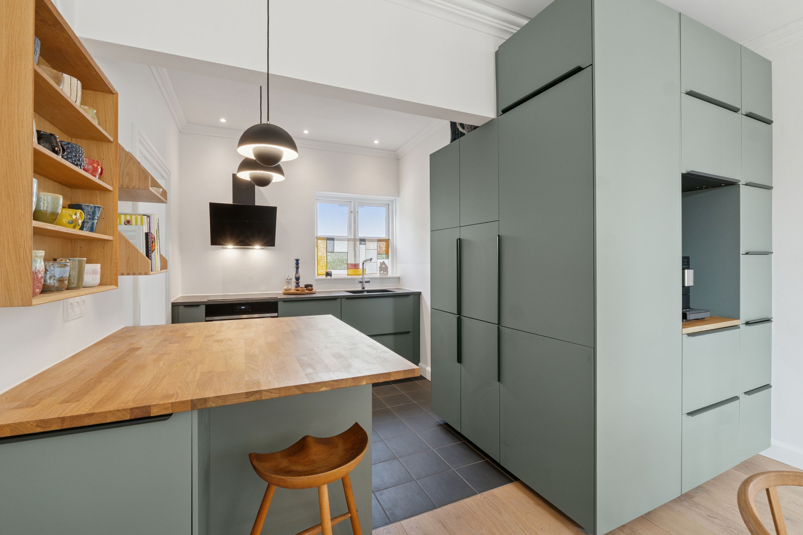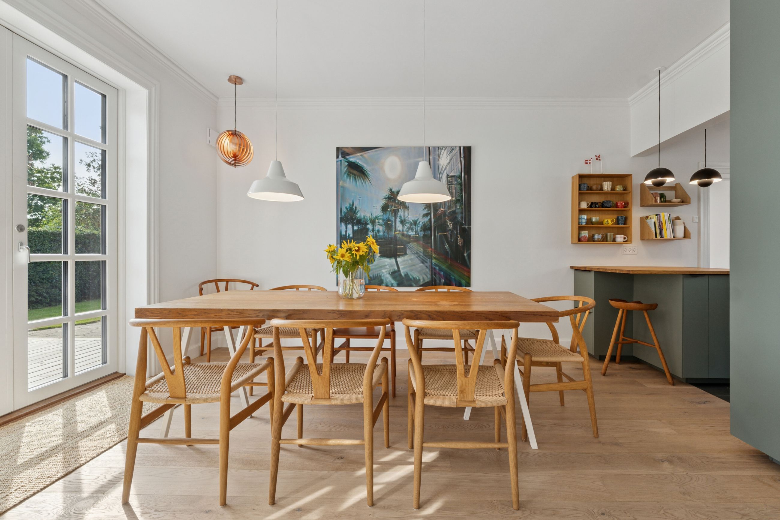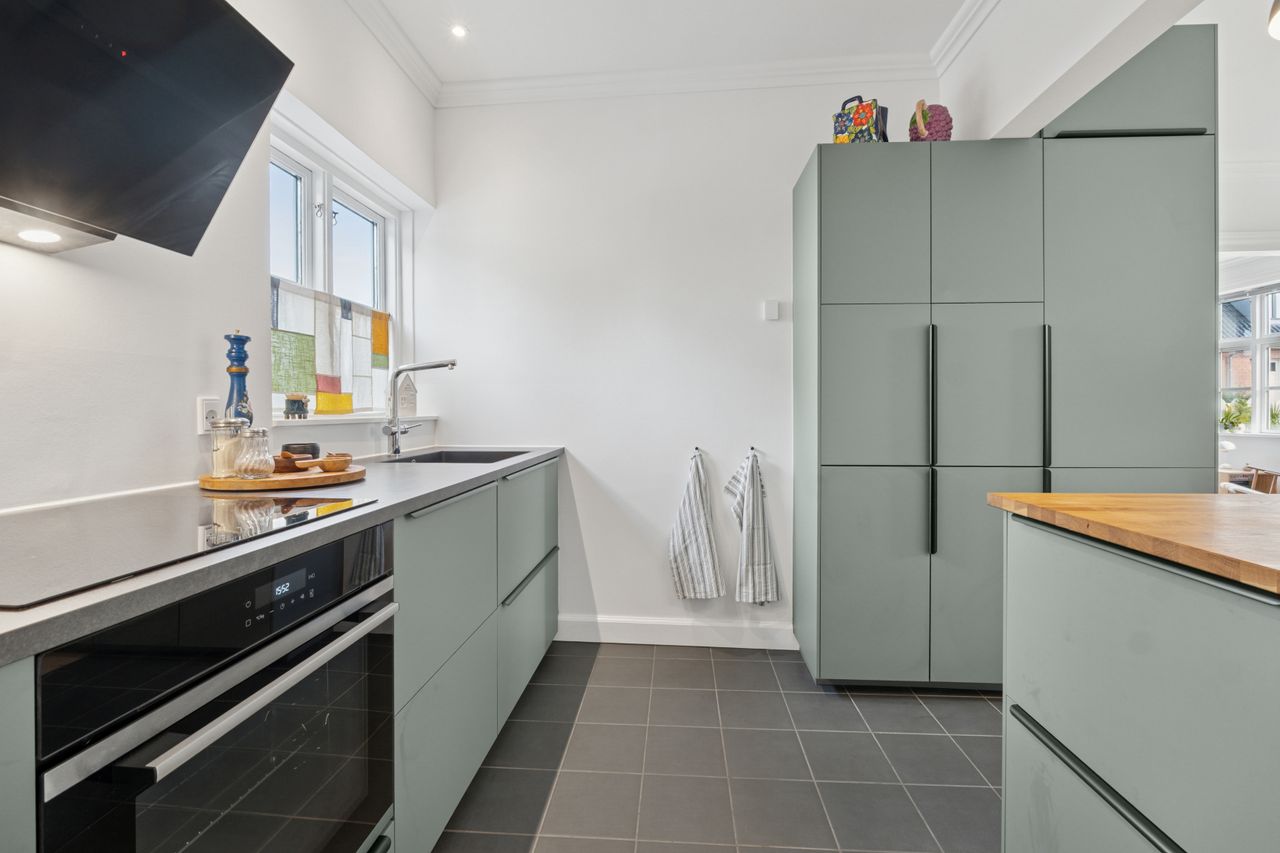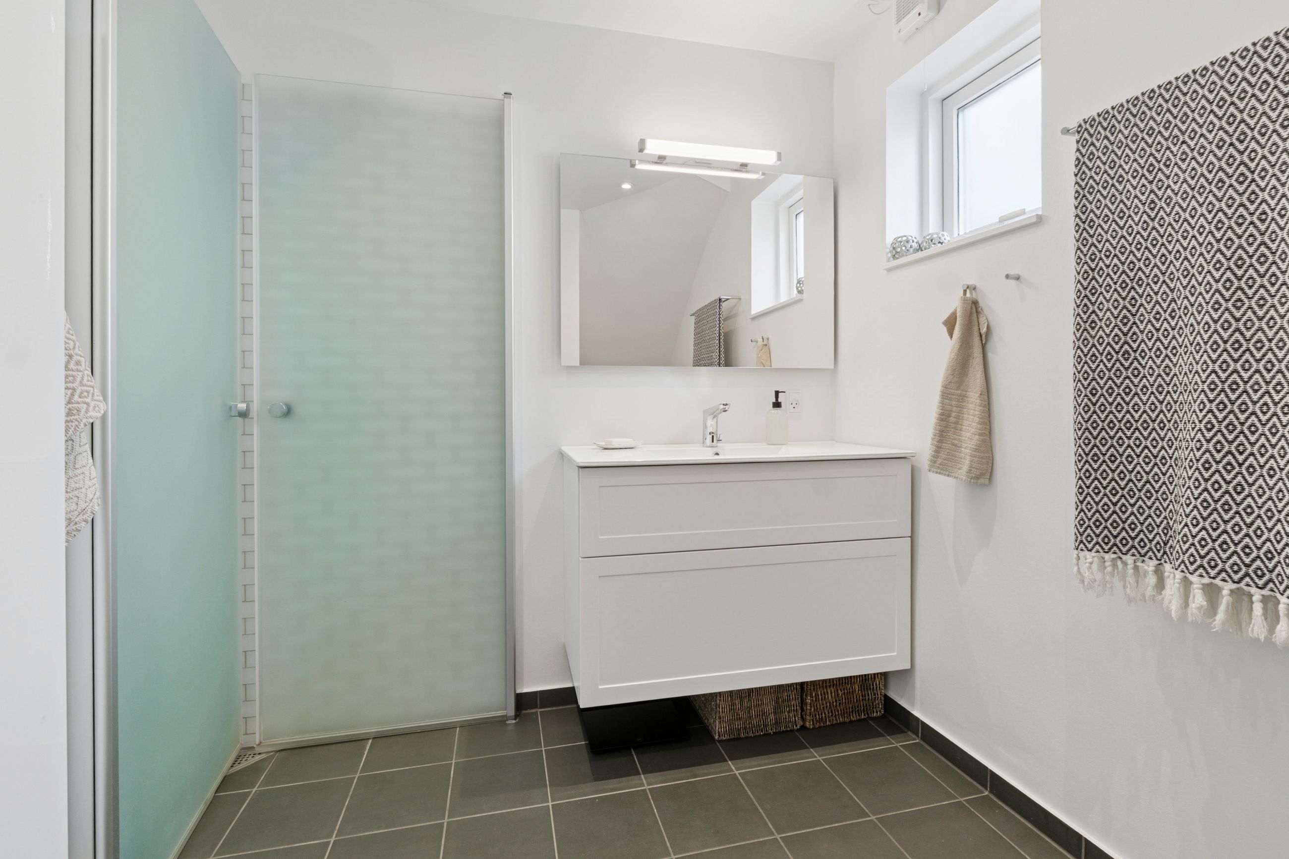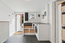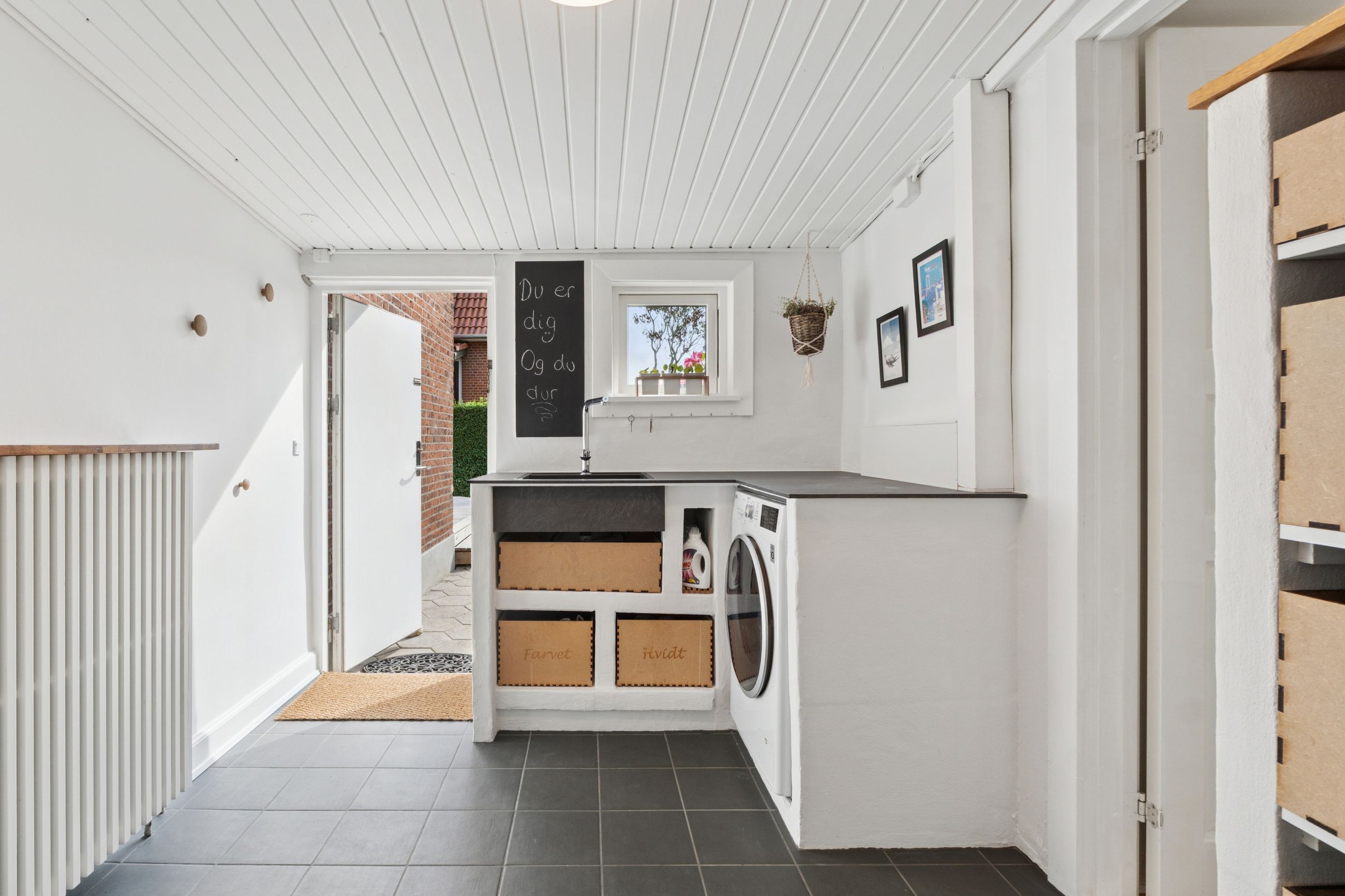 Køkkenet er moderniseret og veludstyret, og det praktiske bryggers giver ekstra opbevarings- og vaskefaciliteter. Der er desuden et moderne badeværelse i lyse materialer, strategisk placeret i boligens hjerte.
