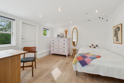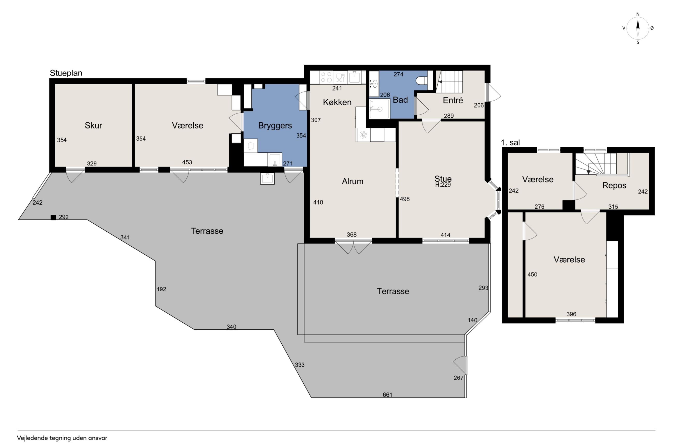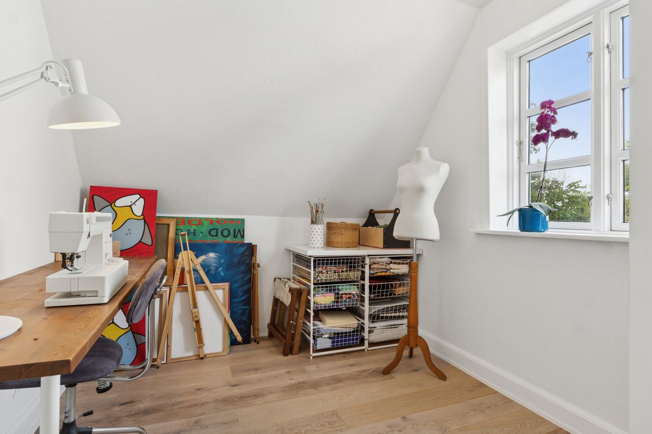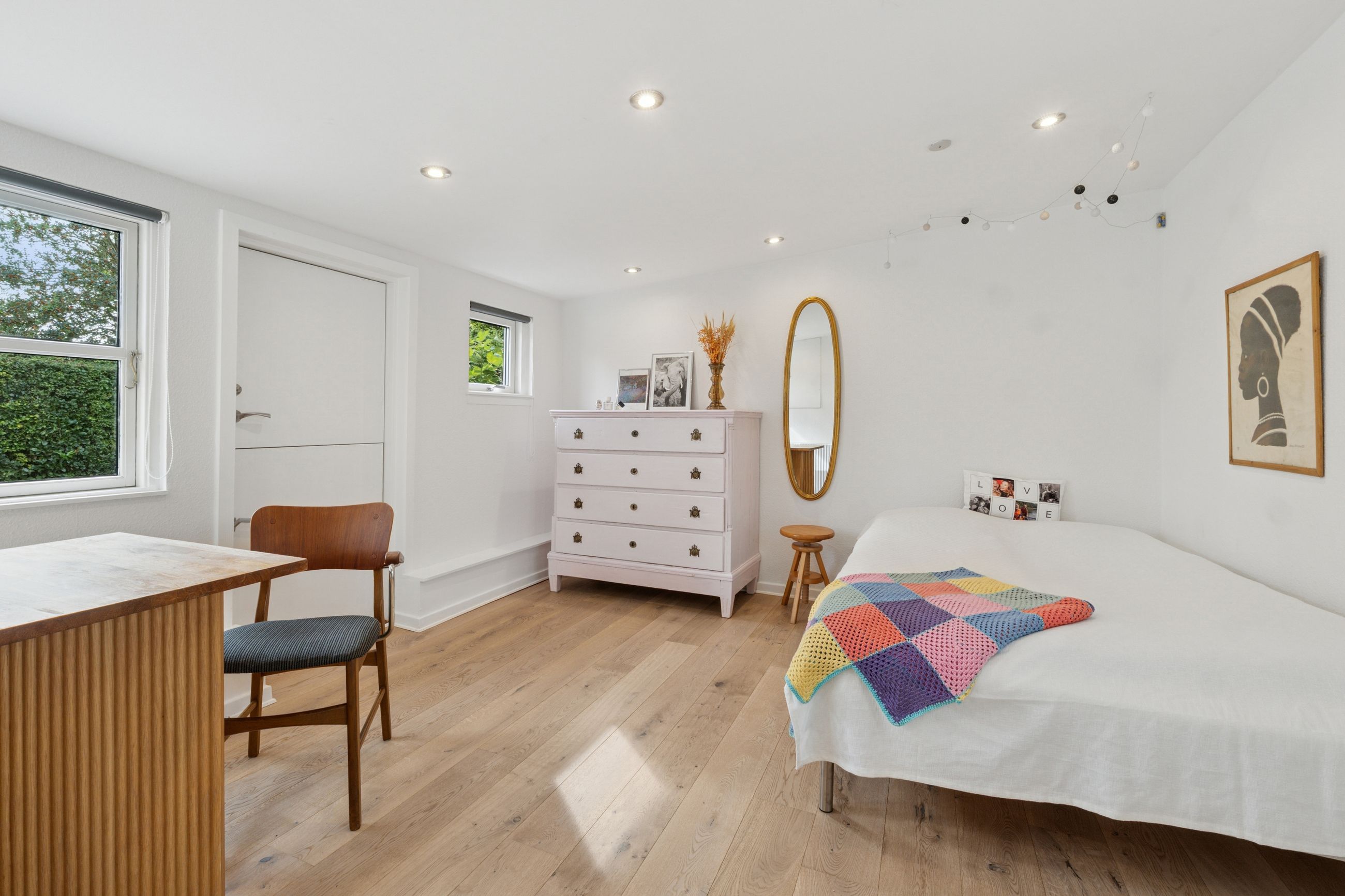 I stueplan finder du to værelser – ideelle til børn, gæster eller kontor – samt et praktisk skur med adgang udefra. På første sal er der endnu et stort værelse, et disponibelt rum og et repos, der kan anvendes fleksibelt, eksempelvis som kontor eller hobbyområde.