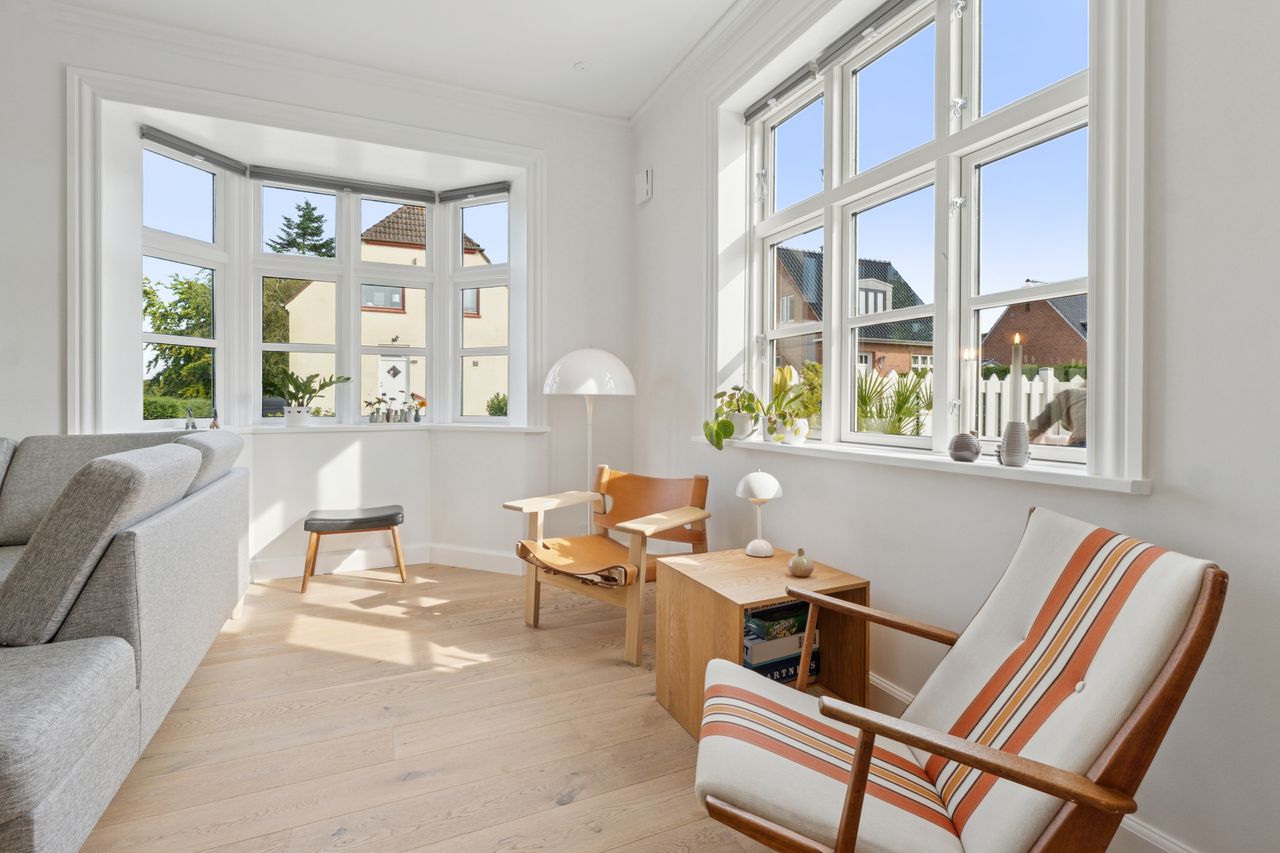 Indendørs mødes du af en stor entré, der fører videre til husets centrale opholdsrum – det lyse og åbne alrum i direkte forbindelse med både stue og køkken. Stuen har en hyggelig atmosfære med skøn lysindfald fra de store vinduespartier og udgang til en af husets to solrige terrasser.