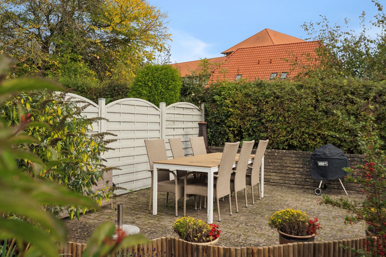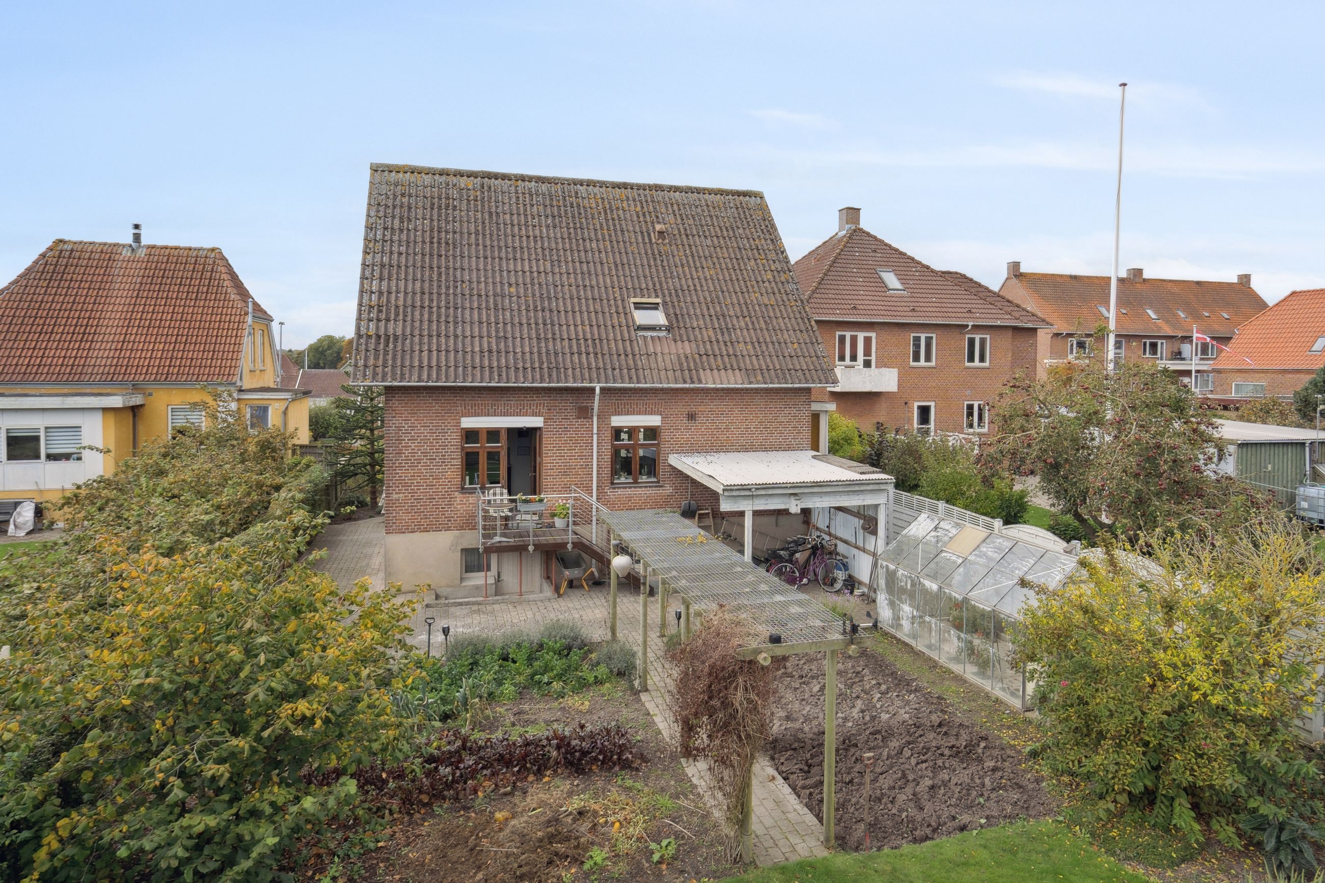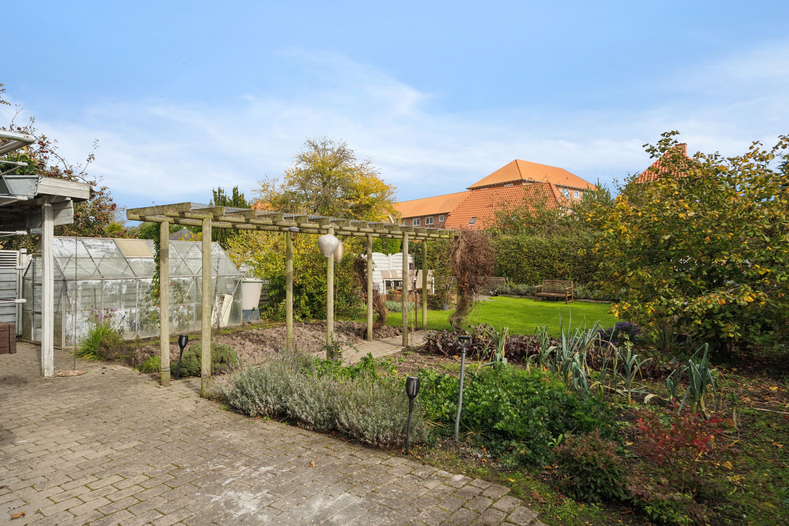 Haven fremstår med flere solterrasser og skøn køkkenhave til og man kan parkere bilen i tilhørende carport.