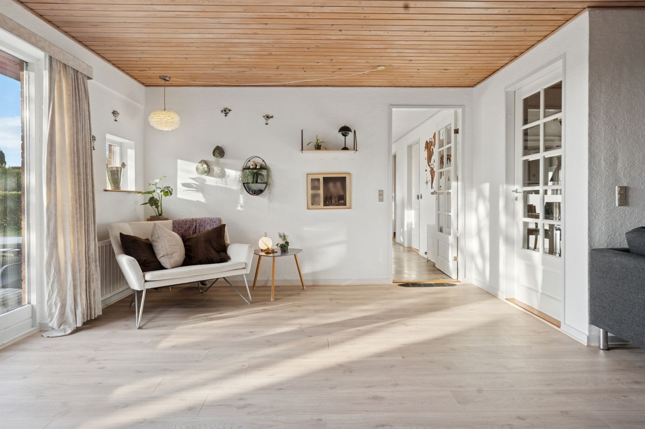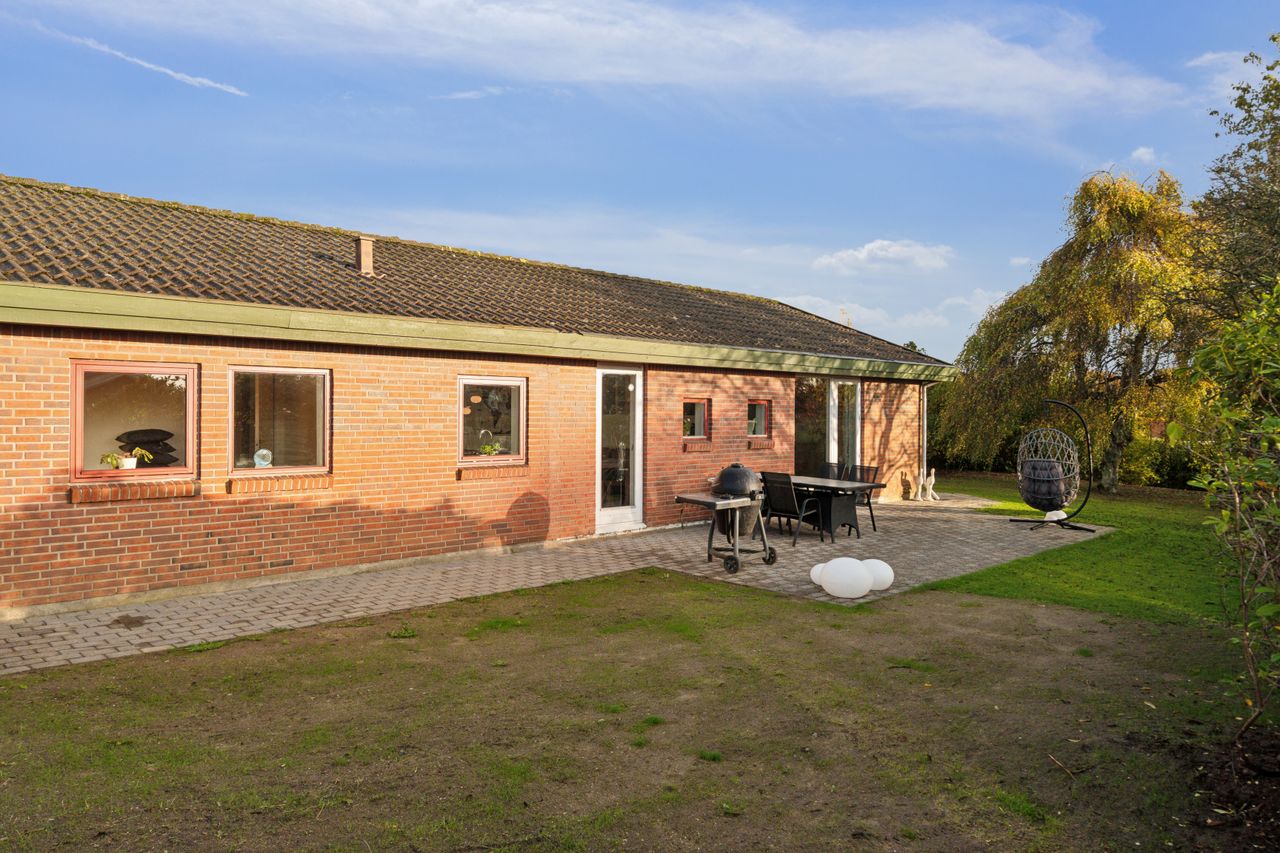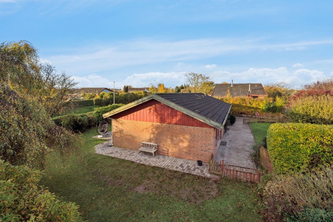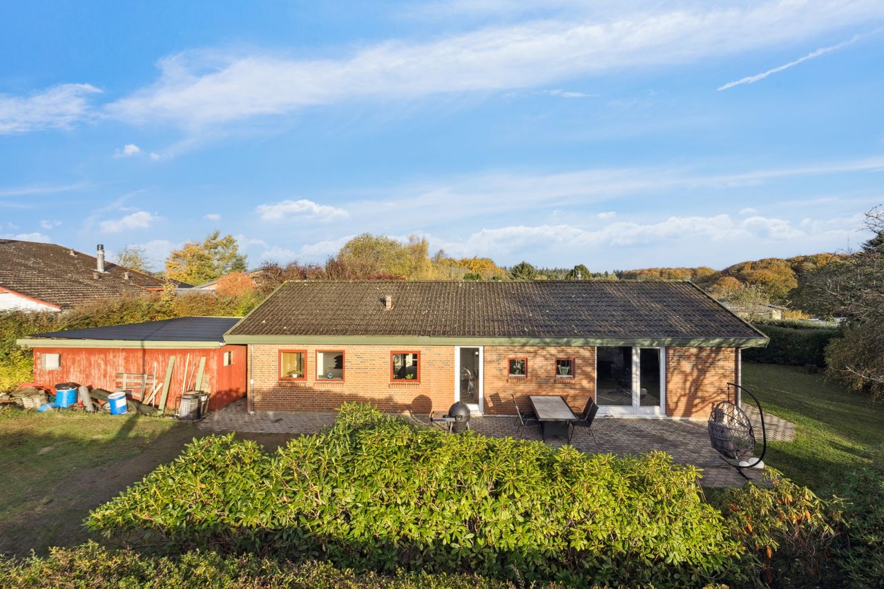 Her kan du bo helt centralt i Erritsø med kort afstand til Hannerup Skov, kun 10 minutters gang til strand og derfra videre hen til det hyggelige lystbådehavne-miljø, og fra boligen er der stisystemer til det meste. Der er gode handlemuligheder på Erritsø Butikstorv, mange aktiviteter i Erritsø Idrætscenter, hvor der bl.a. er svømmehal og padelbaner - og ikke mindst kort afstand til de to skoler i området samt daginstitutioner. På en lukket villavej, hvor der også herfra er adgang til stisystem rundt i området, er denne etplansvilla netop udbudt til salg. Boligen er et velindrettet Eurodan-hus med bl.a. børneafdeling, bestående af to værelser - et badeværelse med gulvvarme, klassisk køkkenalrum og en god vinkelstue med mulighed for at etablere ekstra værelse. Endvidere er der soveværelse med skabsvæg, praktisk bryggers samt en entré, som i dag bruges til kontor. Derudover er der et stort carport-anlæg med tilhørende udhus, en dejlig nem anlagt have med flere gode terrasser.