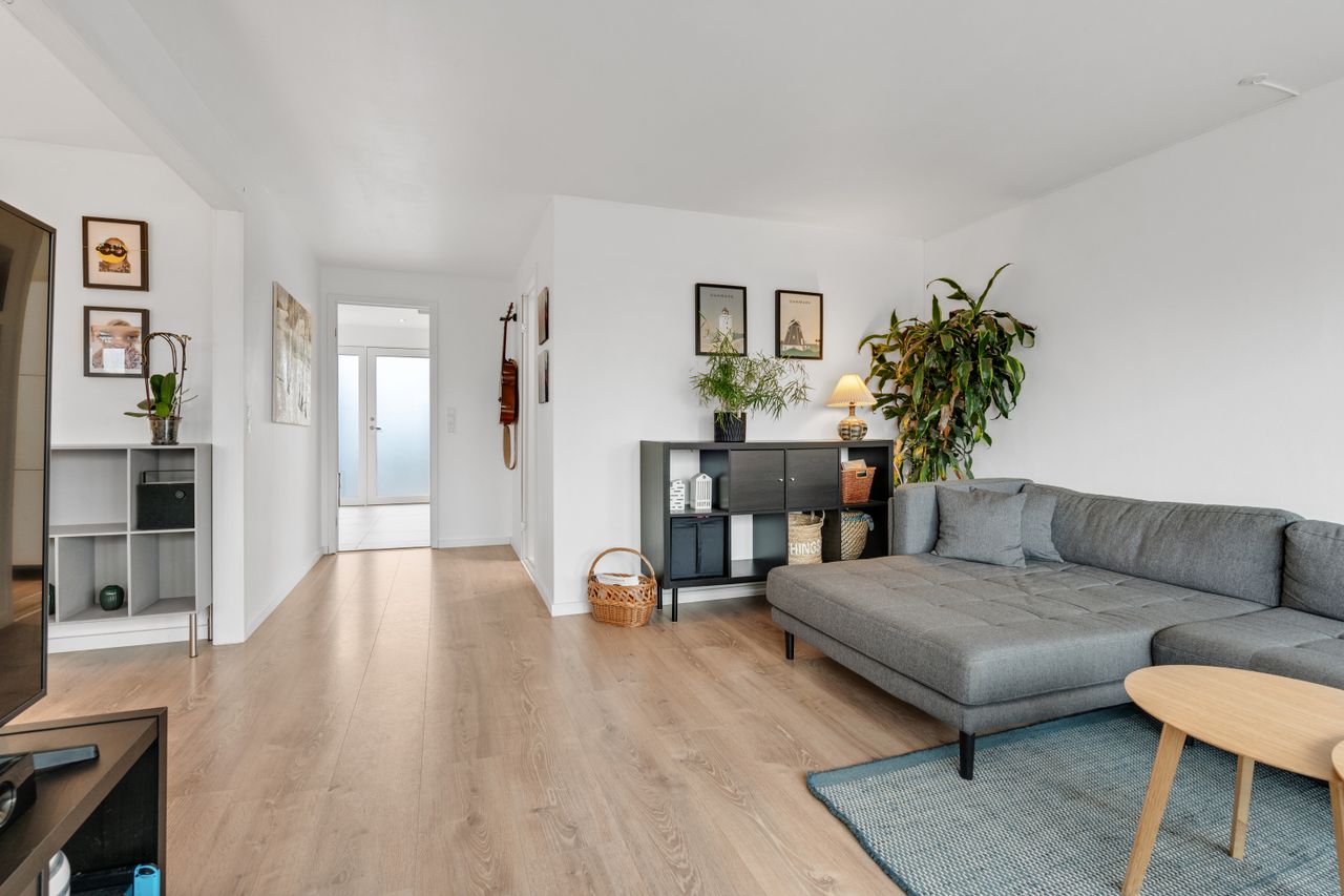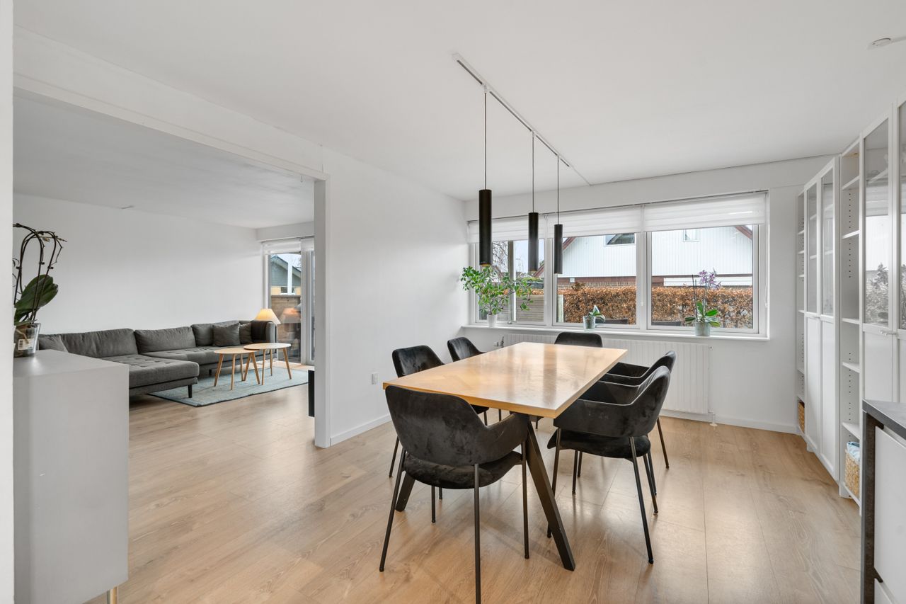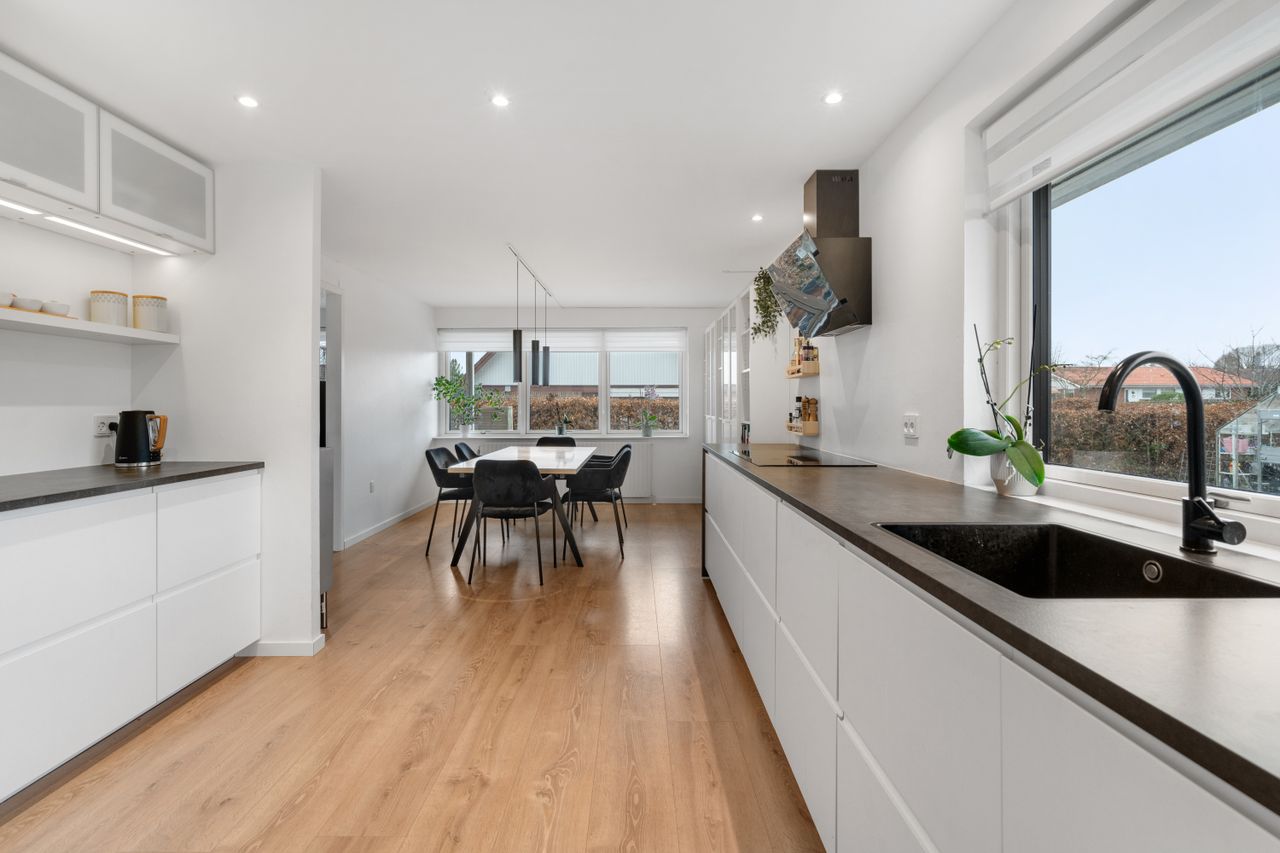 Boligen byder på en gennemtænkt og funktionel planløsning. Husets naturlige samlingspunkt er det åbne og lyse køkken/alrum, som ligger i direkte forbindelse med stuen. Her er god plads til både hverdagsliv og gæster, og de store vinduespartier sikrer et dejligt lysindfald.