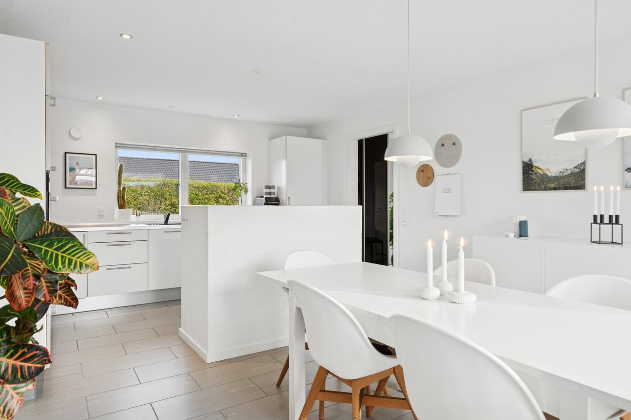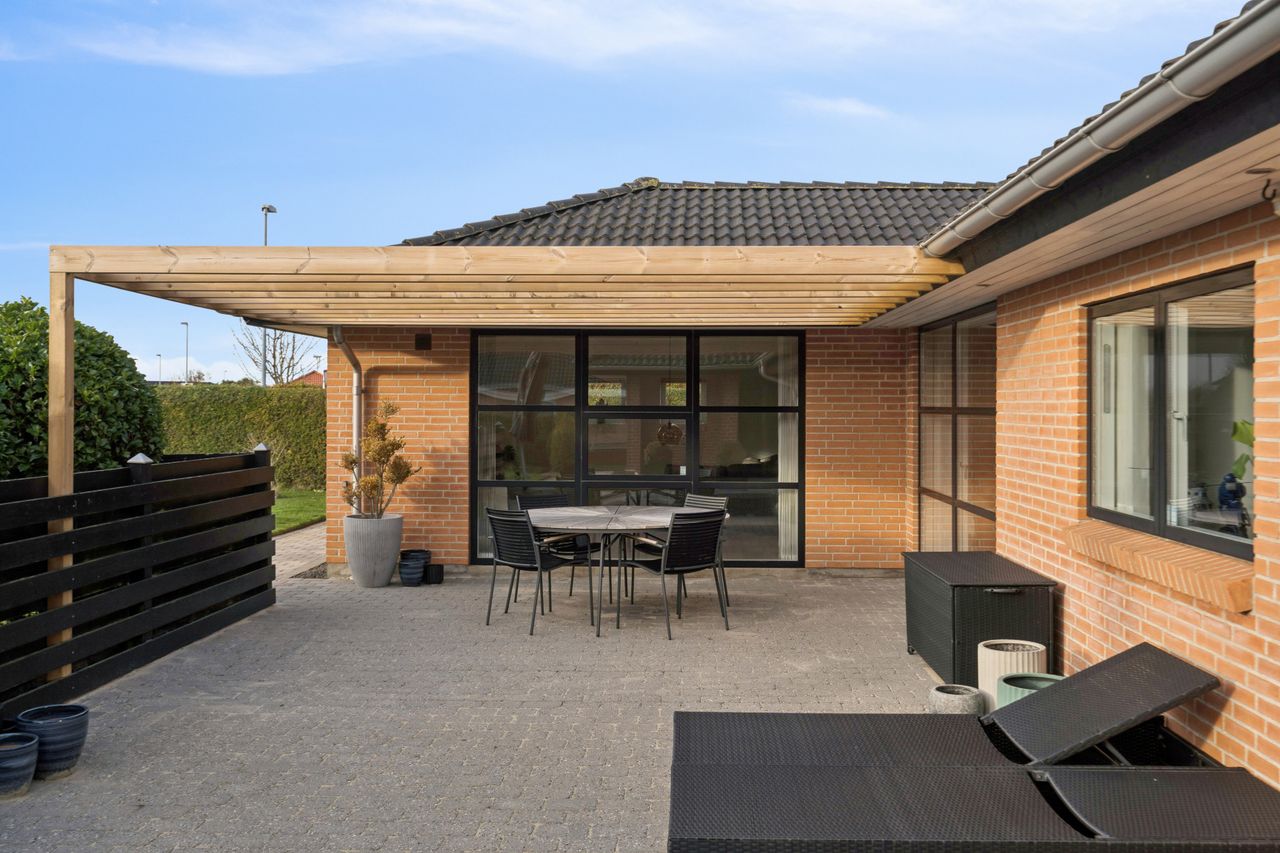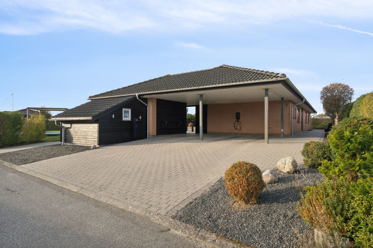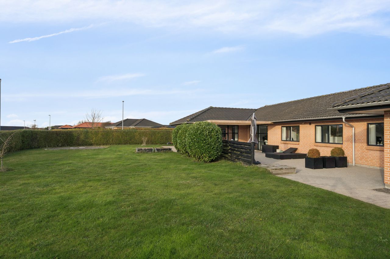Det er et hus med mange kvaliteter, der venter de nye ejere af denne flotte og velholdte bolig beliggende på lukket vænge i en nyere udstykning i Vestbyen af Fredericia. Bliver det jer, kan I se frem til en villa opført i 2007 med et samlet bebygget areal på hele 207 m2, der ikke bare fremstår indflytningsklar med flot finish og god plads, men som prikken over iét har villaen adresse i et attraktivt kvarter, hvor børnene får de bedste rammer om opvæksten. Der er tale om et rigtigt børnevenligt område, gode fælles arealer og endvidere ligger man tæt på infrastruktur, indkøb, skoler, daginstitution, golfbanen samt ca. 6 minutters kørsel til Fredericia Centrum. Villaen fremstår logisk indrettet, hvilket giver en god sammenhæng imellem opholdsrum og værelser og har med sine 4 værelser og 2 badeværelser en opdeling af børneafdeling, centrale opholdsrum og forældreafdeling. Der kan yderligere nævnes, at der er gulvvarme i hele huset. Villaen indeholder: Stor entre i tilknytning til bryggerset med vaskefaciliteter og håndvask samt flere skabe til opmagasinering. I forlængelse af bryggerset ligger det ene af to badeværelser i tilknytning til børneafdelingen med sine 3 værelser, hvoraf det ene værelse i dag anvendes til kontor. Centralt placeret køkken/alrum med udgang til sydvendt terrasse, med plads til hele familien. Køkkenet fremstår pænt og velholdt og sammen med alrummet udgør det hjerterummet i huset. Soveværelset støder op til alrummet og her får man sit eget badeværelse med både bruseniche og karbad. Alrummet ligger i åben forbindelse til stuen. Nem have med minimal vedligeholdelse da haven ses opført primært med græsplæne. Endvidere er der tilhørende integreret carport samt 2 rummelige udehuse og til sidst men ikke mindst får man flisebelægning rundt om hele huset. Skulle ovenstående have vakt din nysgerrighed, så kontakt din lokale Realmæglerne Boligbutikken Fredericia på tlf.nr. 88 44 20 70 for en fremvisning af denne skønne bolig.
