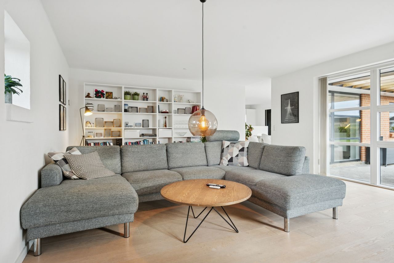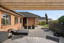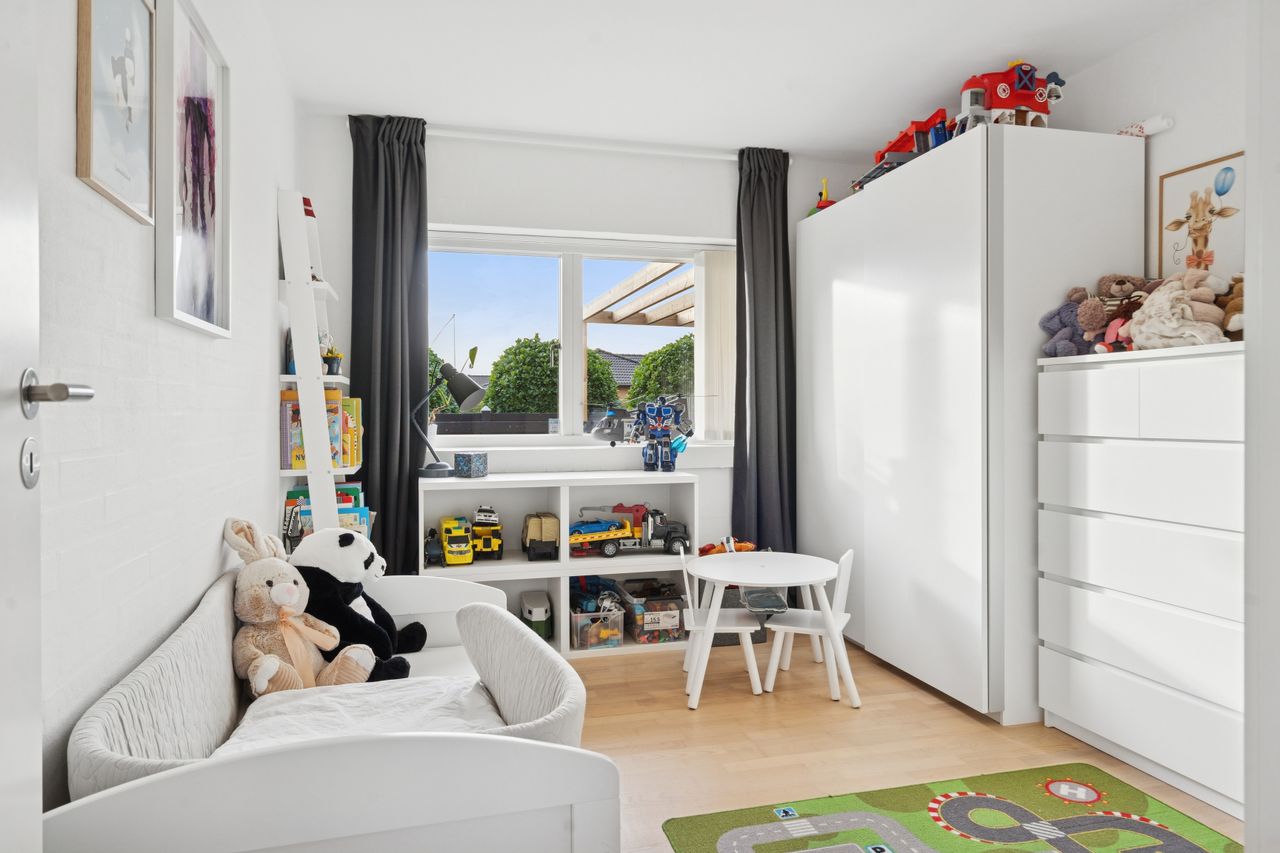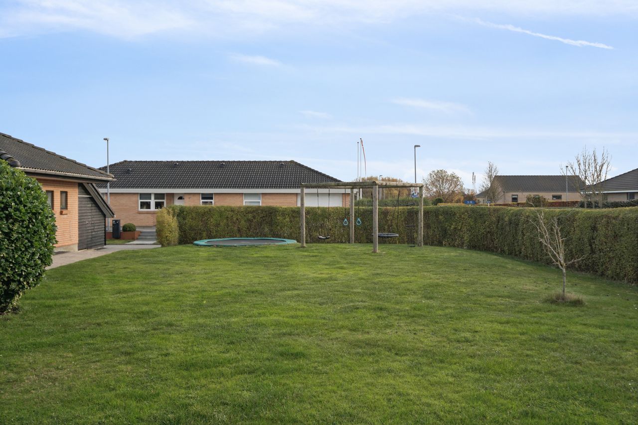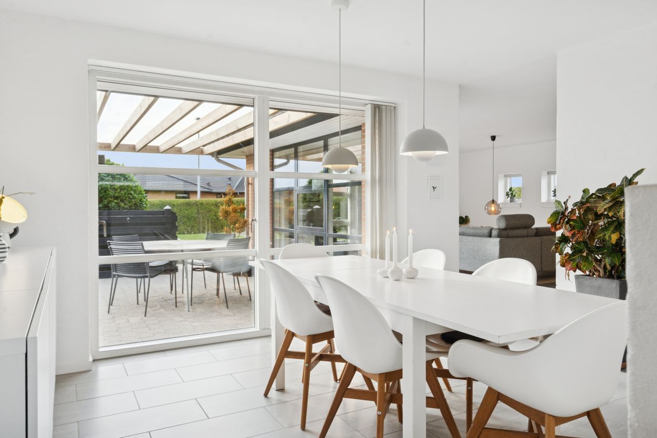 Det er et hus med mange kvaliteter, der venter de nye ejere af denne flotte og velholdte bolig beliggende på lukket vænge i en nyere udstykning i Vestbyen af Fredericia. Bliver det jer, kan I se frem til en villa opført i 2007 med et samlet bebygget areal på hele 207 m2, der ikke bare fremstår indflytningsklar med flot finish og god plads, men som prikken over iét har villaen adresse i et attraktivt kvarter, hvor børnene får de bedste rammer om opvæksten. Der er tale om et rigtigt børnevenligt område, gode fælles arealer og endvidere ligger man tæt på infrastruktur, indkøb, skoler, daginstitution, golfbanen samt ca. 6 minutters kørsel til Fredericia Centrum. Villaen fremstår logisk indrettet, hvilket giver en god sammenhæng imellem opholdsrum og værelser og har med sine 4 værelser og 2 badeværelser en opdeling af børneafdeling, centrale opholdsrum og forældreafdeling. Der kan yderligere nævnes, at der er gulvvarme i hele huset. Villaen indeholder: Stor entre i tilknytning til bryggerset med vaskefaciliteter og håndvask samt flere skabe til opmagasinering. I forlængelse af bryggerset ligger det ene af to badeværelser i tilknytning til børneafdelingen med sine 3 værelser, hvoraf det ene værelse i dag anvendes til kontor. Centralt placeret køkken/alrum med udgang til sydvendt terrasse, med plads til hele familien. Køkkenet fremstår pænt og velholdt og sammen med alrummet udgør det hjerterummet i huset. Soveværelset støder op til alrummet og her får man sit eget badeværelse med både bruseniche og karbad. Alrummet ligger i åben forbindelse til stuen. Nem have med minimal vedligeholdelse da haven ses opført primært med græsplæne. Endvidere er der tilhørende integreret carport samt 2 rummelige udehuse og til sidst men ikke mindst får man flisebelægning rundt om hele huset. Skulle ovenstående have vakt din nysgerrighed, så kontakt din lokale Realmæglerne Boligbutikken Fredericia på tlf.nr. 88 44 20 70 for en fremvisning af denne skønne bolig.