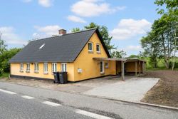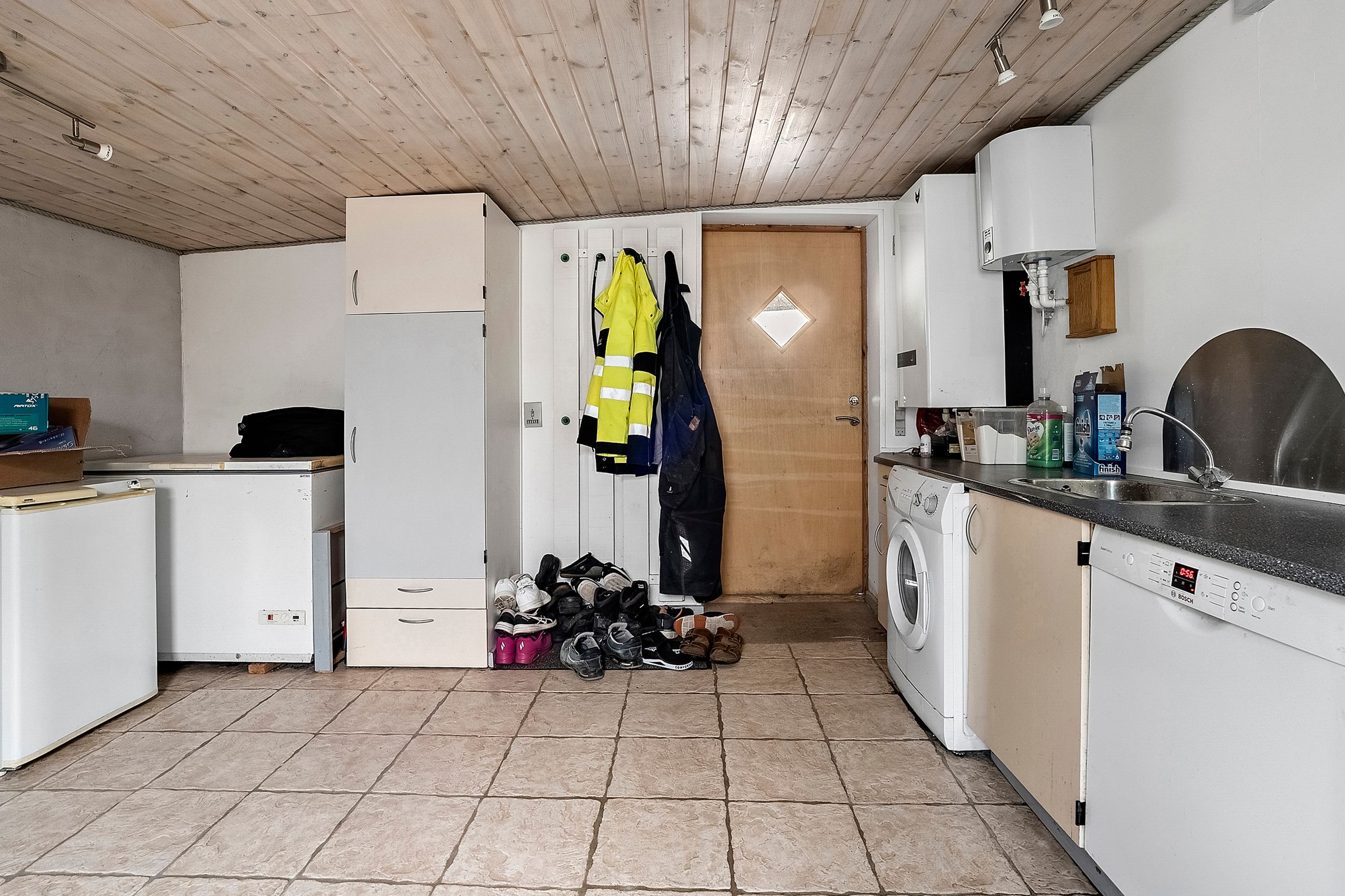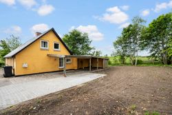 Huset fremstår velholdt med skiftet tag fra 2017/2018 og en praktisk carport, hvorfra man kan gå tørskoet ind i huset via entré/bryggers – et praktisk rum med plads til vaskefaciliteter og opbevaring.
