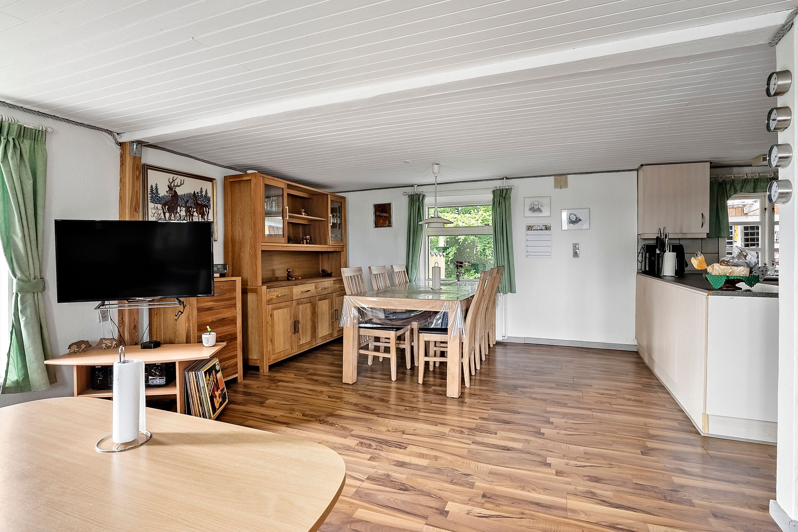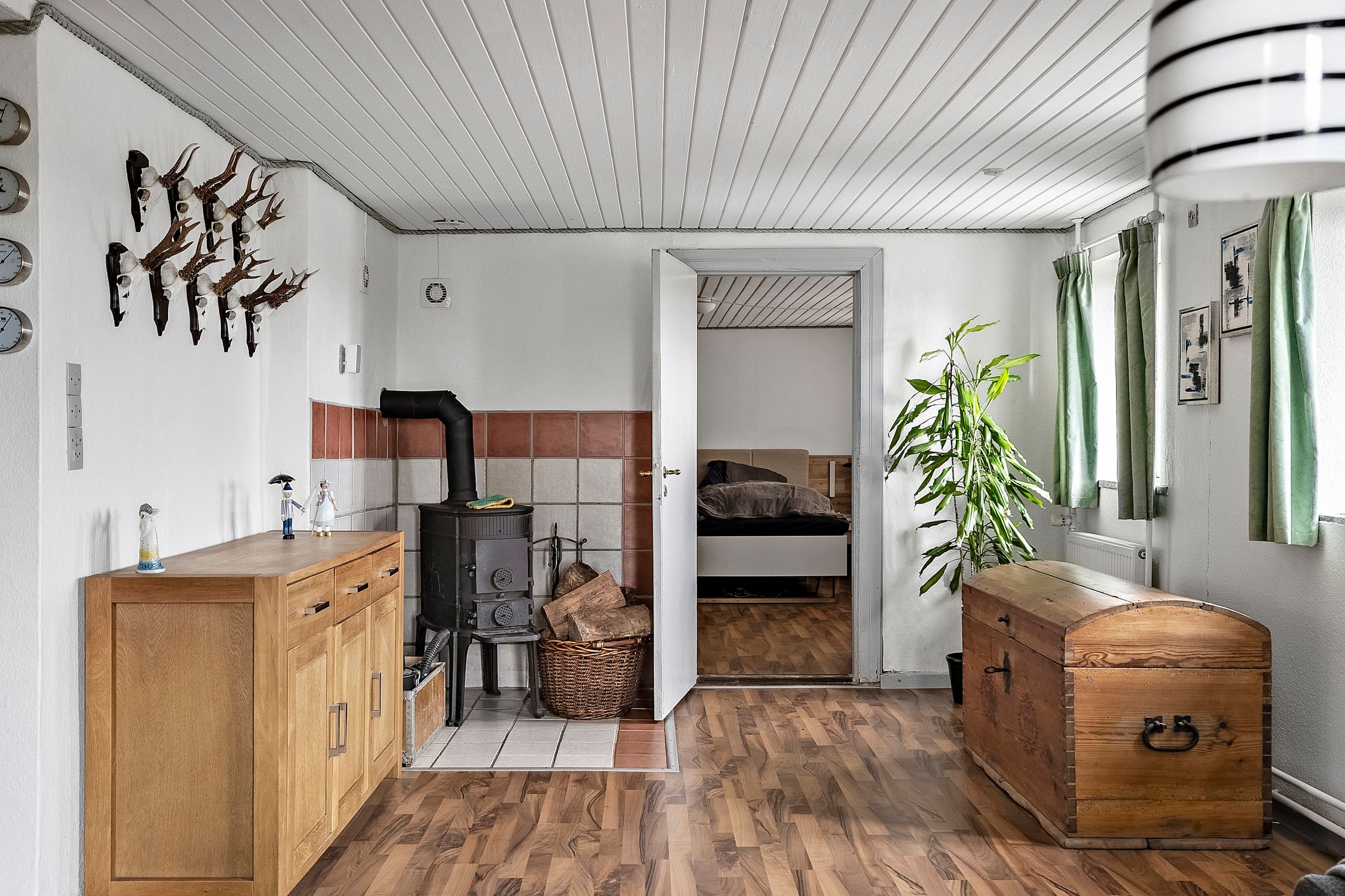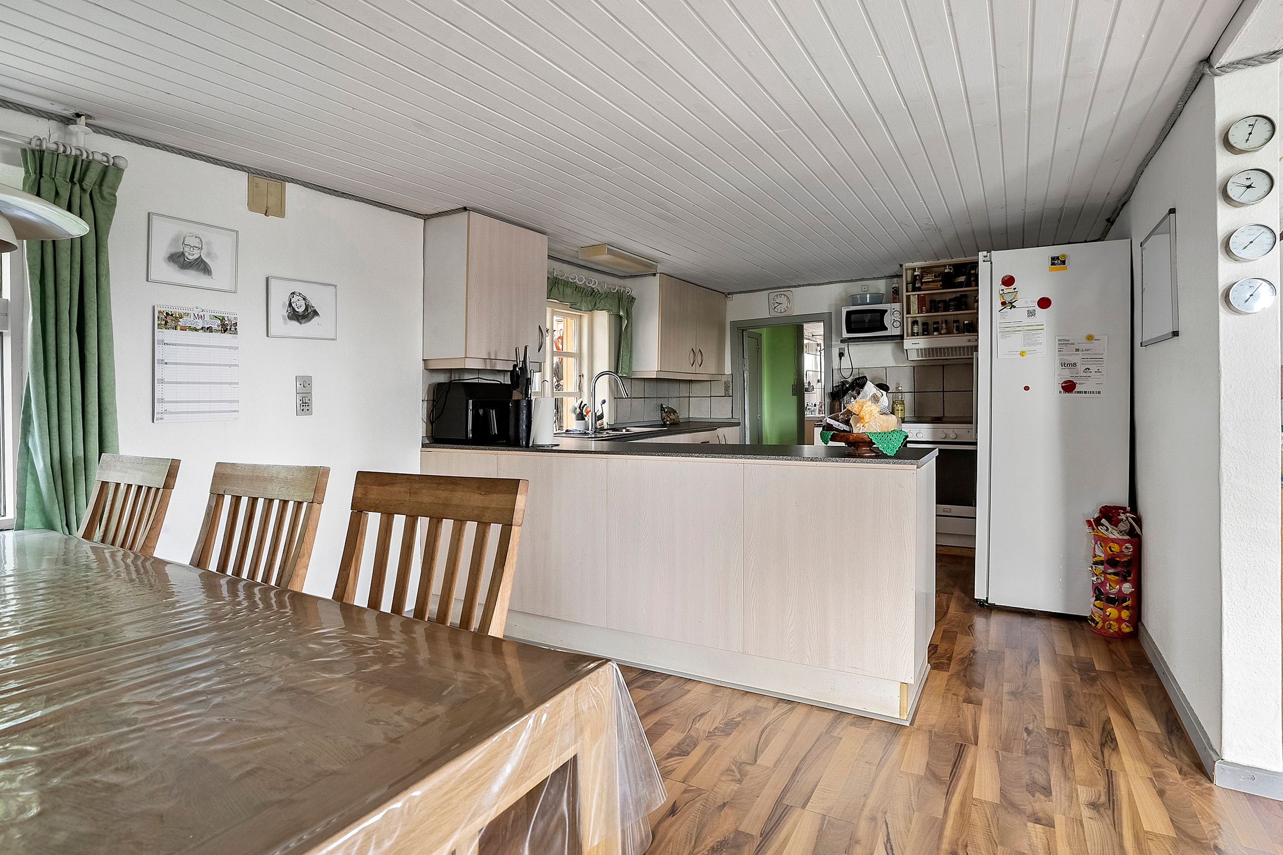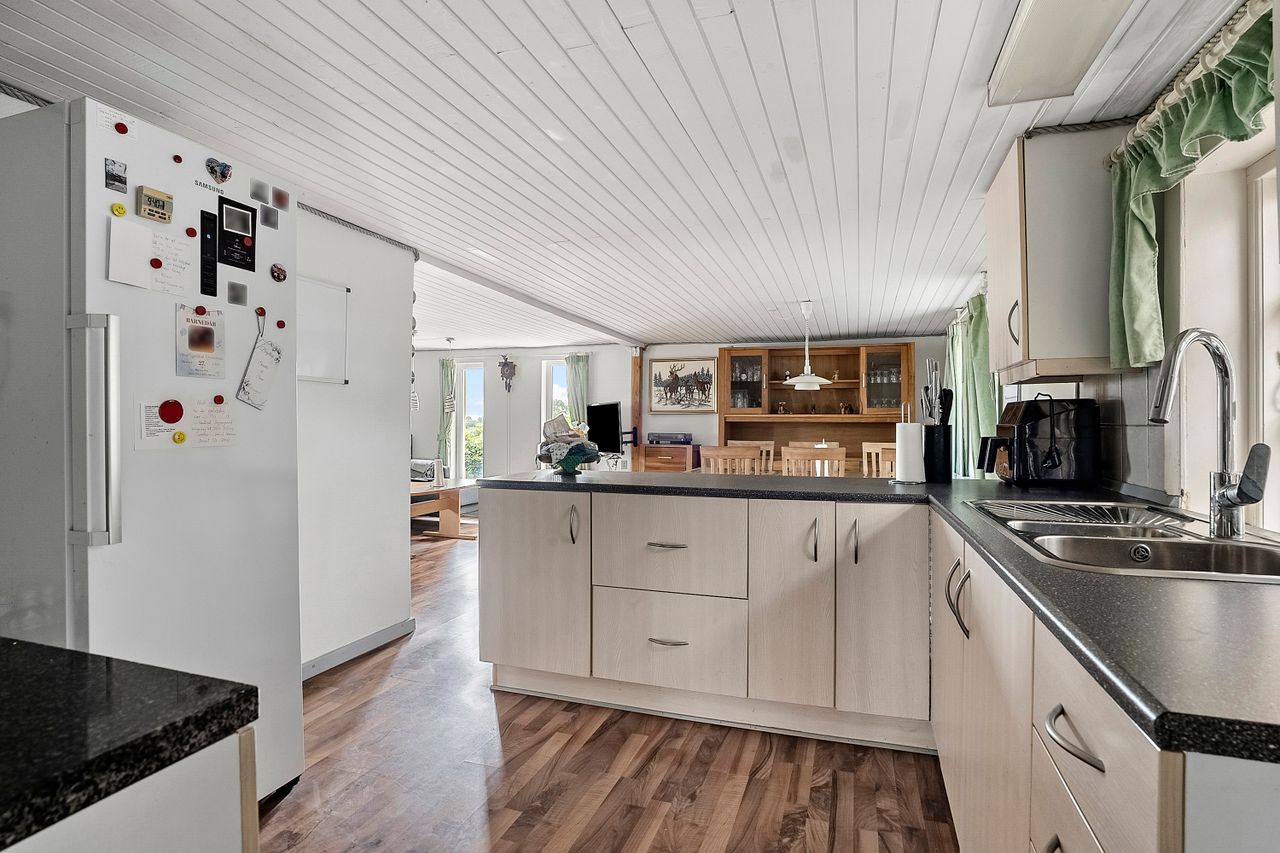 Hjemmets hjerte er det rummelige køkken-alrum, der fungerer som samlingspunkt for både hverdag og gæster. Her er god plads til spisebord og fælles aktiviteter, og det ligger i åben forbindelse med en hyggelig stue med brændeovn og plads til sofa og tv-hjørne.