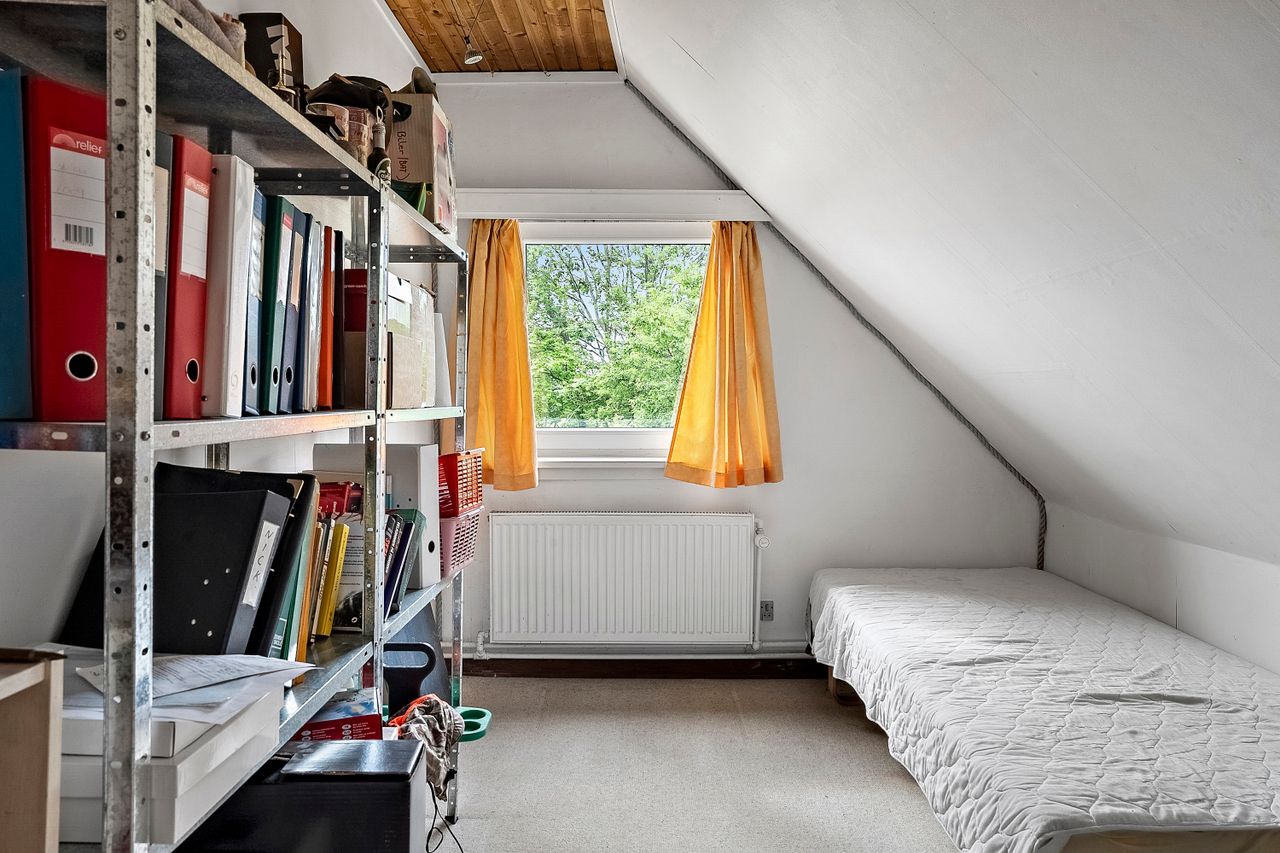 Stueplan byder desuden på et soveværelse, et ekstra værelse (i dag indrettet som garderoberum), samt et funktionelt badeværelse.