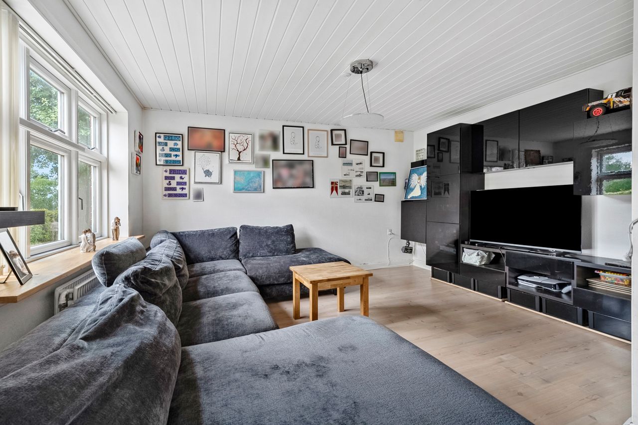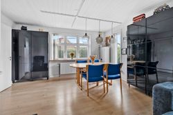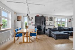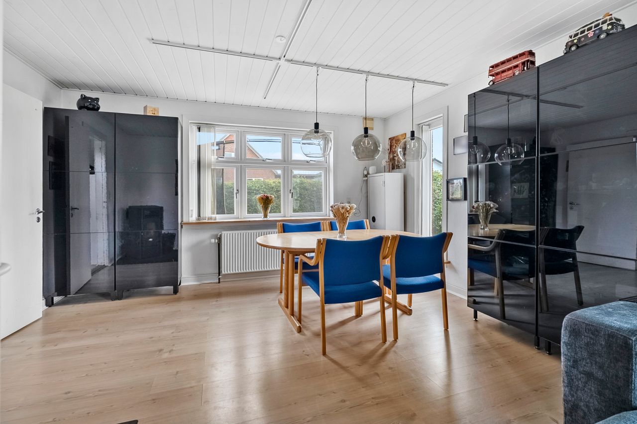 Stuen er en fryd for sanserne, hvor den hyggelige brændeovn fungerer som det naturlige samlingspunkt. I vinterhalvåret spreder den varme ild sig over rummet og skaber en indbydende atmosfære, som gør det til det perfekte sted at slappe af med en god bog eller tilbringe tid sammen med dem, du holder af. De store vinduer giver masser af naturligt lys, der fylder rummet med varme og liv, og skaber en behagelig overgang mellem det indre og de smukke udendørs områder.