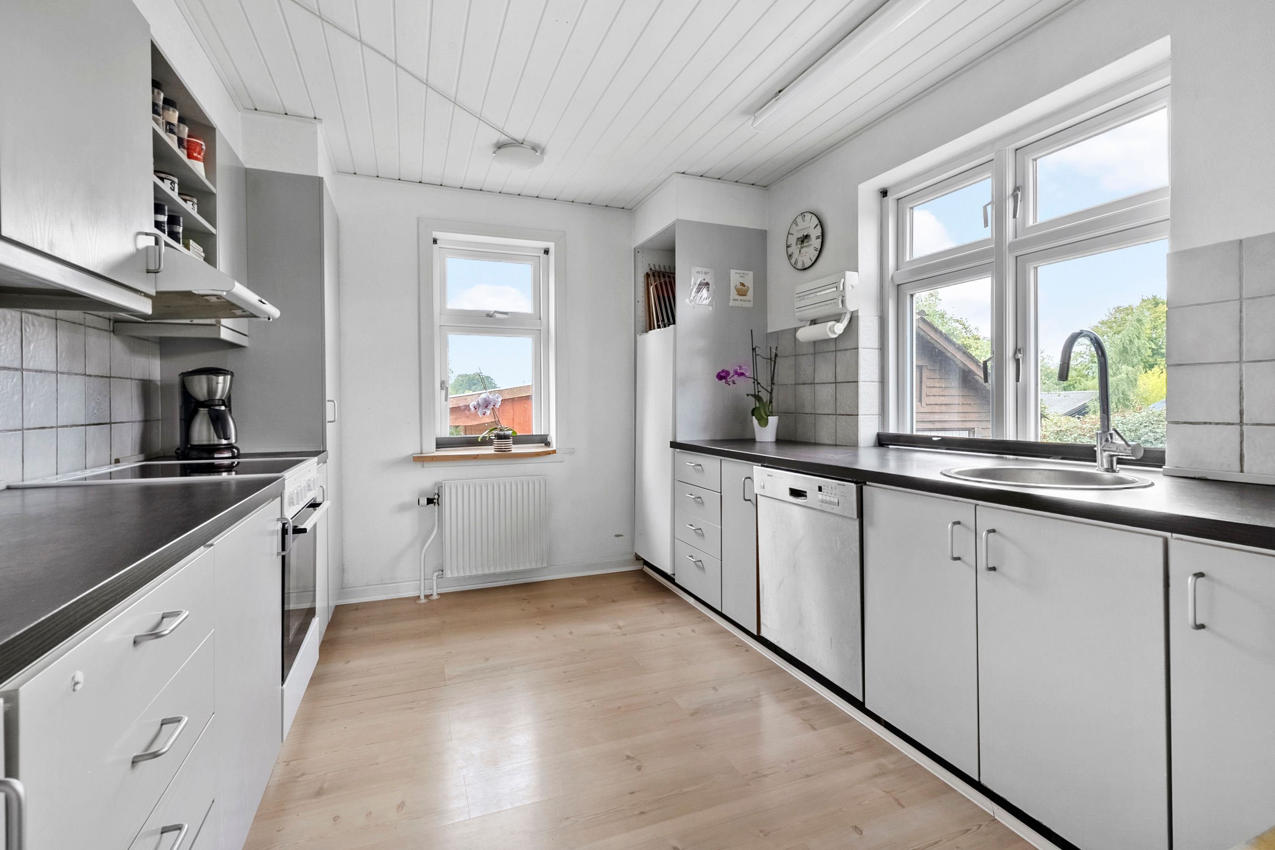 Indenfor bydes du velkommen i et lyst og rummeligt køkken med inventar i grålige toner. Køkkenet er funktionelt og med plads til at hygge omkring madlavningen.