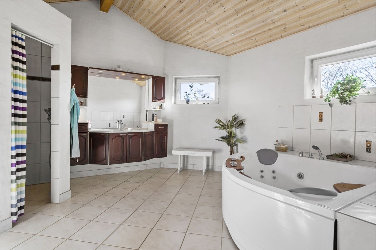 Det imponerende badeværelse er en oase for velvære med sin generøse pladsudnyttelse. Her kan man nyde både et afslappende spabad og en praktisk bruseniche under loftets smukke kipkonstruktioner. Desuden rummer ejendommen et bryggers/vaskerum med egen indgang – ideelt for familiens praktiske gøremål.