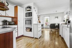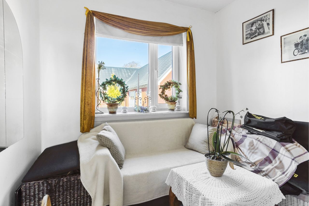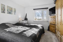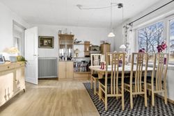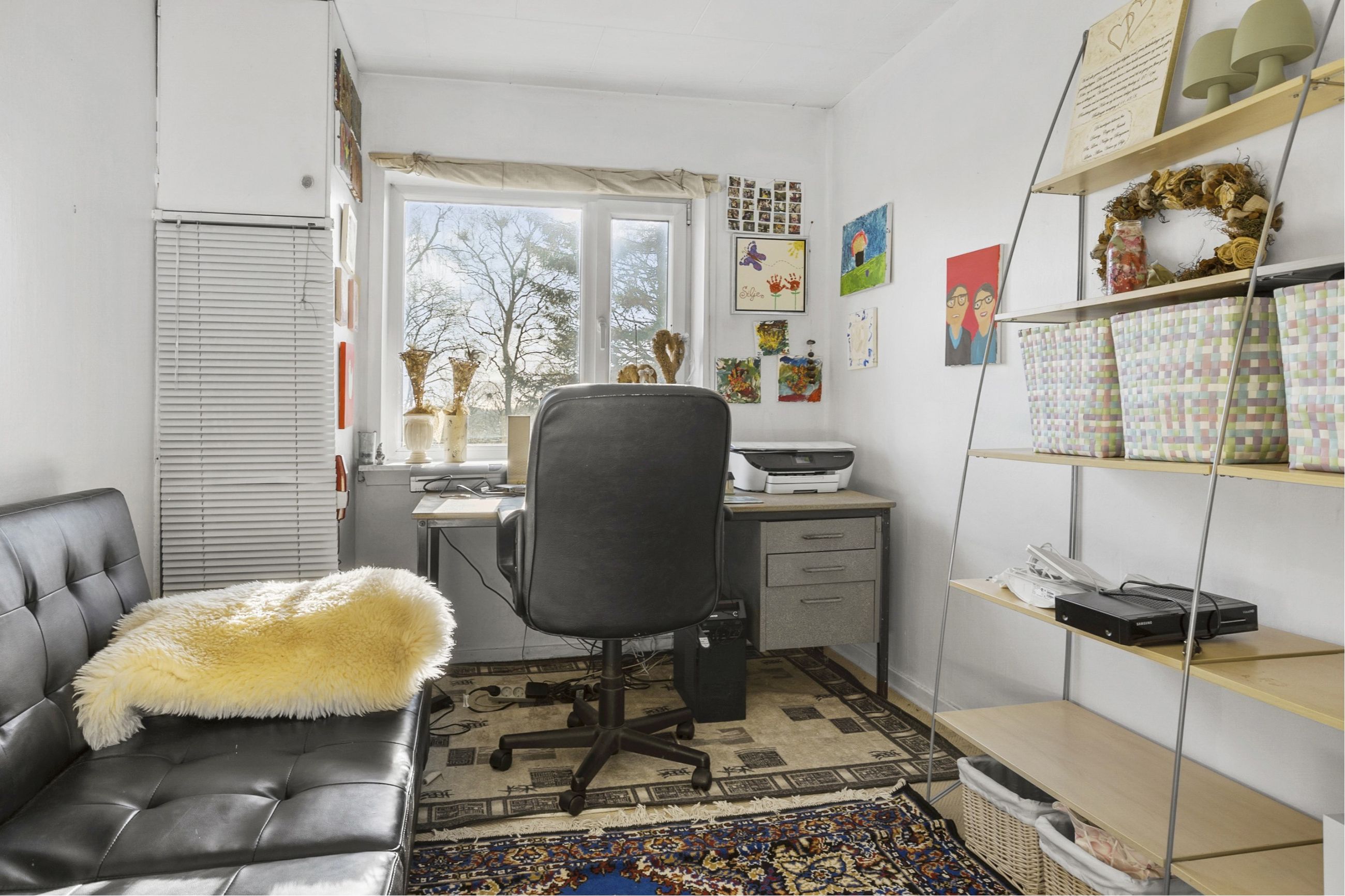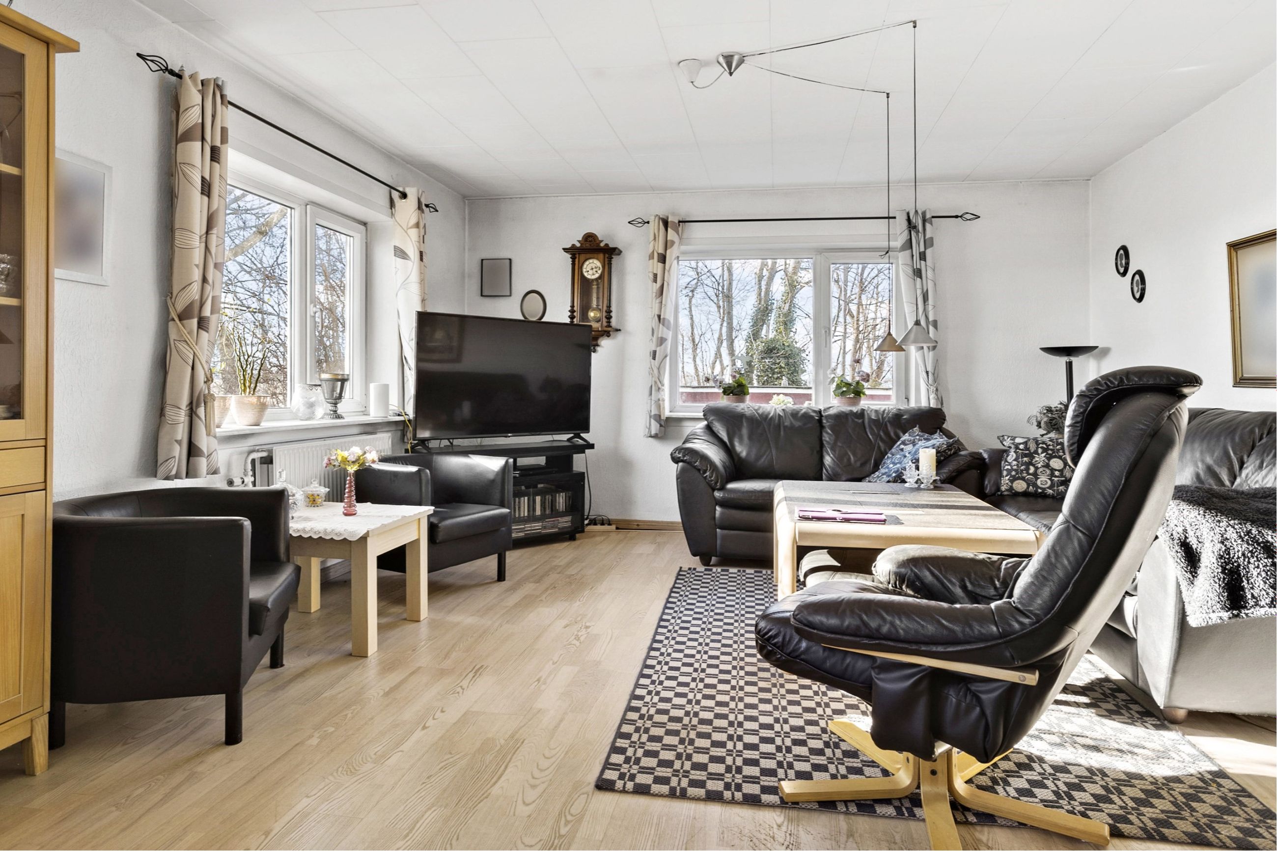 Opholdsstuen er lys og imødekommende takket være de store vinduespartier, der lader dagslyset strømme ind og skaber en behagelig atmosfære. I forlængelse af opholdsstuen finder man spisestuen, som tilbyder rigeligt med plads til både hverdagens måltider og festlige sammenkomster. Værelsesafdelingen består af et soveværelse samt to ekstra værelser, der kan anvendes efter behov – hvad enten det er som børneværelser, kontor eller gæsteværelser.