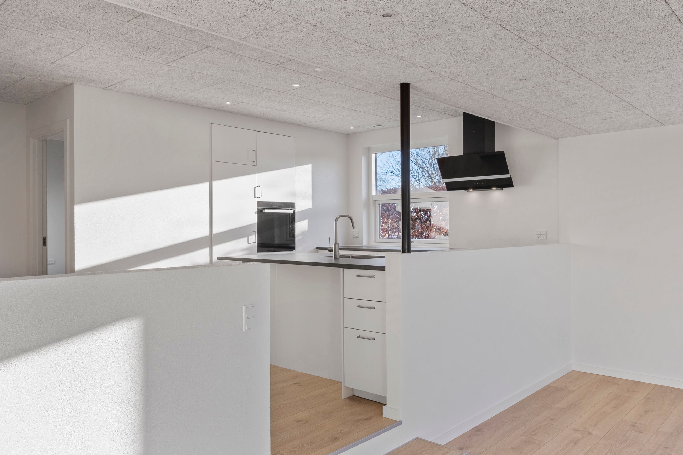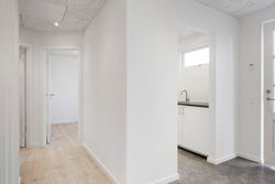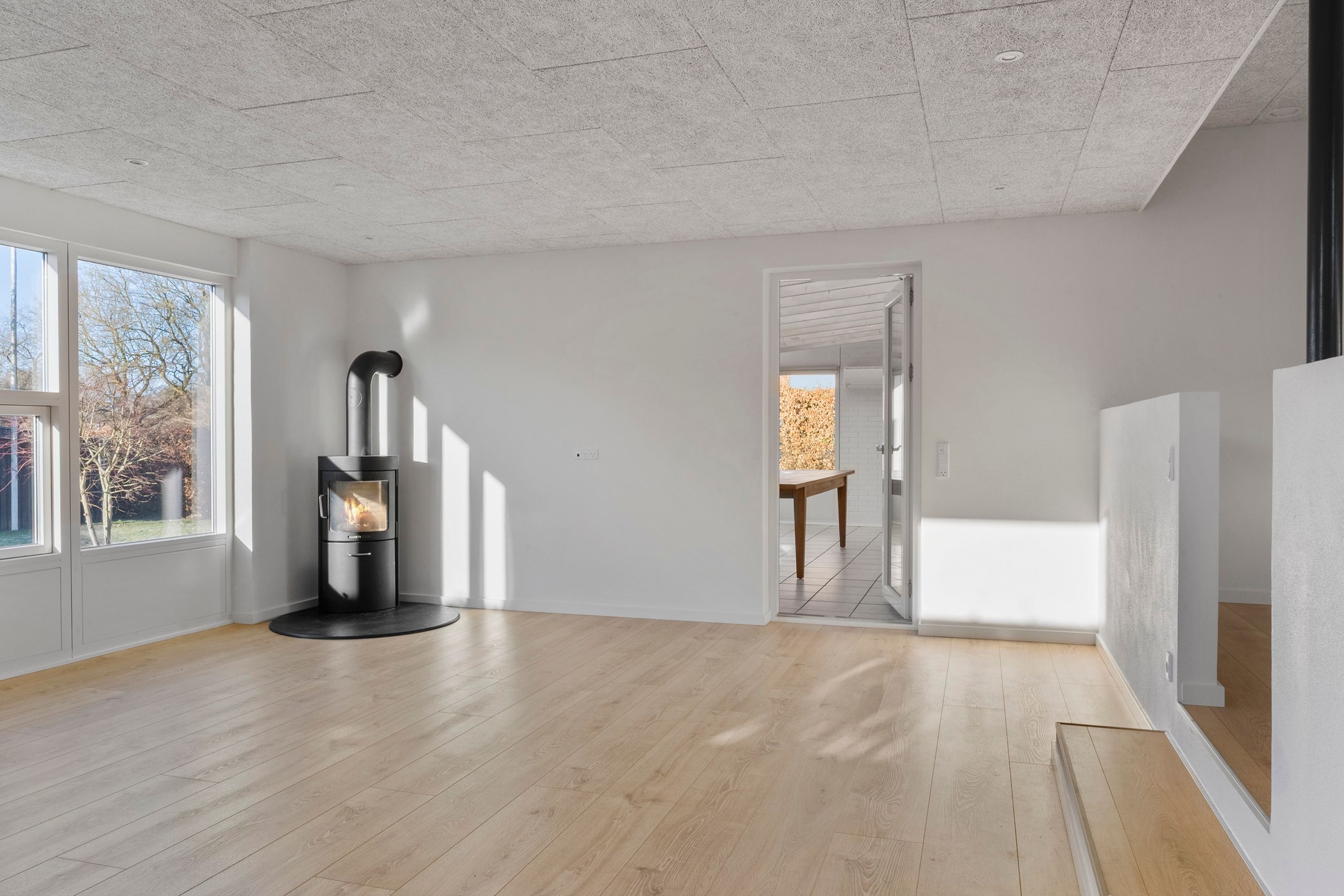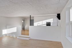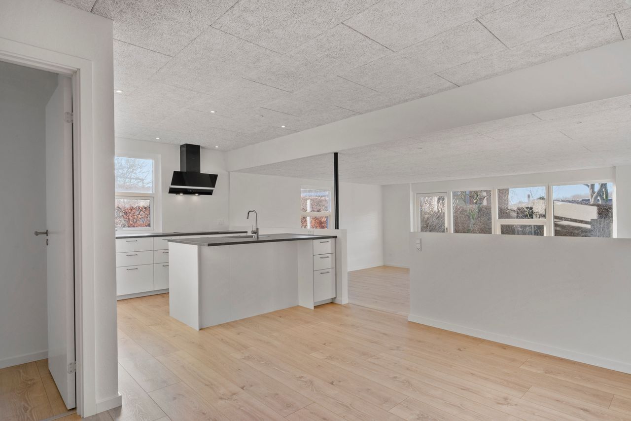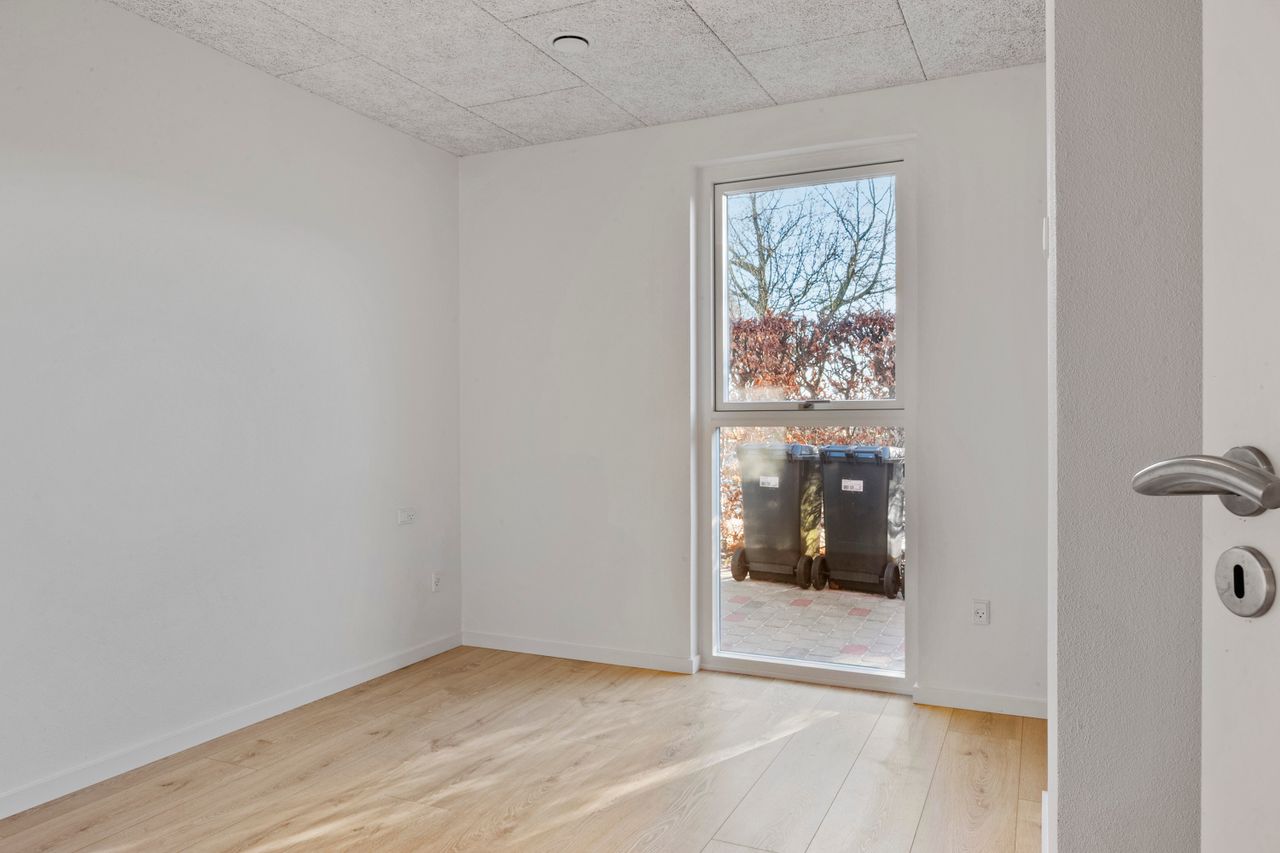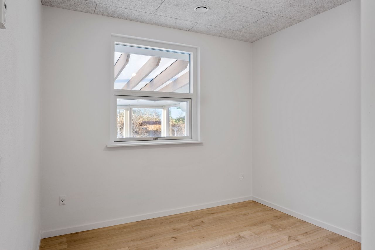 I forbindelse med køkken-alrummet finder man det første af boligens tre værelser samt et åbent, fleksibelt rum, der nemt kan tilpasses den nye ejers behov – eksempelvis som kontor, legerum eller kreativt værksted.