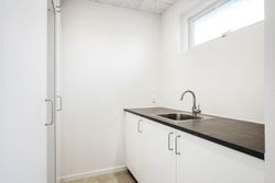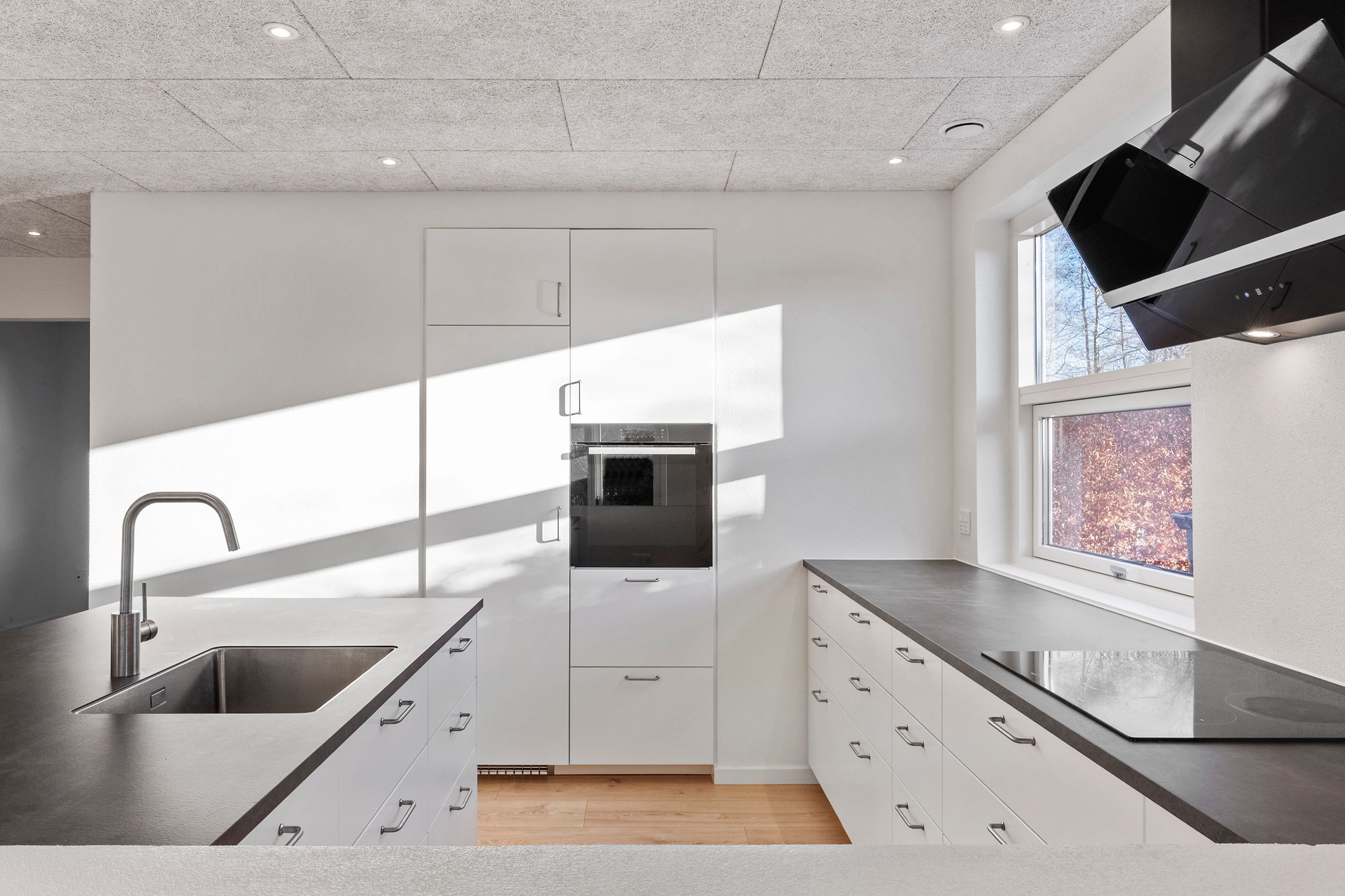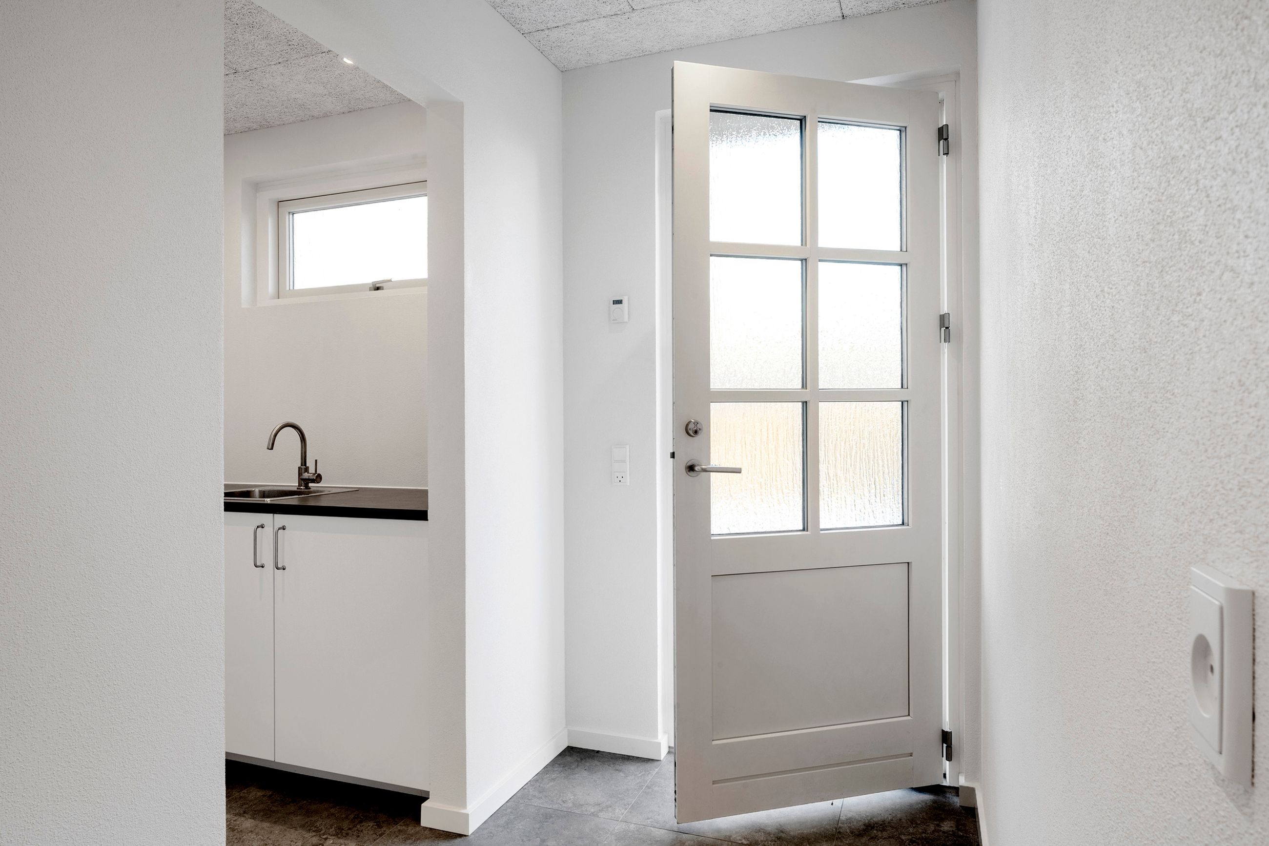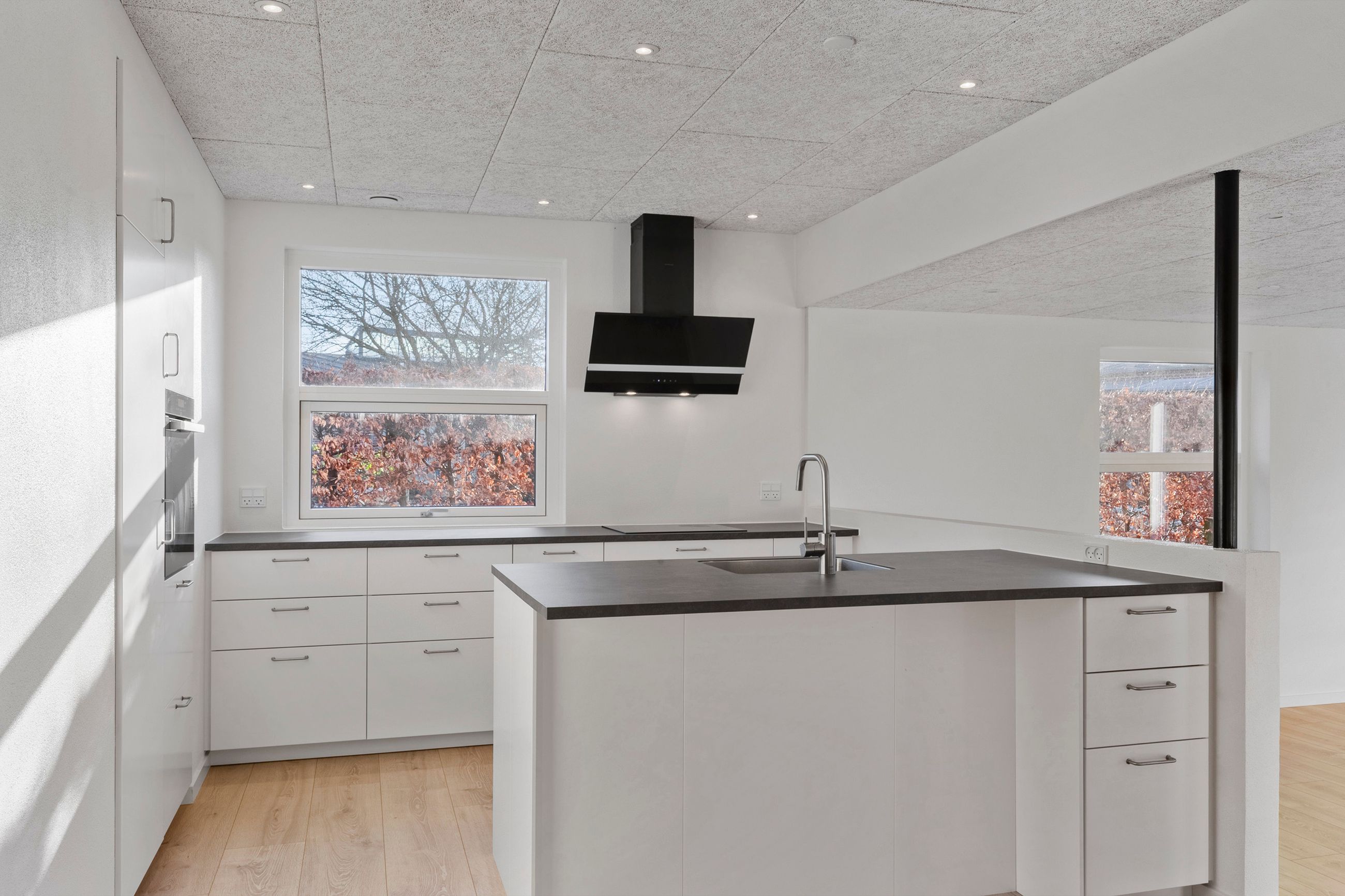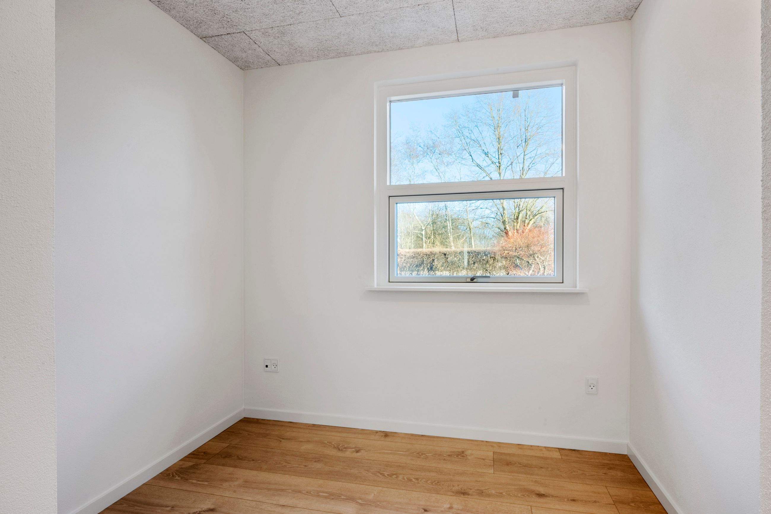 I forbindelse med køkken-alrummet finder man det første af boligens tre værelser samt et åbent, fleksibelt rum, der nemt kan tilpasses den nye ejers behov – eksempelvis som kontor, legerum eller kreativt værksted.