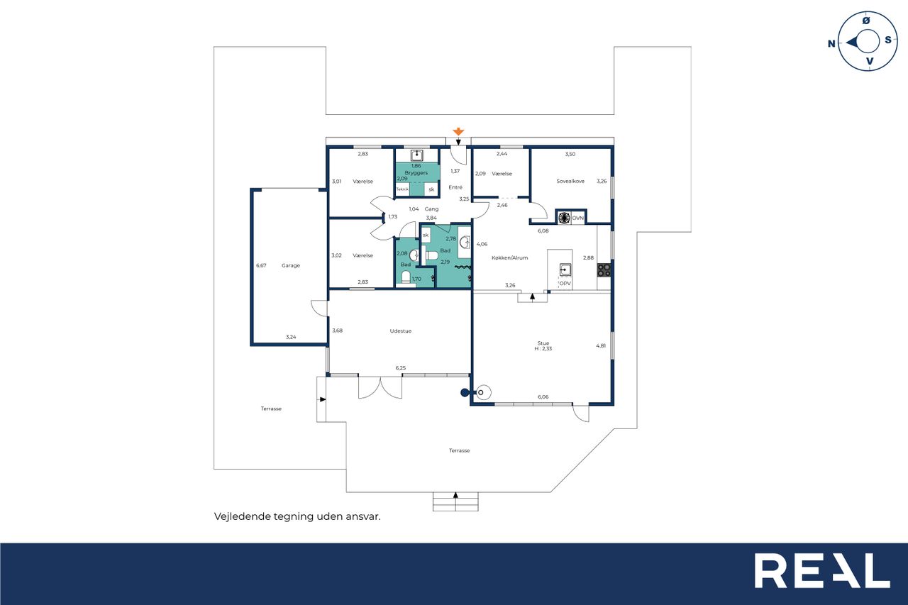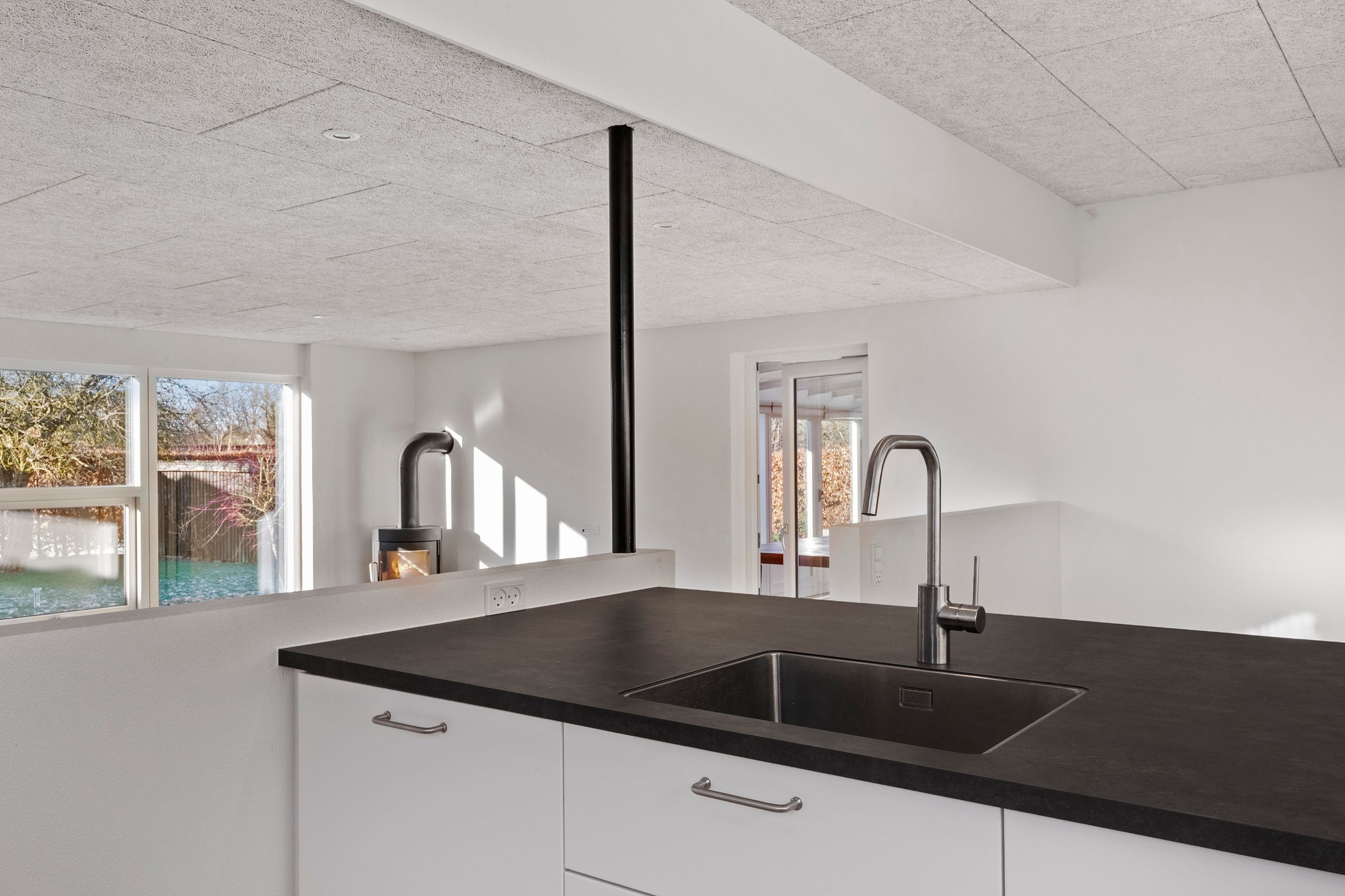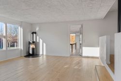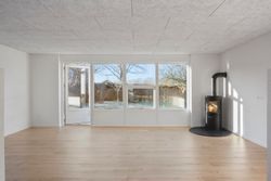Når man træder ind i huset, mødes man af en indbydende entré med et praktisk bryggers, der rummer både skabe og vask. Herfra fortsætter man ind i det store leverum – et lyst og åbent køkken-alrum med god plads til spiseafdeling. Et par trin ned ligger den rummelige stue med brændeovn og store vinduespartier mod haven, som giver et skønt lysindfald og en behagelig atmosfære.