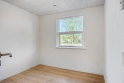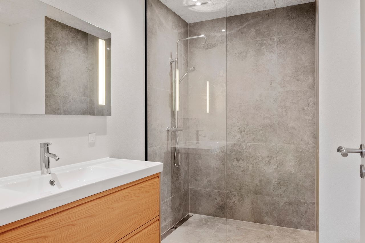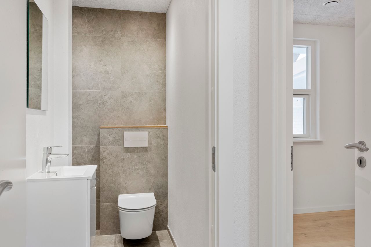 Værelsesafdelingen rummer yderligere to gode værelser samt to moderne badeværelser, begge udført i flotte materialer. Planløsningen er gennemtænkt og udnytter boligens kvadratmeter optimalt, så der skabes en harmonisk og funktionel bolig med fokus på både æstetik og praktik.