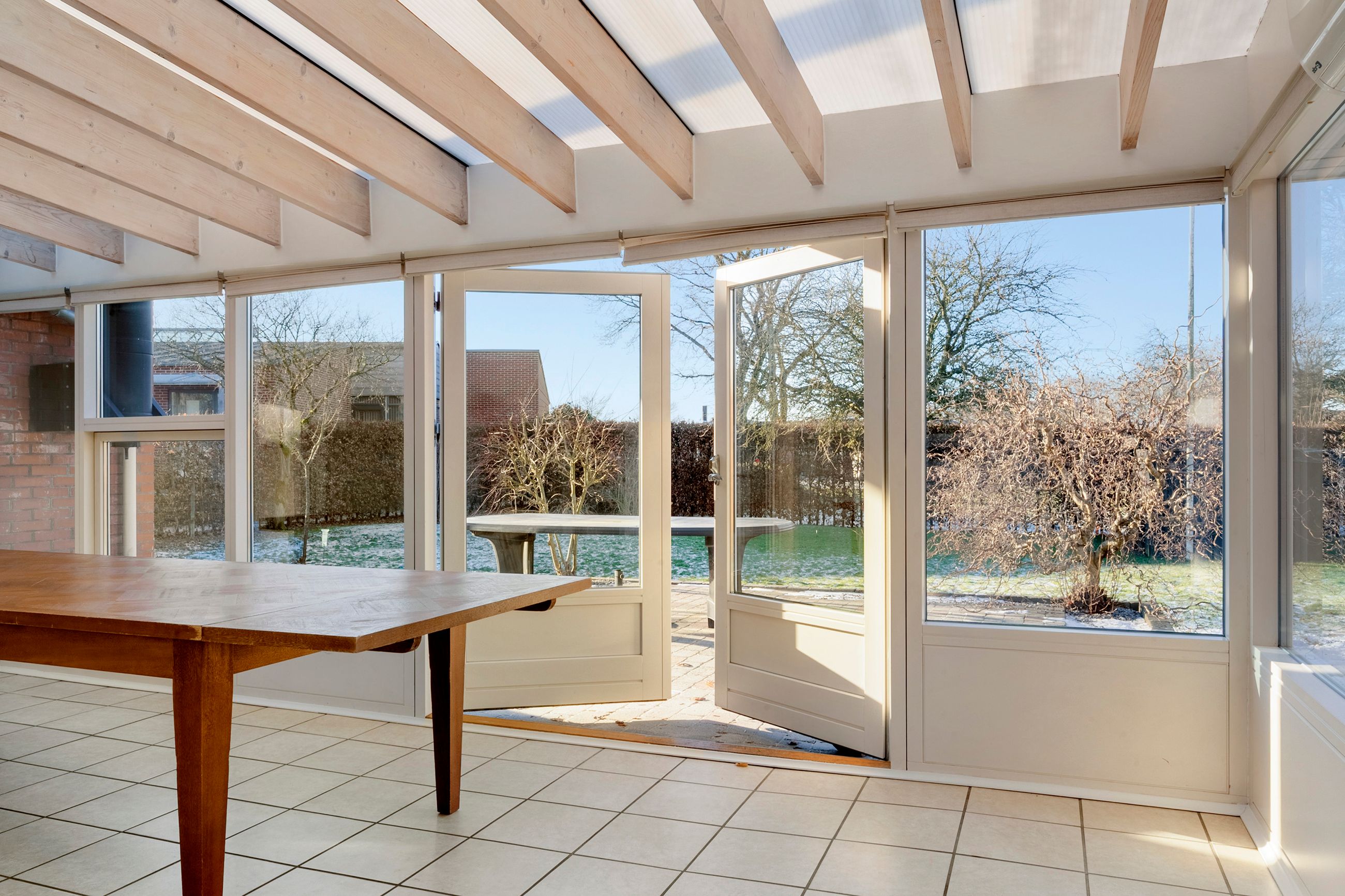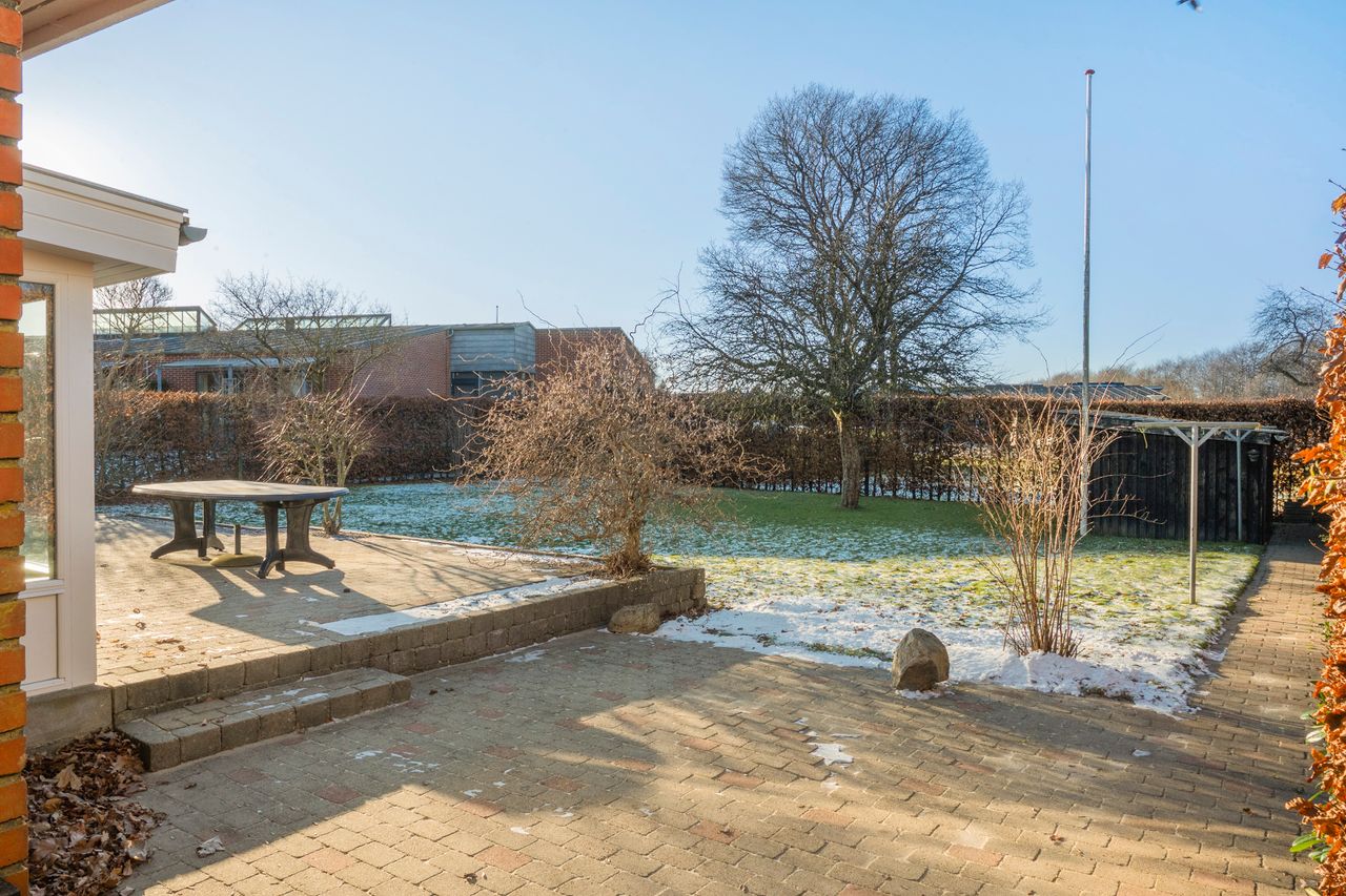 Som et ekstra plus byder ejendommen på en skøn udestue med varmepumpe, hvor man kan åbne op og lade haven og udestuen smelte sammen på varme dage. Herfra er der direkte adgang til boligen via garagen – en praktisk løsning, der gør det muligt at komme tørskoet ind året rundt.