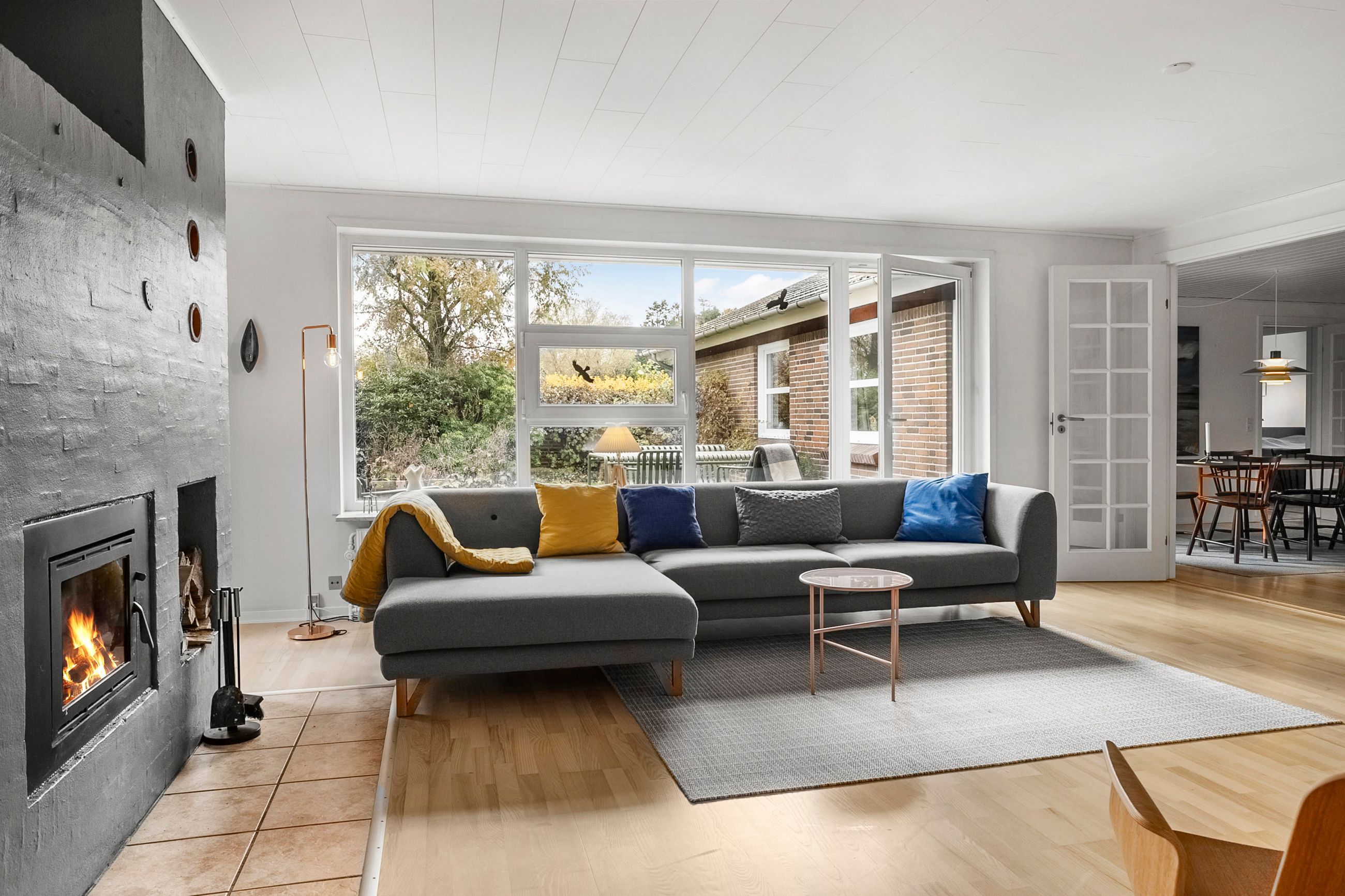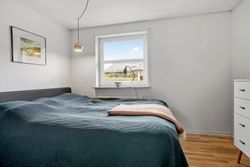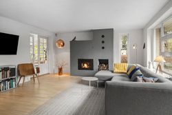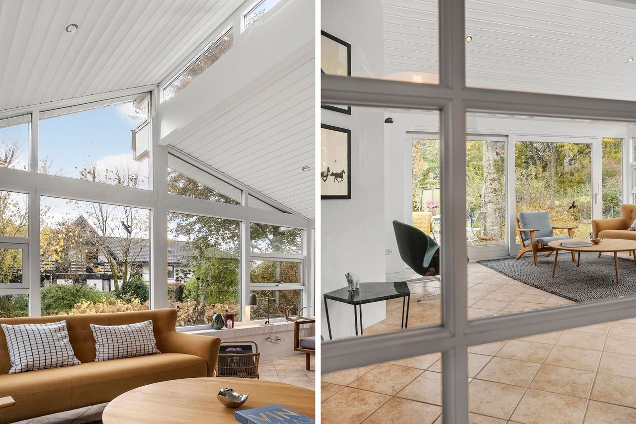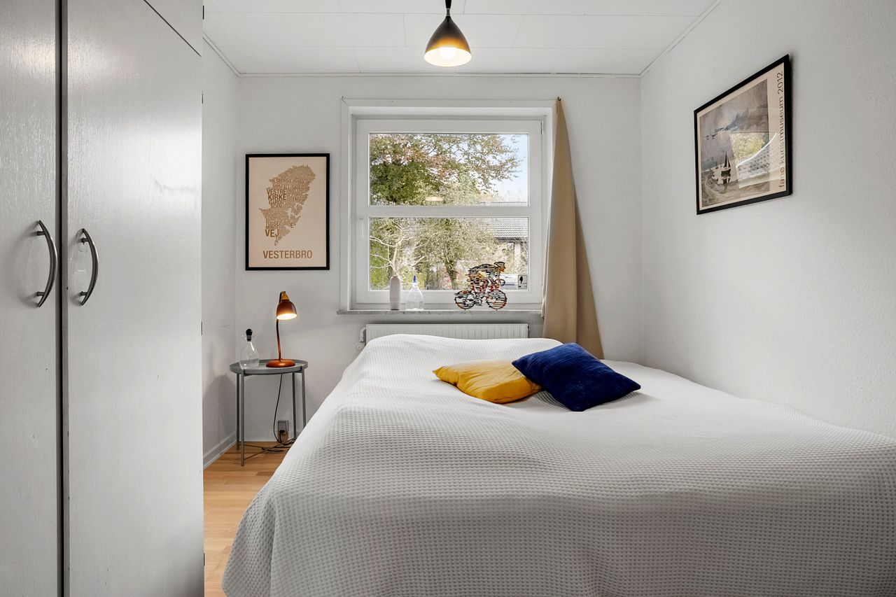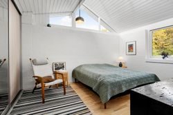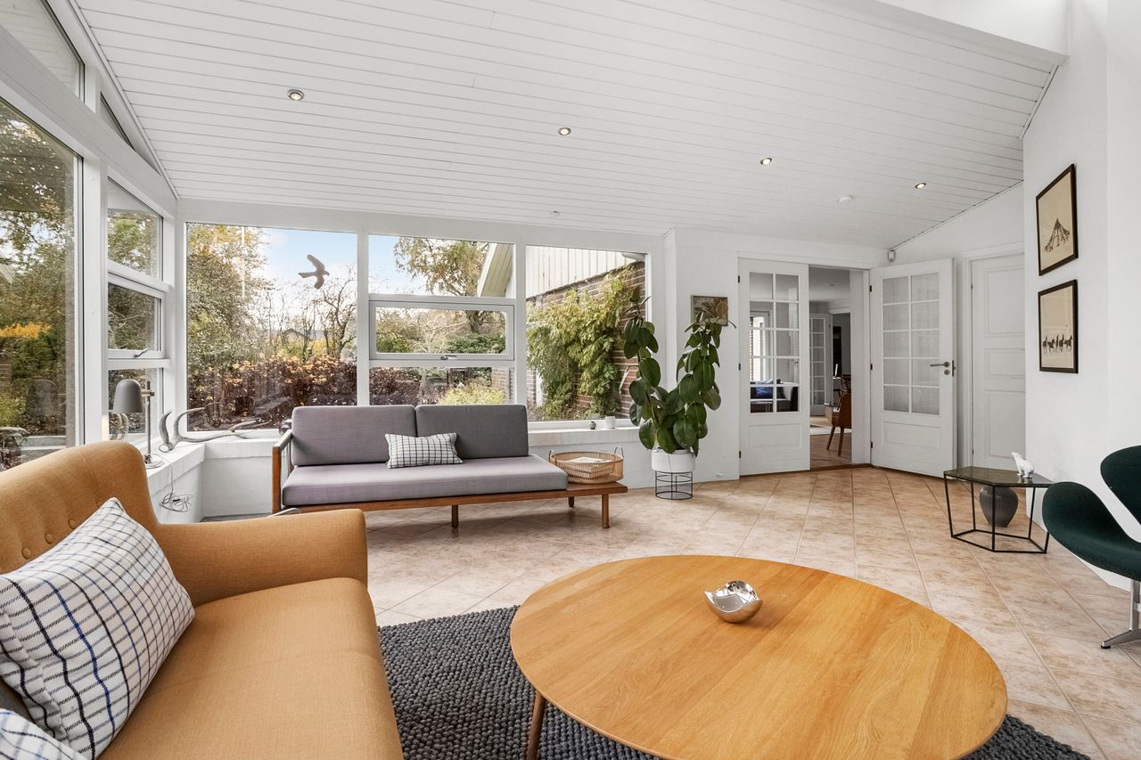 Fra alrummet fører franske døre dig videre ind i den hyggelige pejse- og tv-stue, som er perfekt til afslapning foran flammernes skær. I forlængelse heraf finder du tilbygningen fra 2002, der huser en lys opholdsstue med imponerende gulv-til-loft-vinduer. Her får du naturen helt tæt på, hvilket gør rummet ideelt til ro og fordybelse. Forældreafdelingen byder på et lyst soveværelse med indbyggede skabe samt eget badeværelse – din private oase.