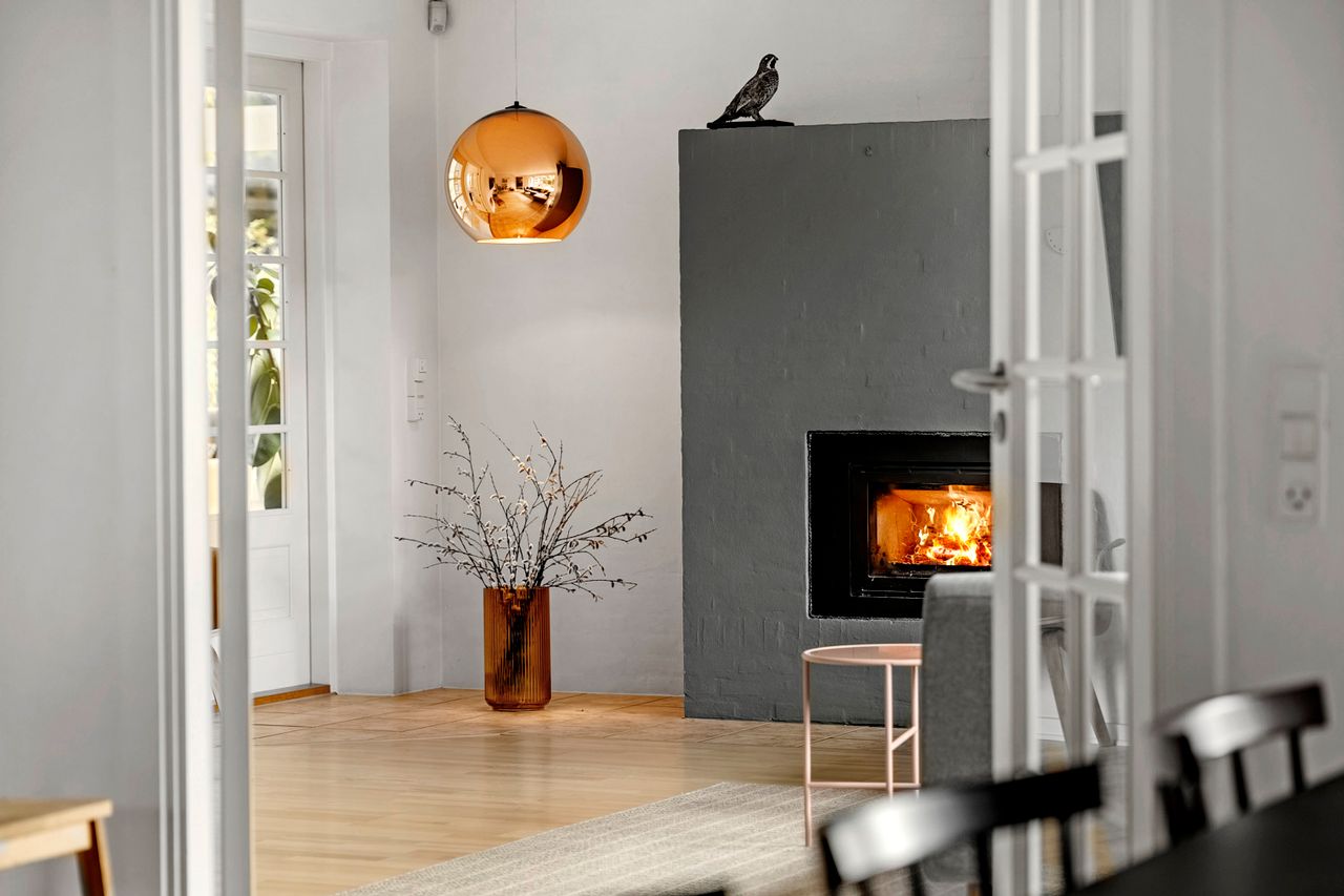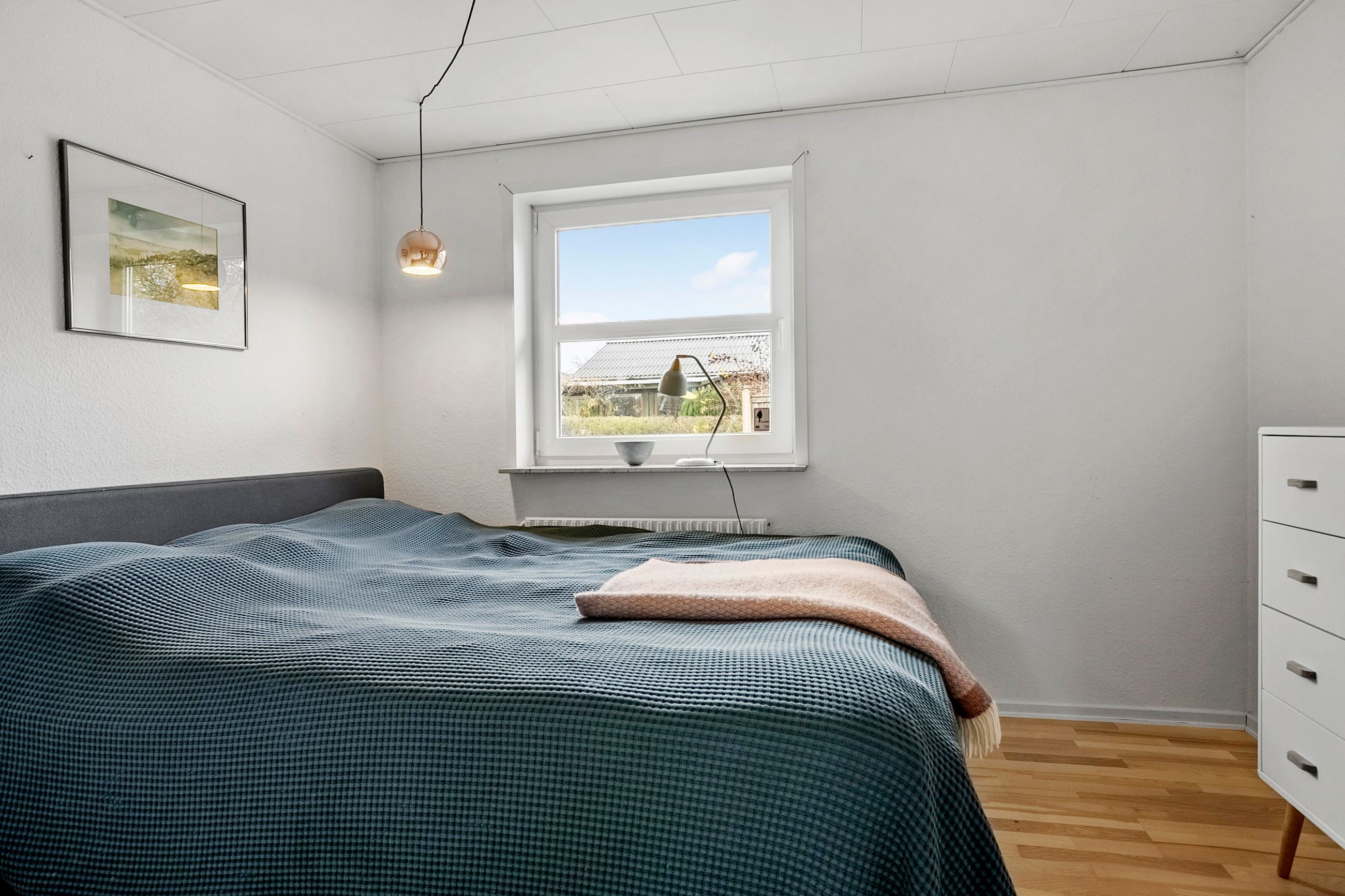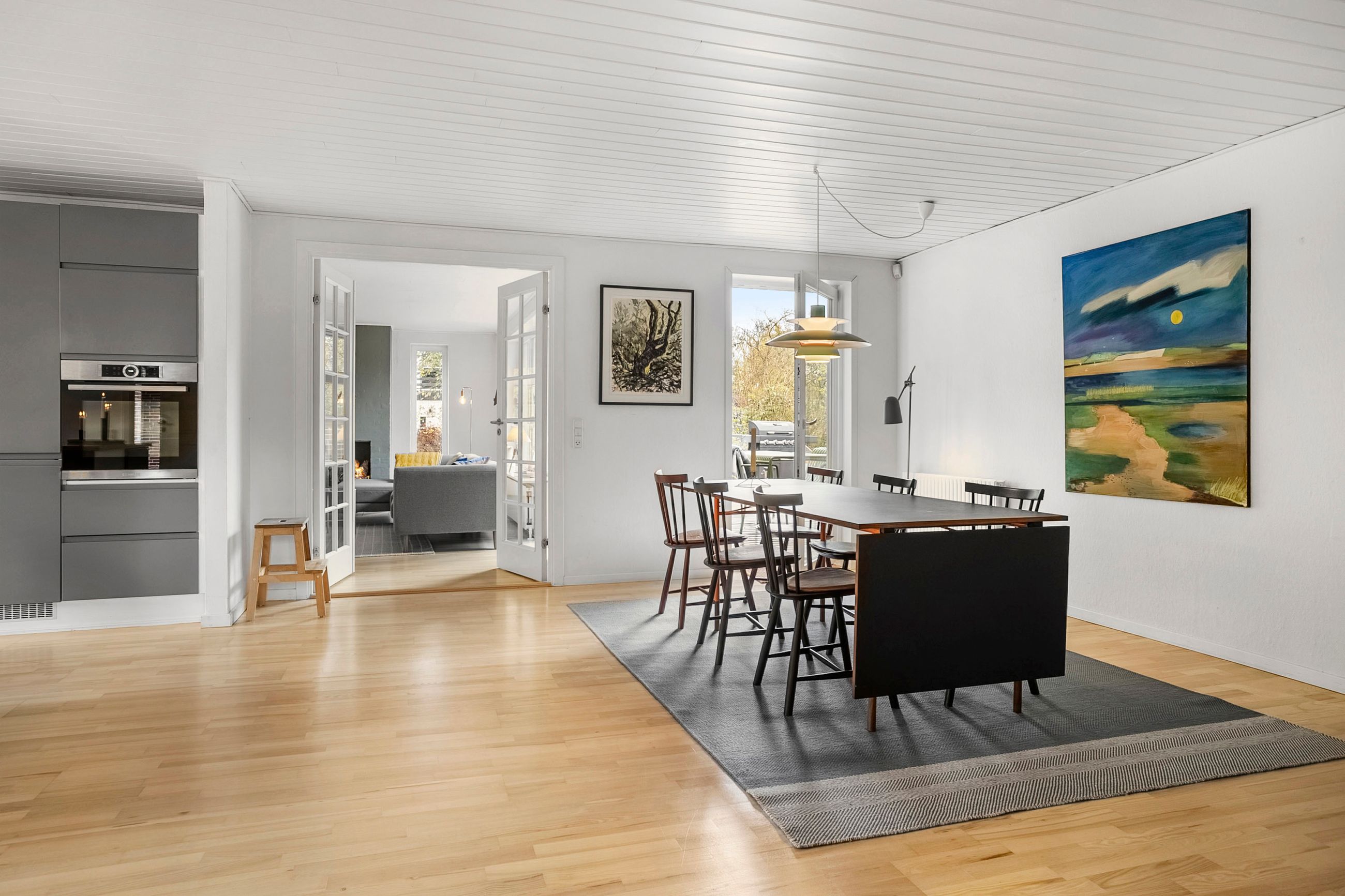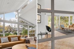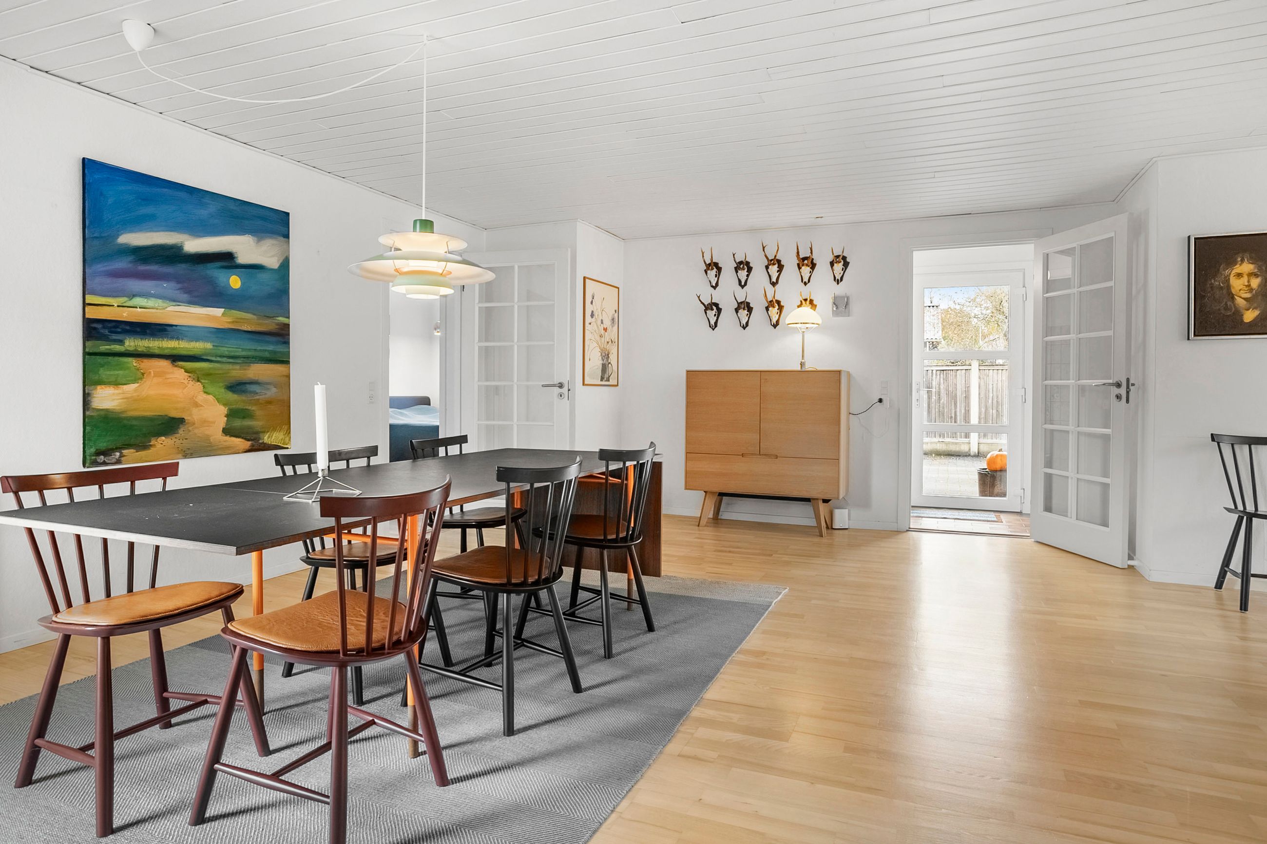 Fra alrummet fører franske døre dig videre ind i den hyggelige pejse- og tv-stue, som er perfekt til afslapning foran flammernes skær. I forlængelse heraf finder du tilbygningen fra 2002, der huser en lys opholdsstue med imponerende gulv-til-loft-vinduer. Her får du naturen helt tæt på, hvilket gør rummet ideelt til ro og fordybelse. Forældreafdelingen byder på et lyst soveværelse med indbyggede skabe samt eget badeværelse – din private oase.