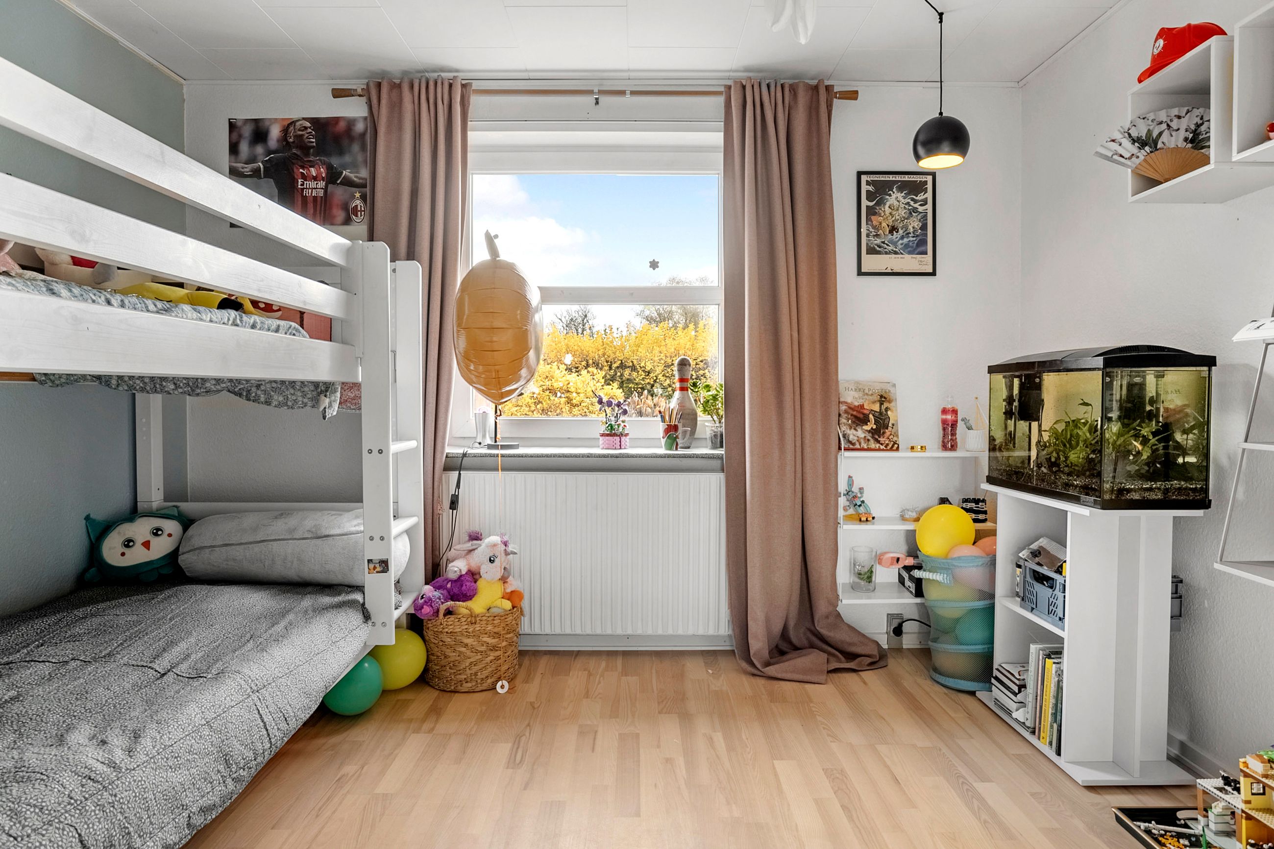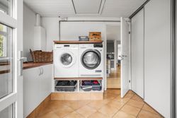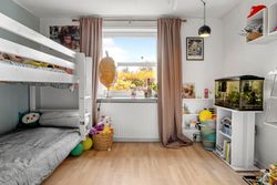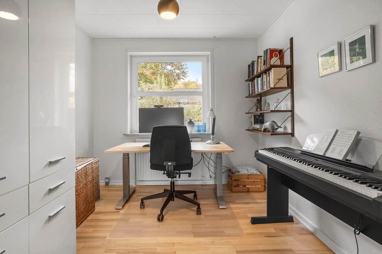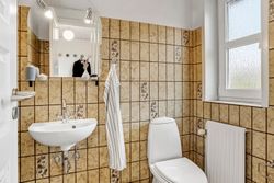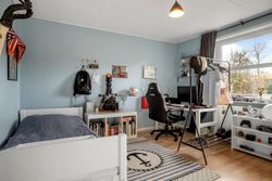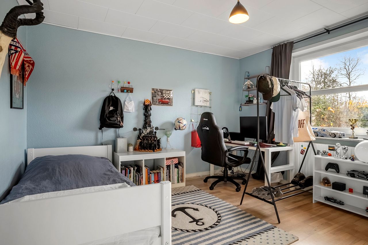 Børneafdelingen er generøs med fem værelser samt et ekstra badeværelse, så alle familiemedlemmer har deres egen plads. Derudover findes et gæstetoilet ved entréen samt et praktisk bryggers med egen indgang – alt hvad man behøver for at få hverdagen til at glide let.