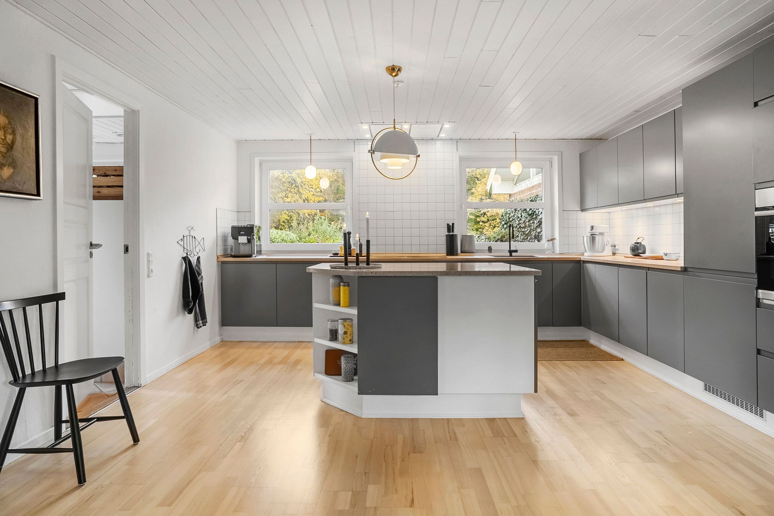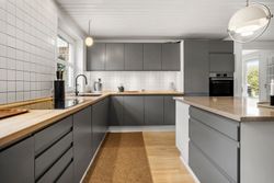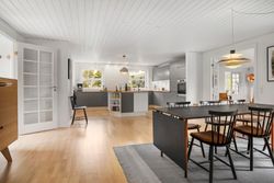Velkommen til denne enestående villa, der byder på hele 231 kvadratmeter bolig i hjertet af Randbøldals smukke natur. Oprindeligt opført i 1979 og med en harmonisk tilbygning fra 2002, fremstår ejendommen som et moderne hjem med plads til den store familie. Det centrale rum er det imponerende køkken-alrum, hvor køkkenet og spisestuen smelter sammen og skaber et naturligt samlingspunkt for både hverdag og festlige lejligheder. Køkkenet er moderniseret med fronter og bordplade og er stilfuldt indrettet med en rummelig køkkenø, der inviterer til madlavning og samvær.