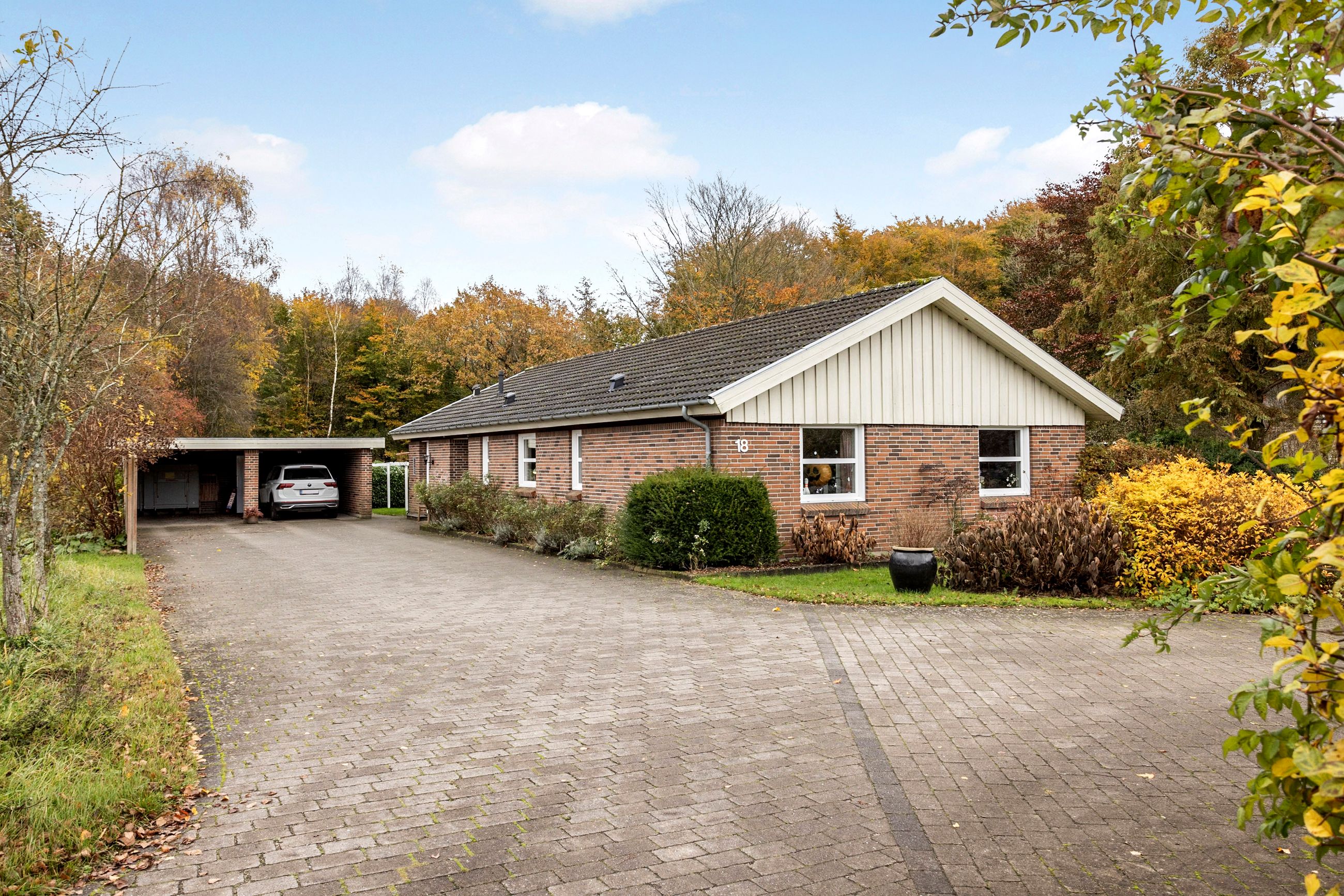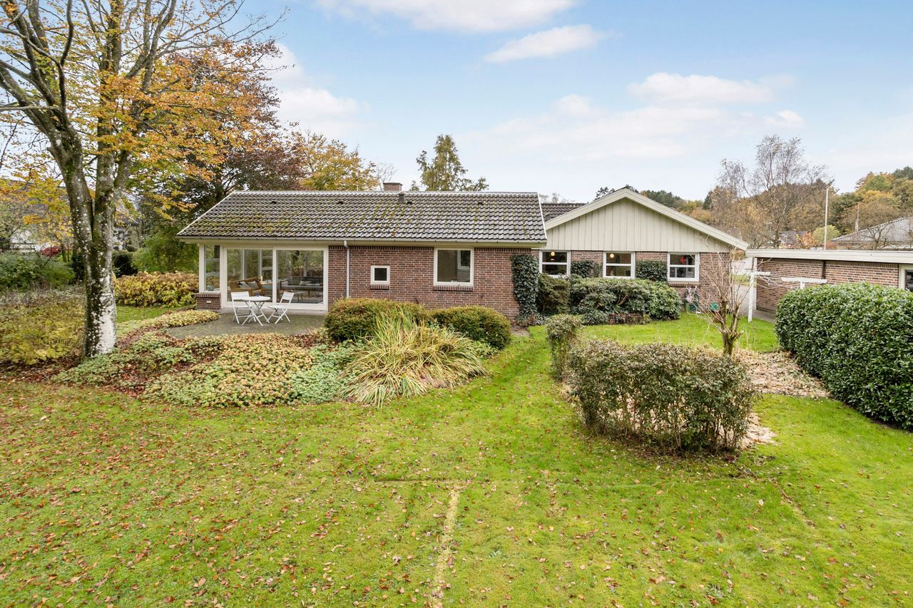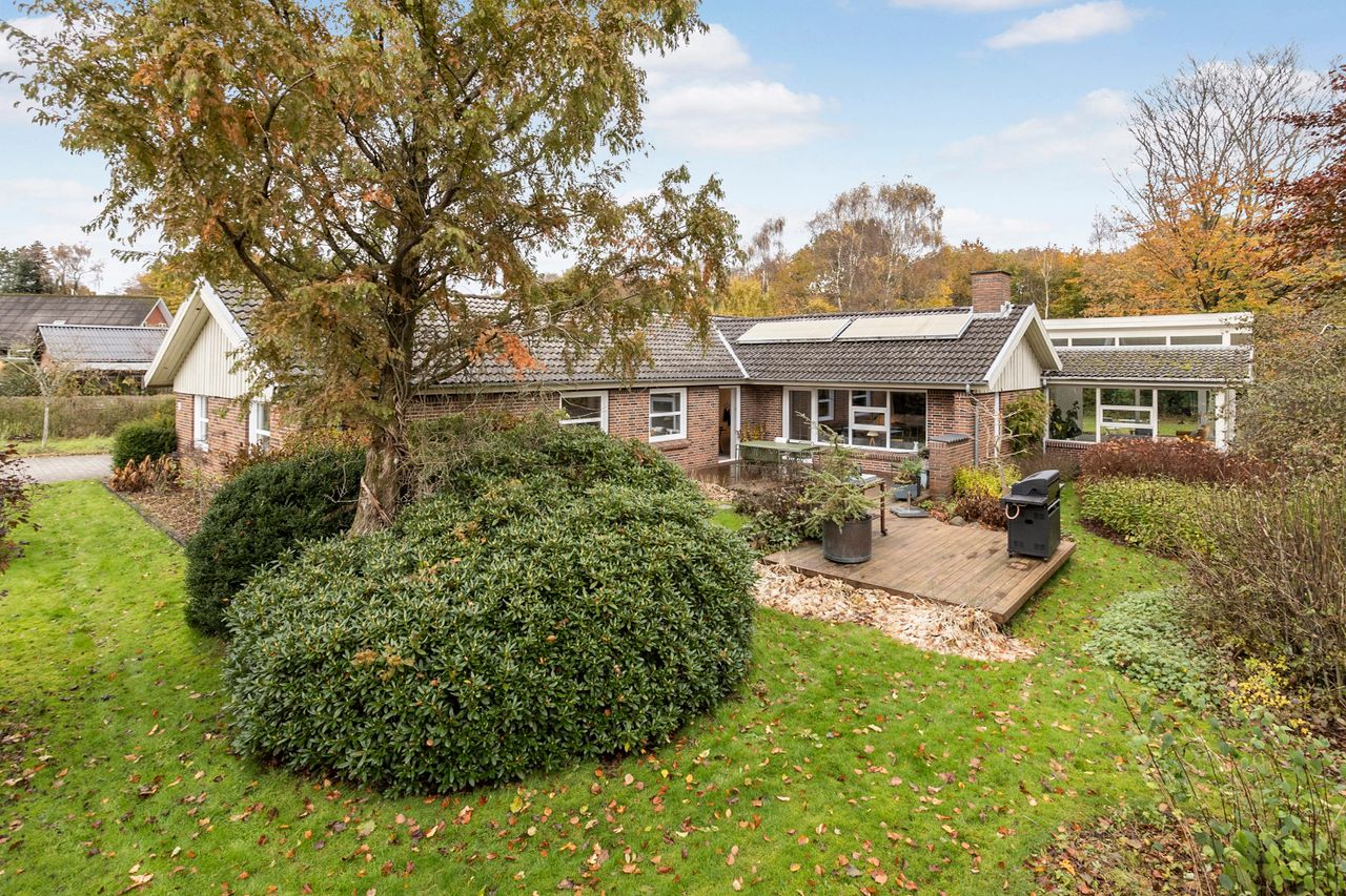 Udendørs venter en naturskøn have, der grænser op til skoven – her kan du opleve årstidernes skiften på nærmeste hold. Den hævede terrasse giver udsigt over den parklignende have fyldt med små oaser af ro og mulighed for opdagelse. Ejendommen inkluderer også en dobbelt carport samt praktisk skurplads.