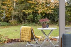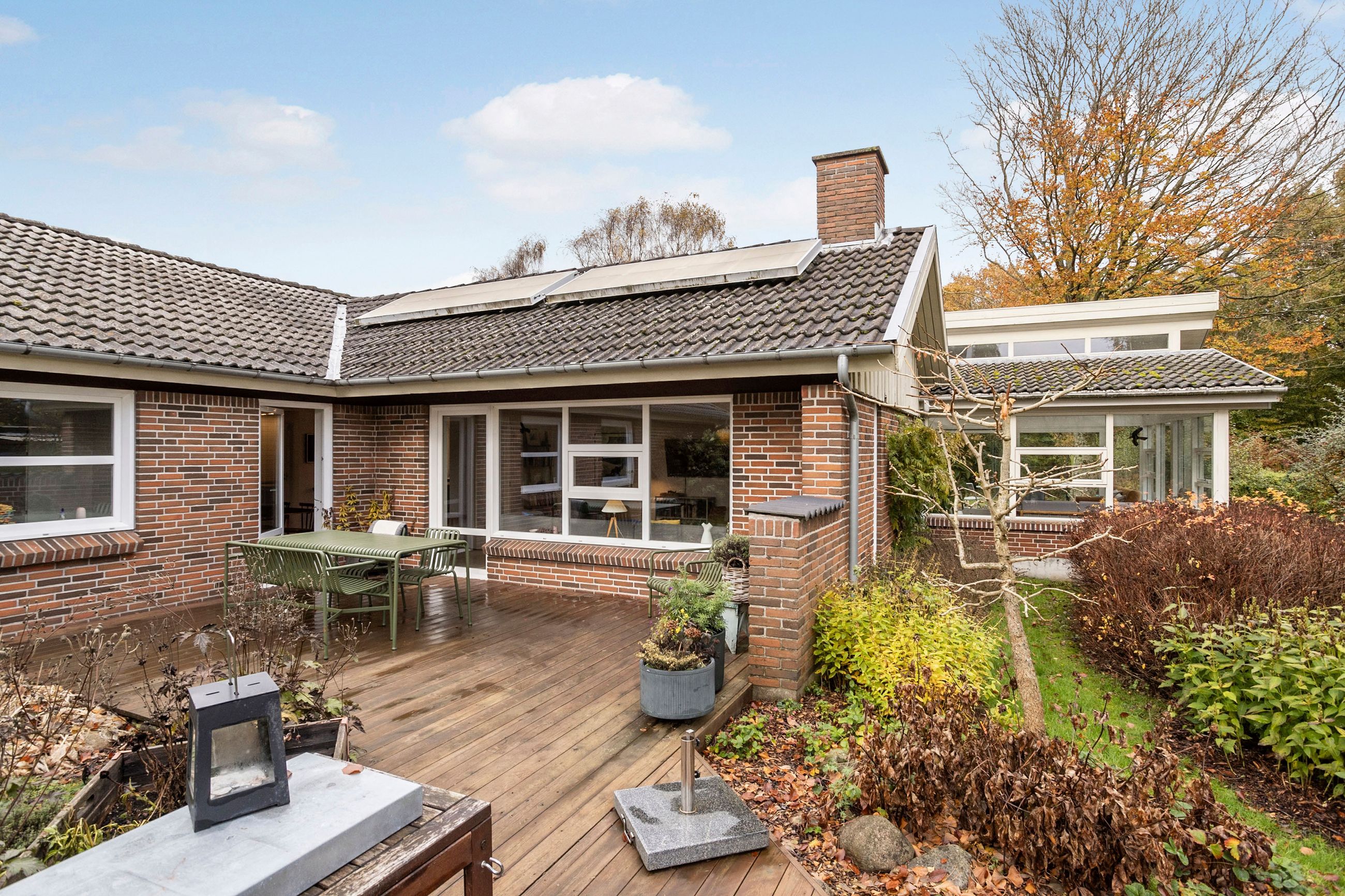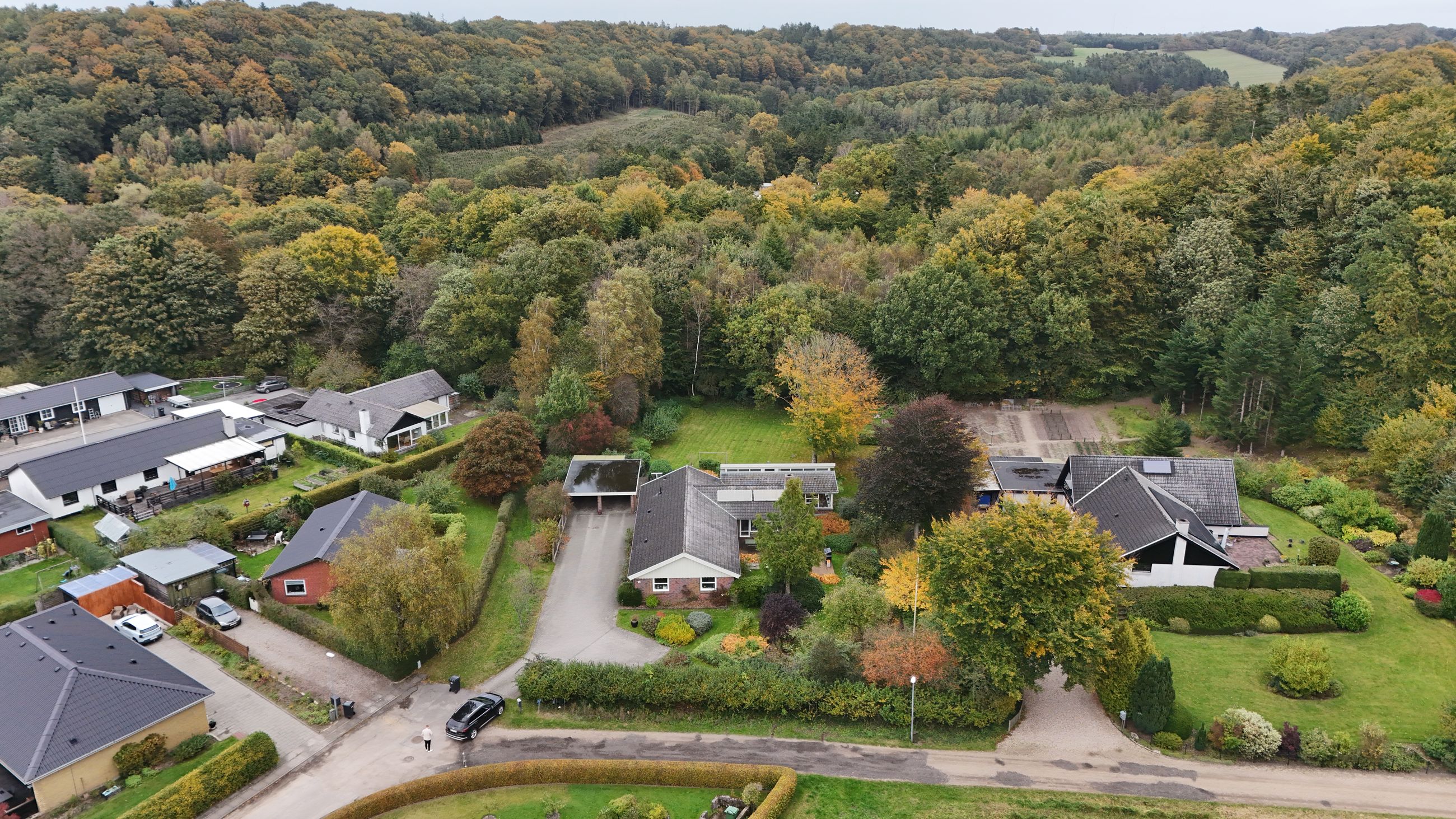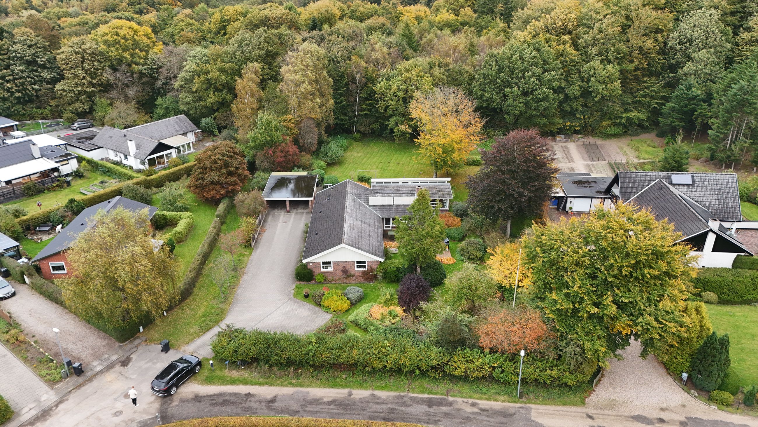 Udendørs venter en naturskøn have, der grænser op til skoven – her kan du opleve årstidernes skiften på nærmeste hold. Den hævede terrasse giver udsigt over den parklignende have fyldt med små oaser af ro og mulighed for opdagelse. Ejendommen inkluderer også en dobbelt carport samt praktisk skurplads.