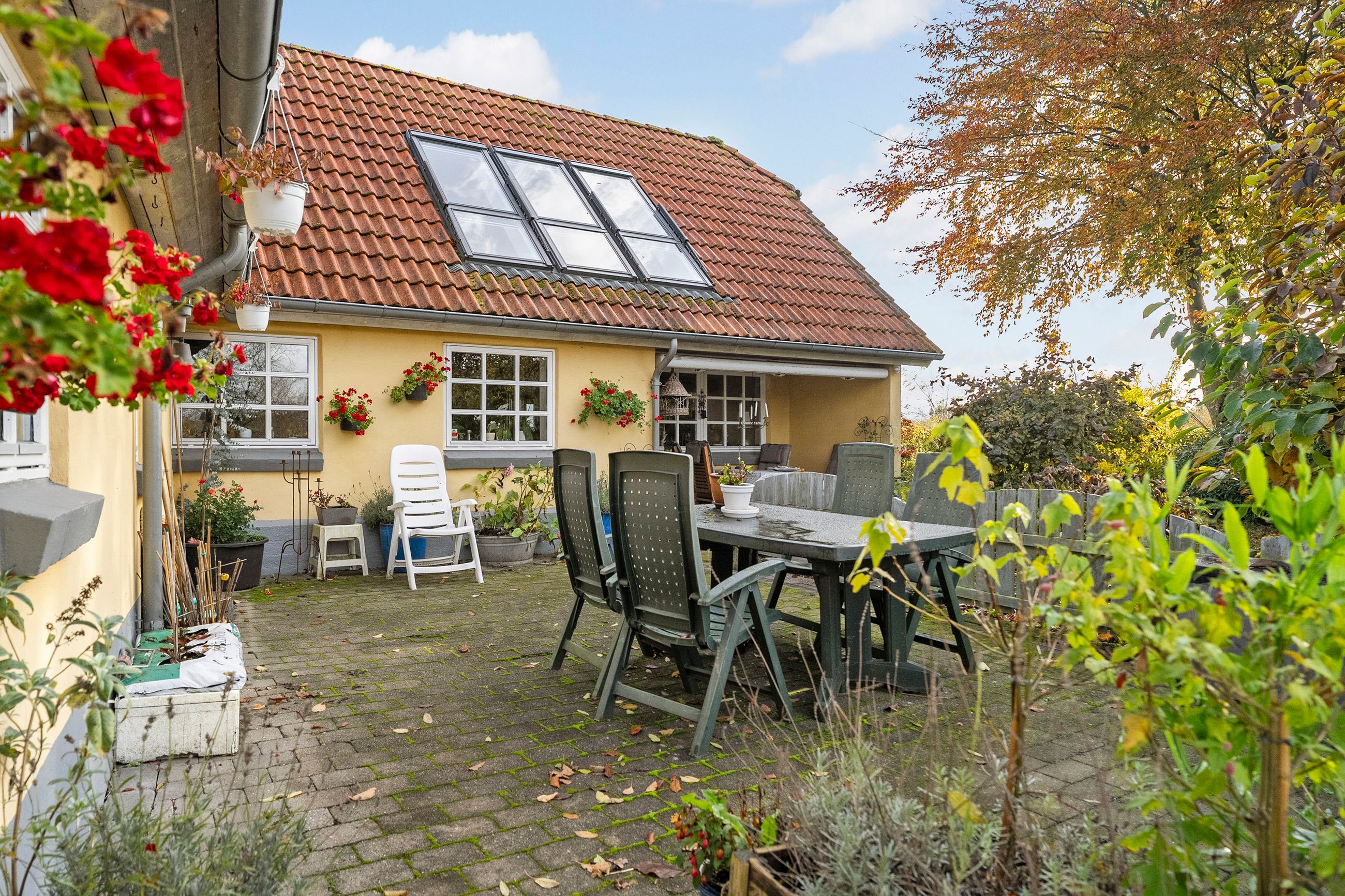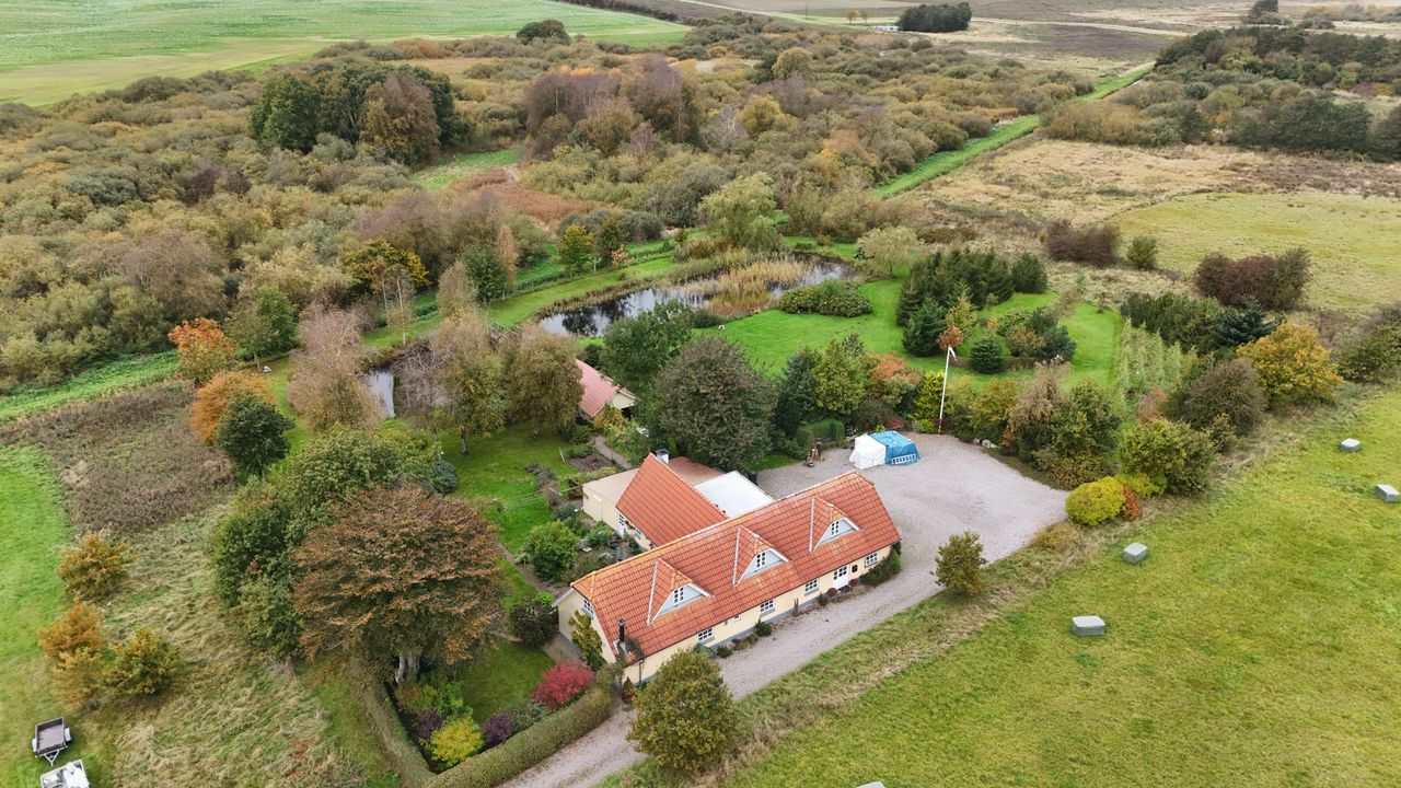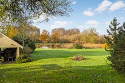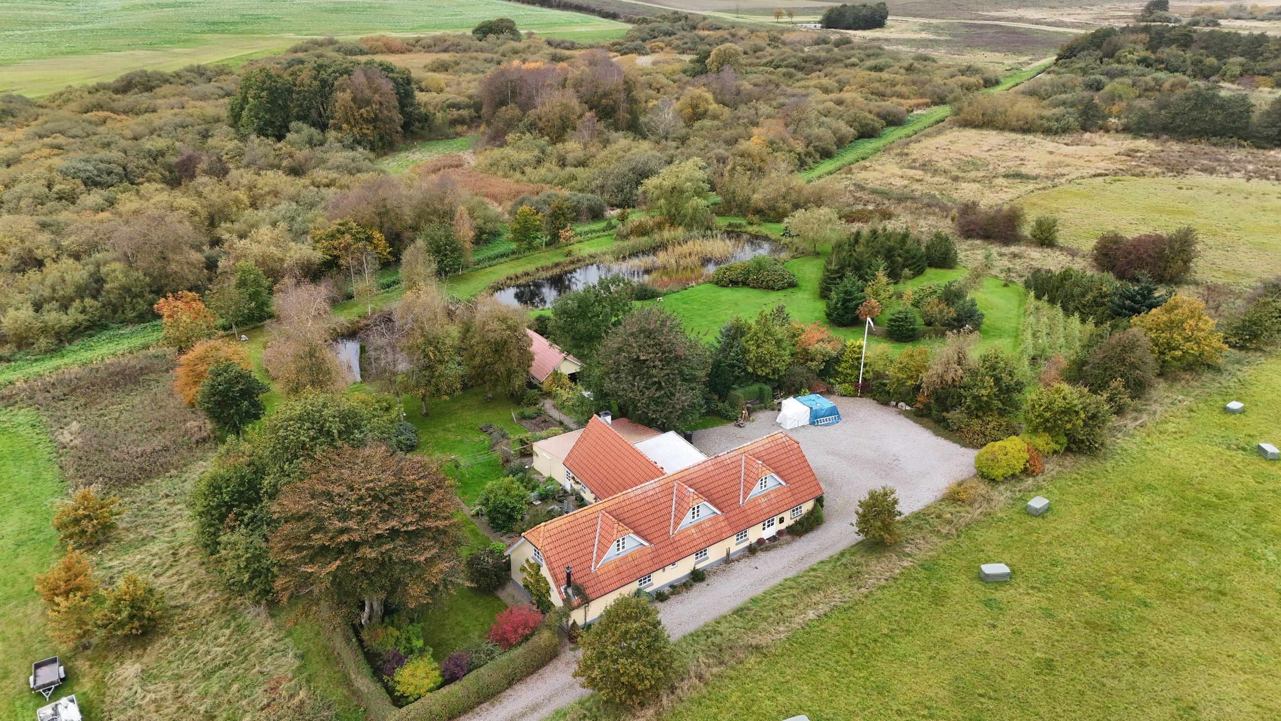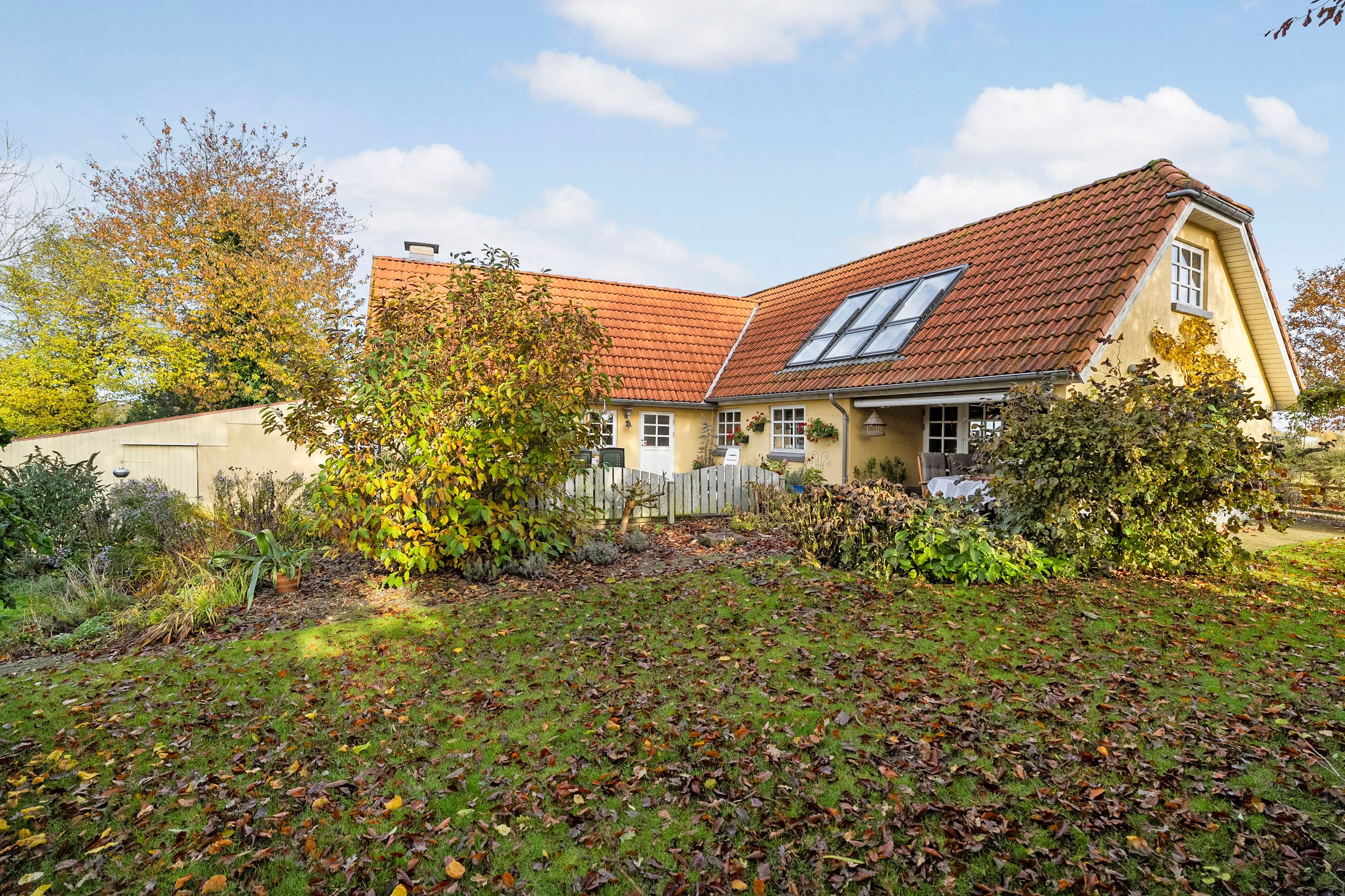 Ejendommen ligger på en betagende naturgrund, hvor der er lagt vægt på både skønhed og enkel vedligeholdelse. Haven fremstår næsten som en lille park – med grønne plæner, frugttræer, blomstrende buske og små kroge til afslapning og leg.