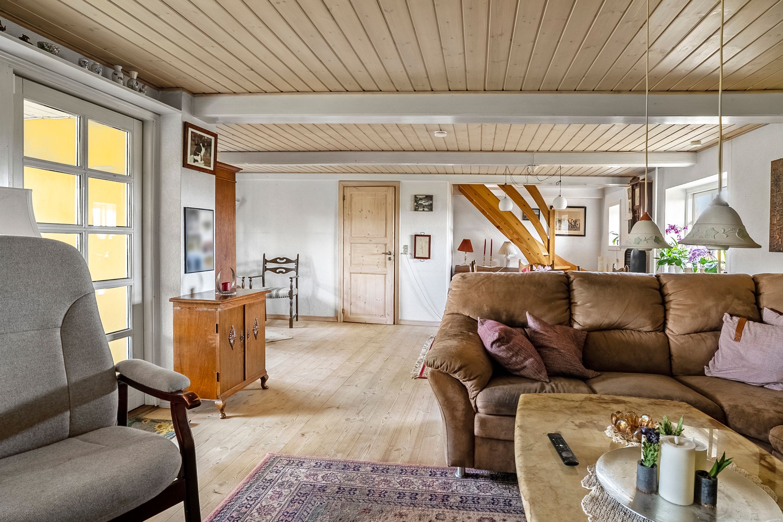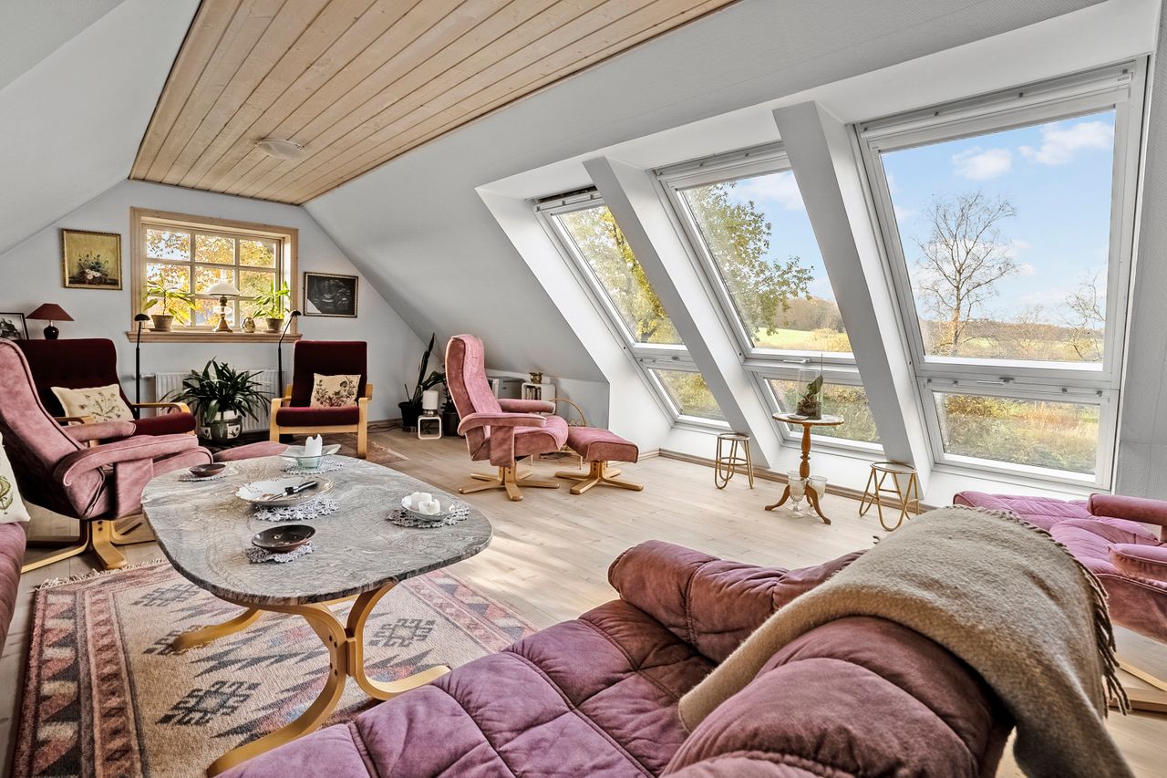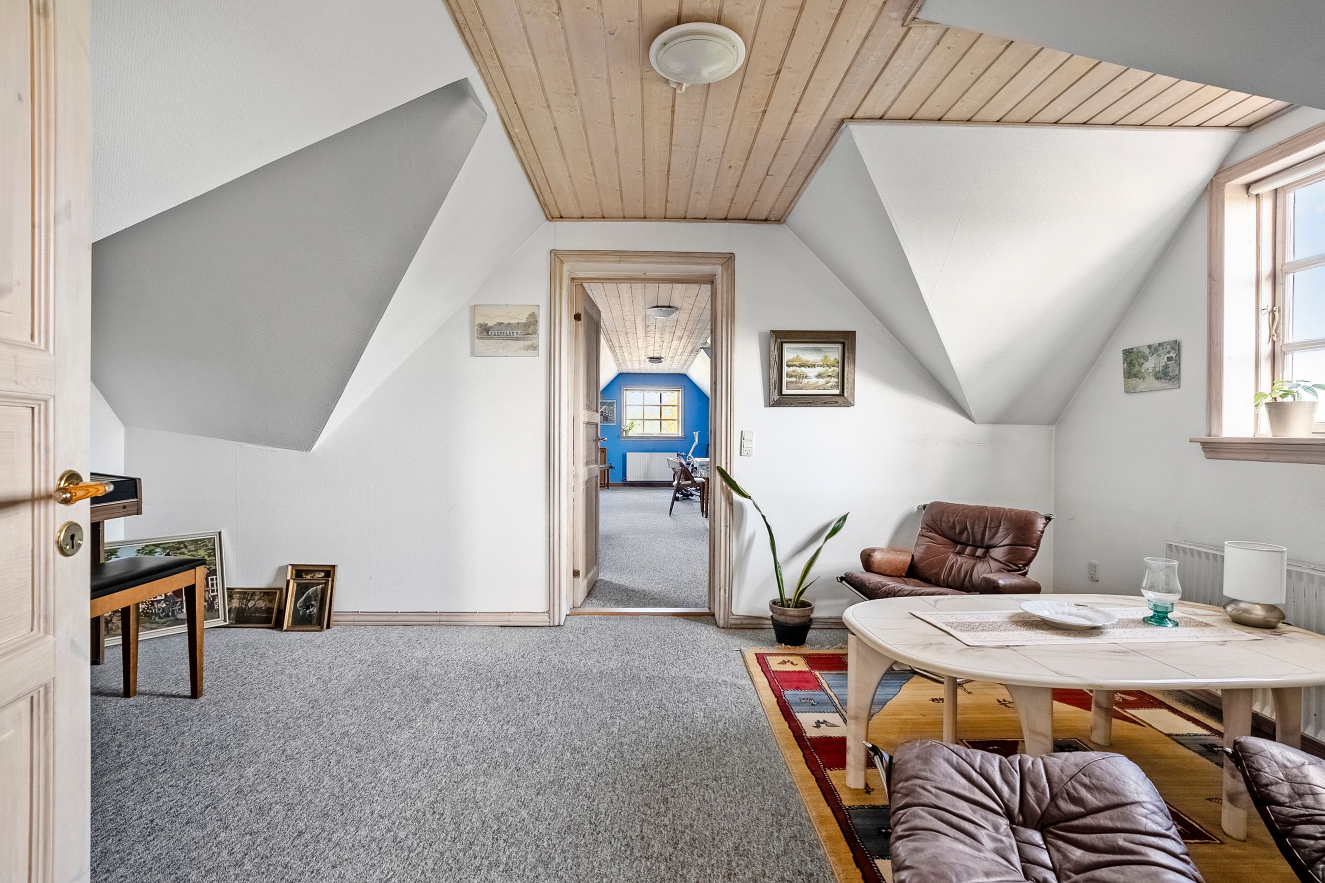 På førstesalen åbner en rummelig stue sig med store Velux-vinduer, der lader lyset strømme ind og giver et smukt vue over grunden. Her er god plads til at indrette efter behov – fx ekstra værelser, kontor, hobbyrum eller en teenageafdeling.