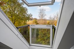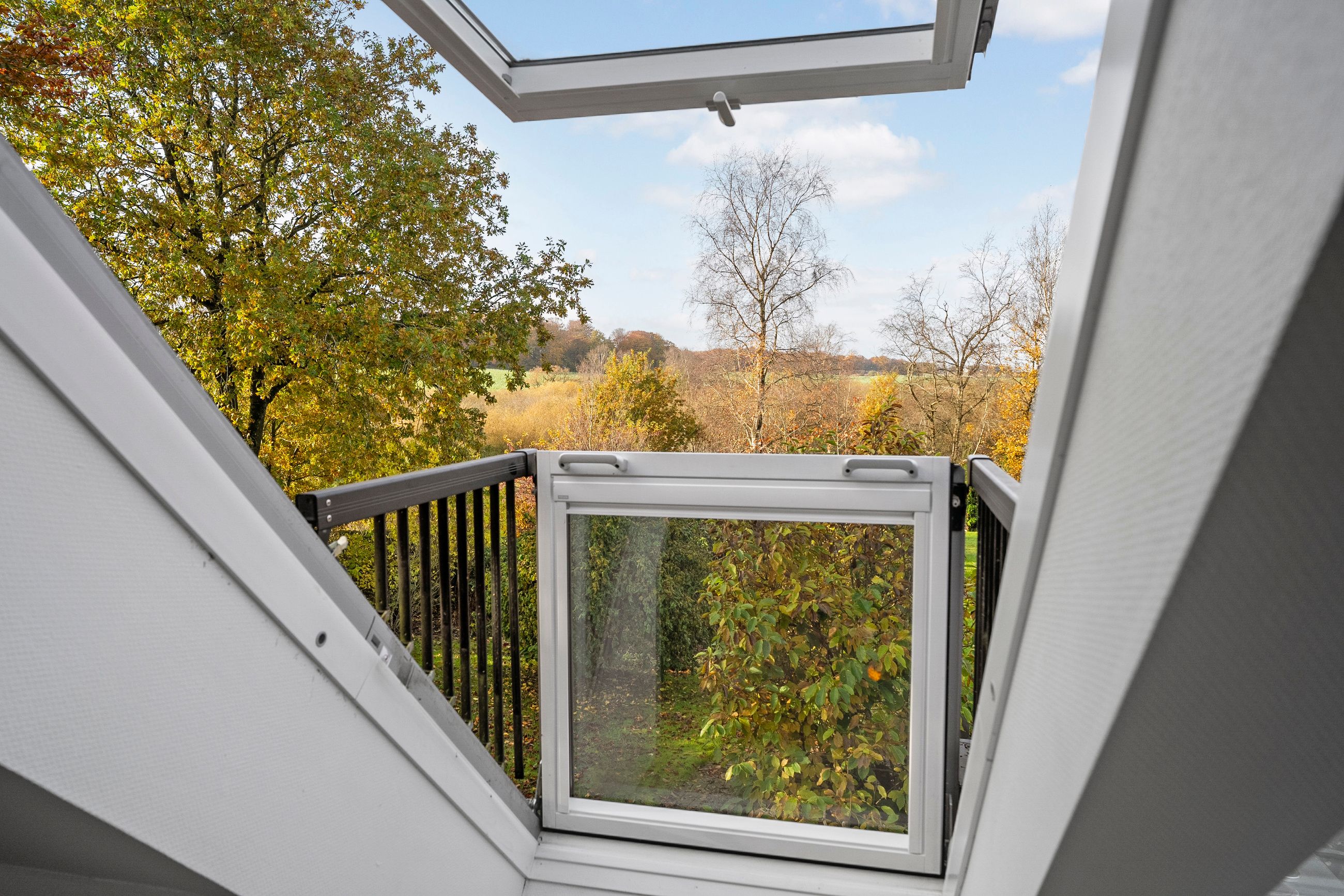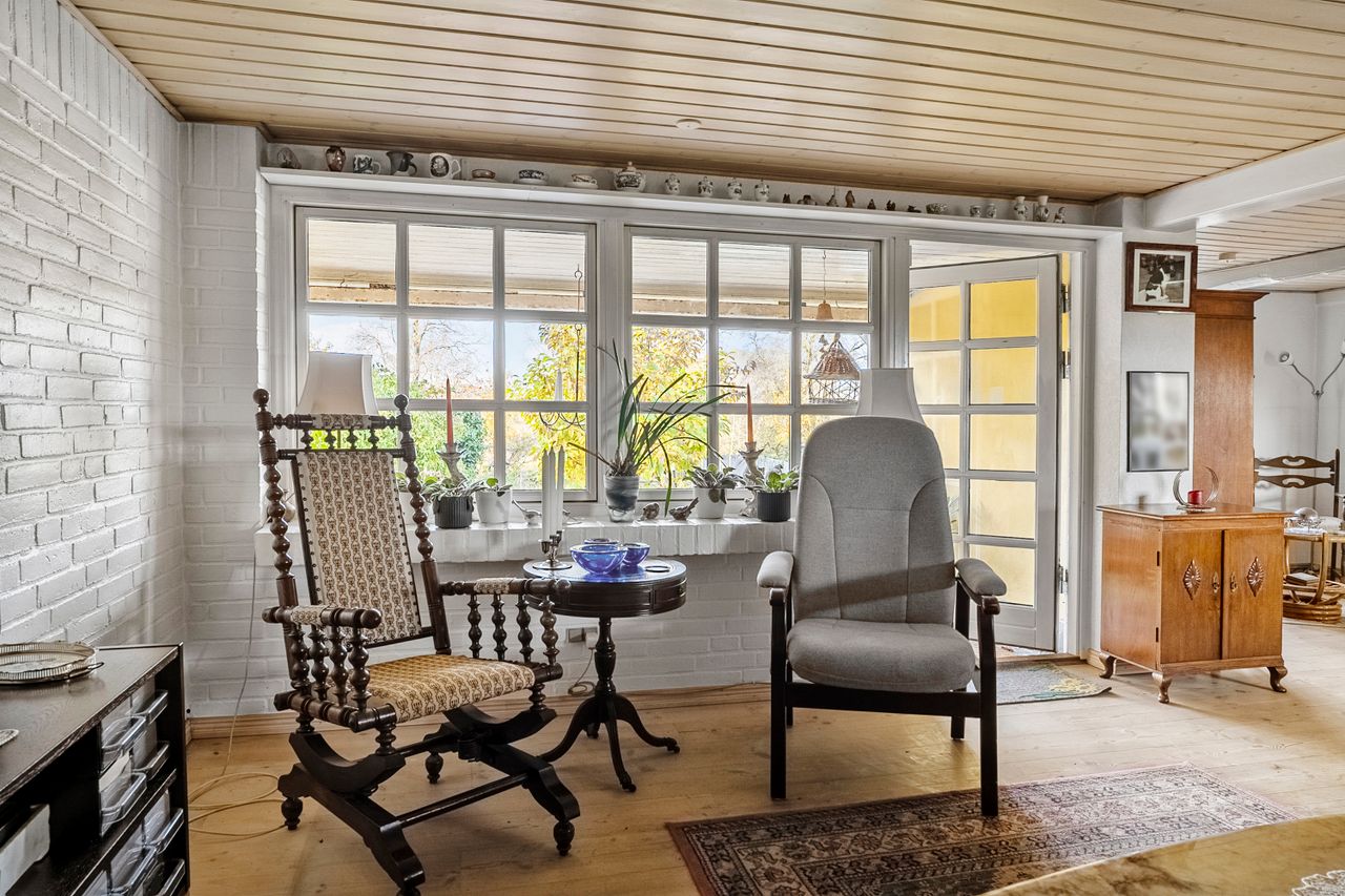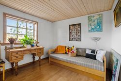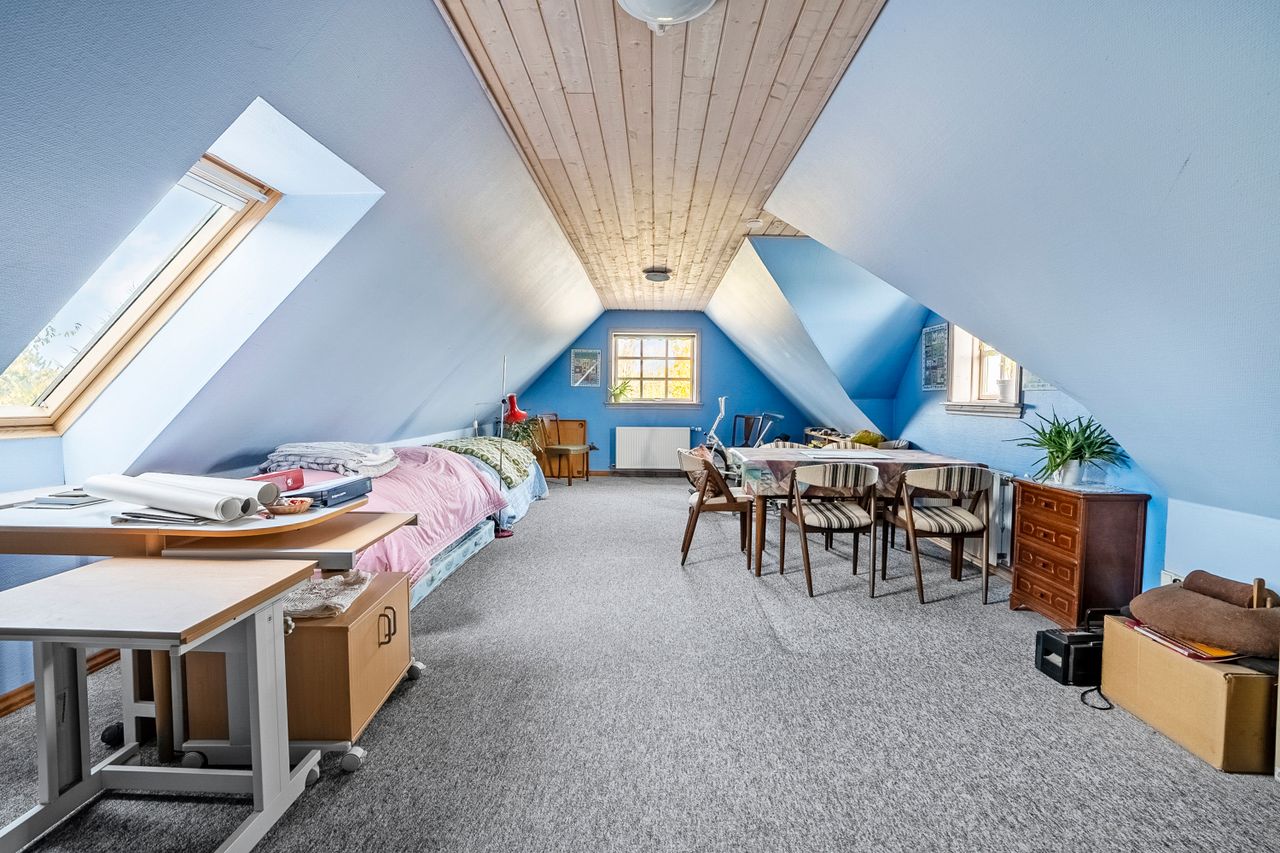 På førstesalen åbner en rummelig stue sig med store Velux-vinduer, der lader lyset strømme ind og giver et smukt vue over grunden. Her er god plads til at indrette efter behov – fx ekstra værelser, kontor, hobbyrum eller en teenageafdeling.