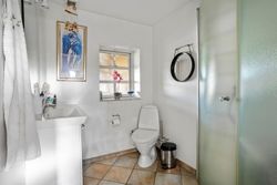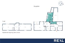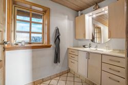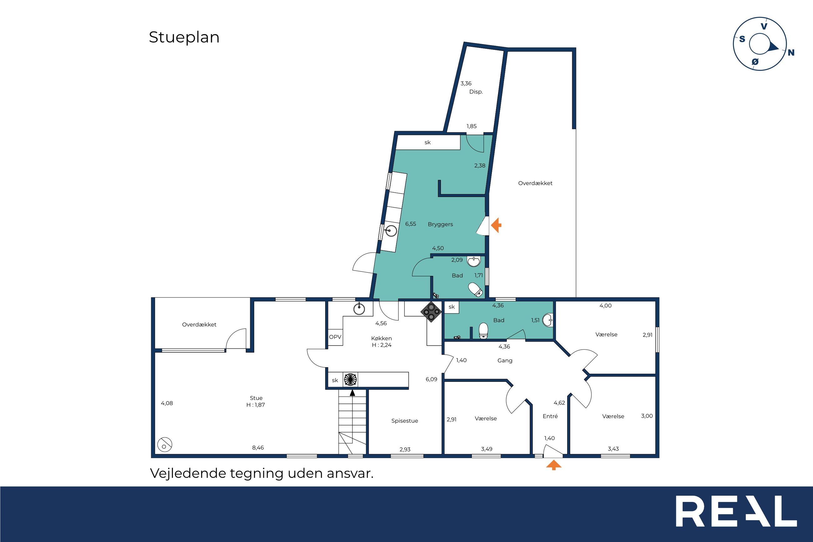 I stueplan findes desuden en værelsesafdeling med tre gode værelser og et badeværelse samt en baggang med bryggers, depotrum/vinrum og endnu et badeværelse – alt sammen praktisk og gennemtænkt til familielivet.
