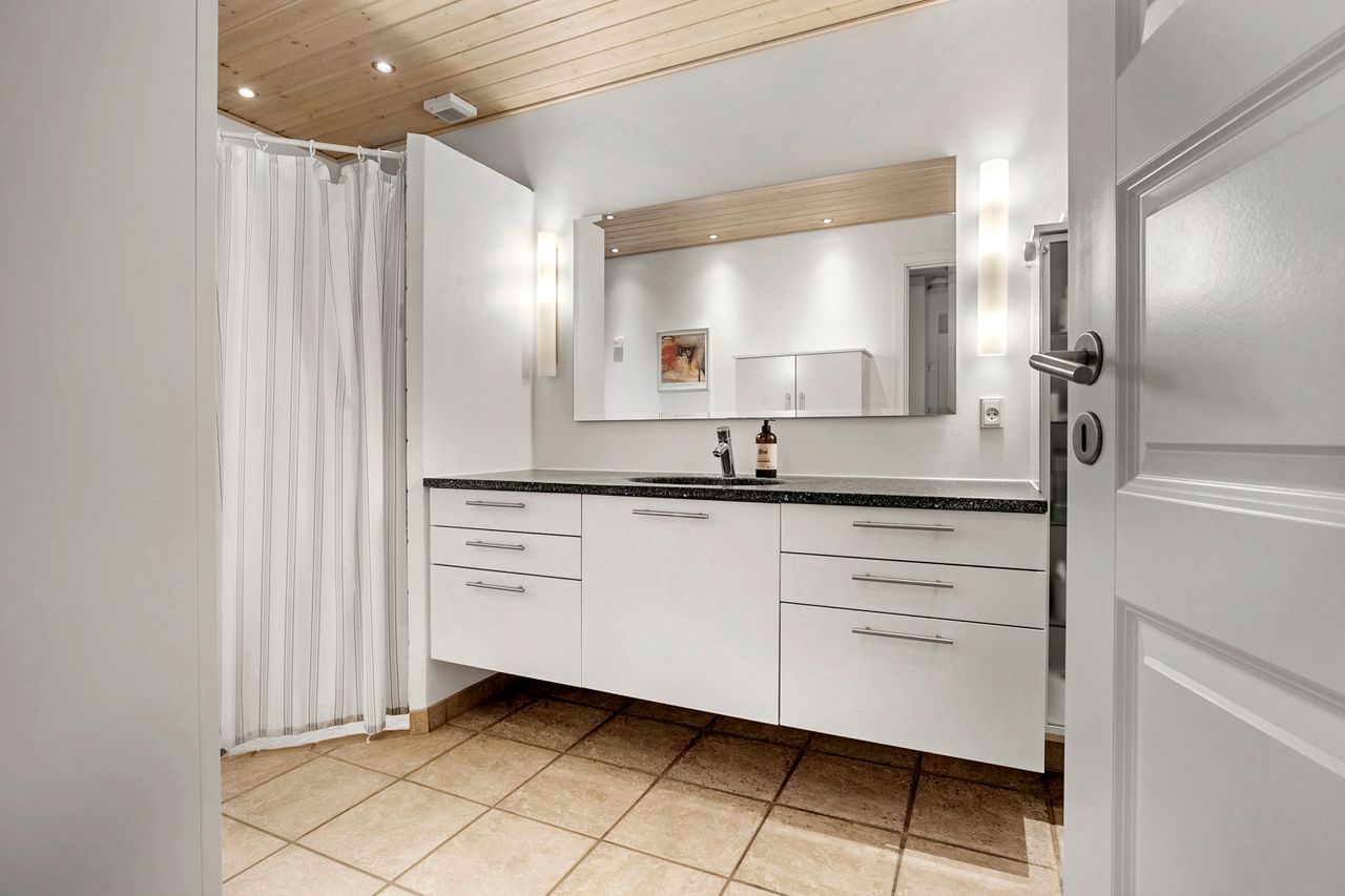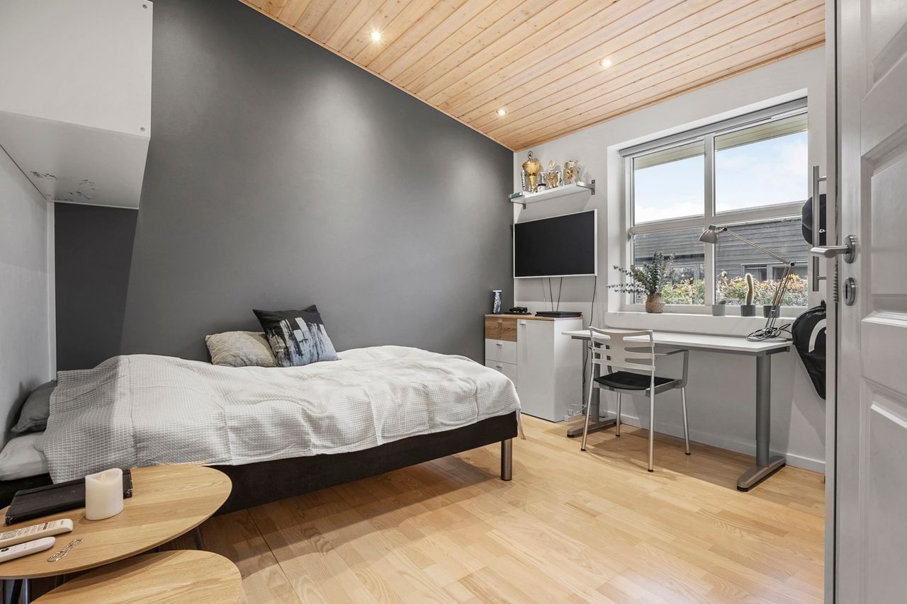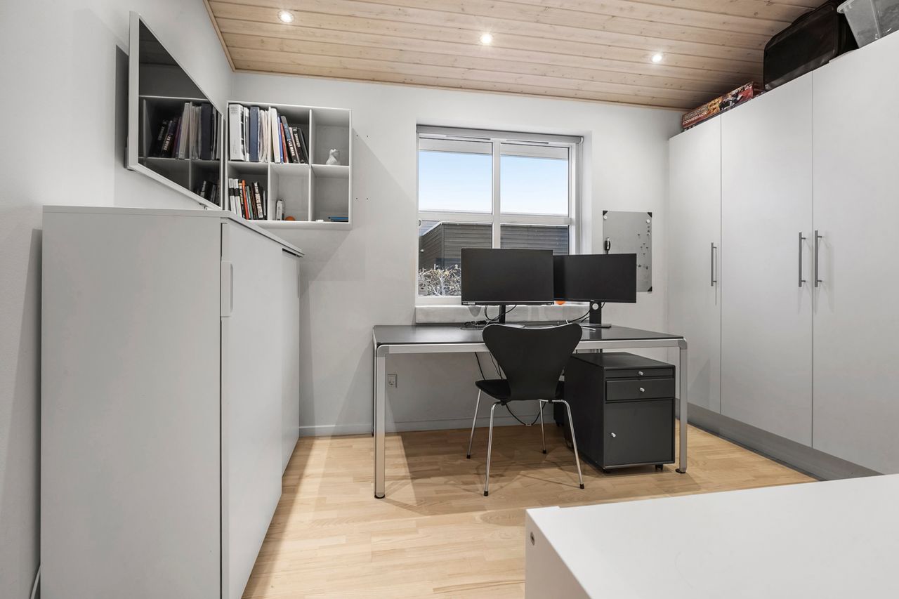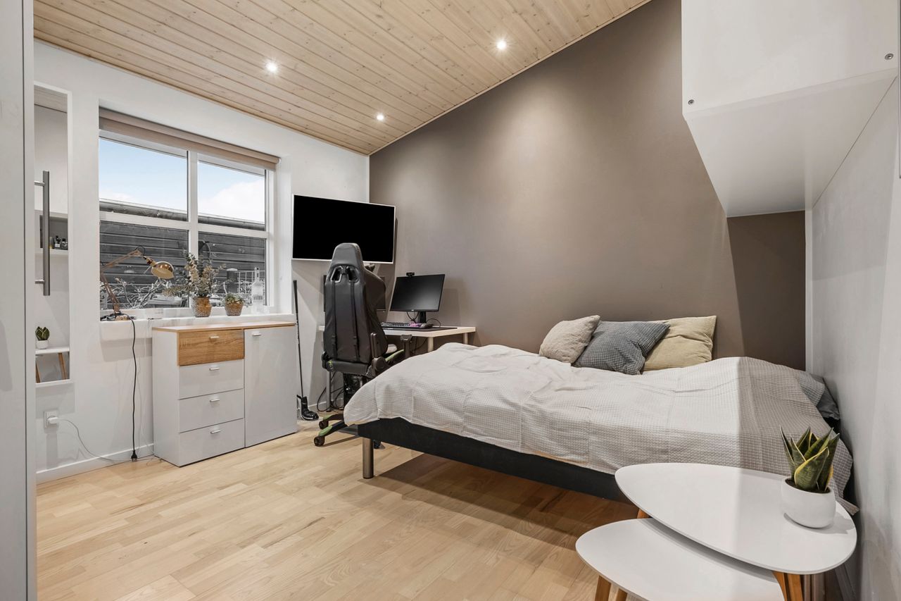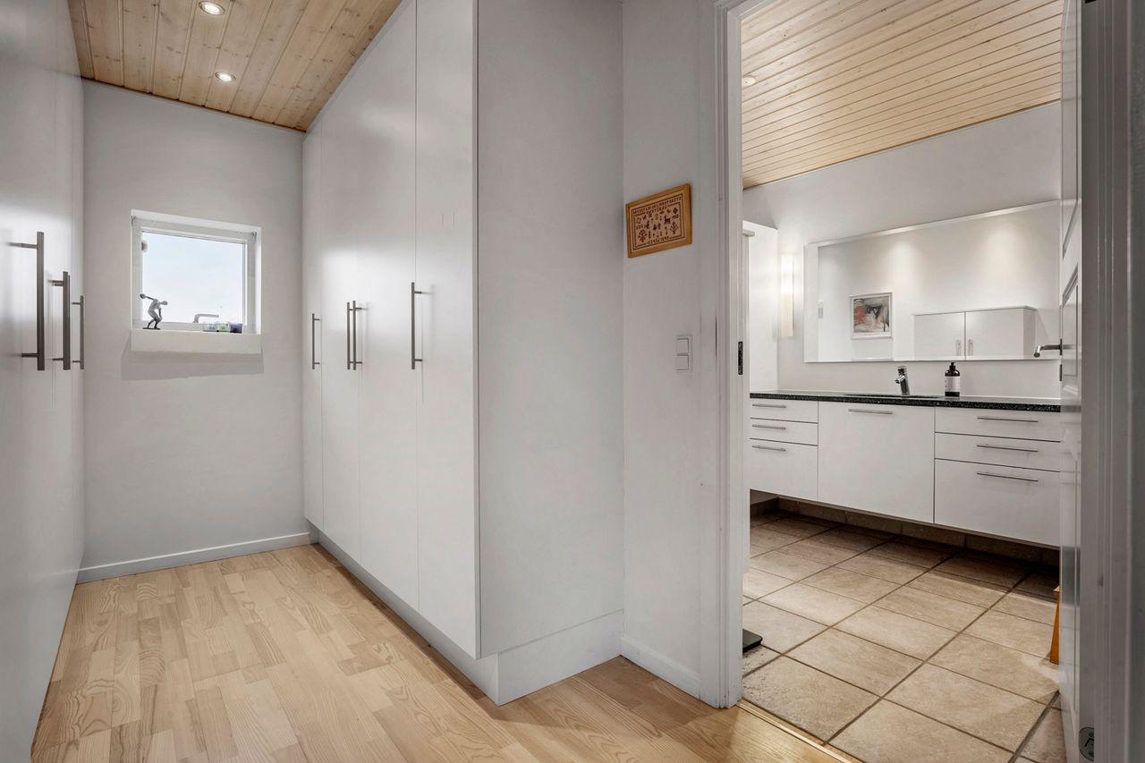 Fra den integrerede garage træder man tørskoet direkte ind i boligen, hvor entréen giver adgang til et praktisk bryggers med god skabsplads og vaskemiljø. Huset er gennemtænkt opdelt i en børne- og en forældreafdeling. I børneafdelingen findes to rummelige værelser og et badeværelse, mens forældreafdelingen byder på soveværelse med walk-through closet og et stort, elegant badeværelse. Derudover findes et ekstra værelse, som i dag er indrettet som kontor — også oplagt til endnu et børneværelse.