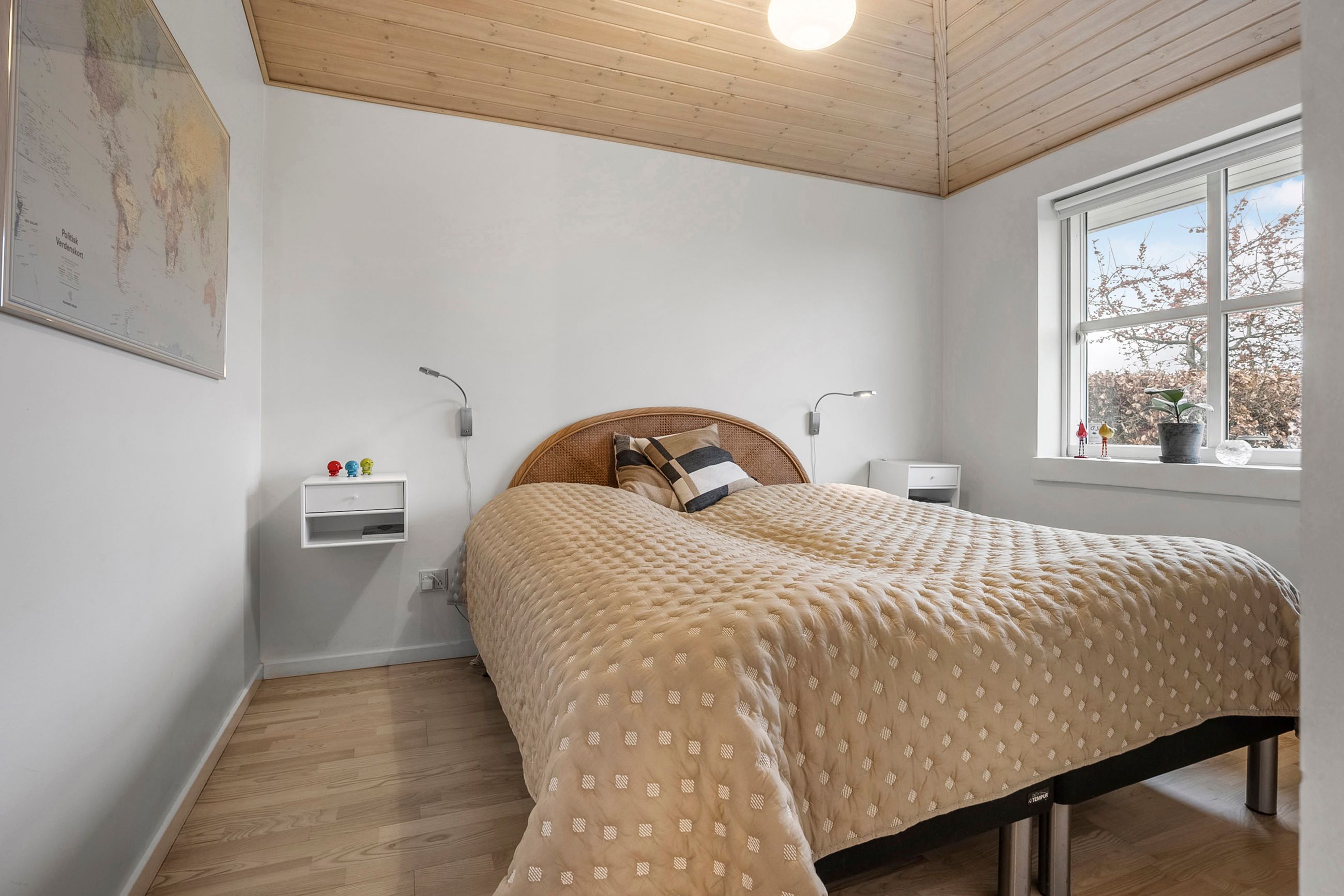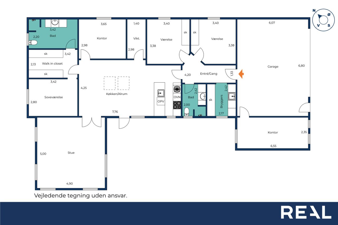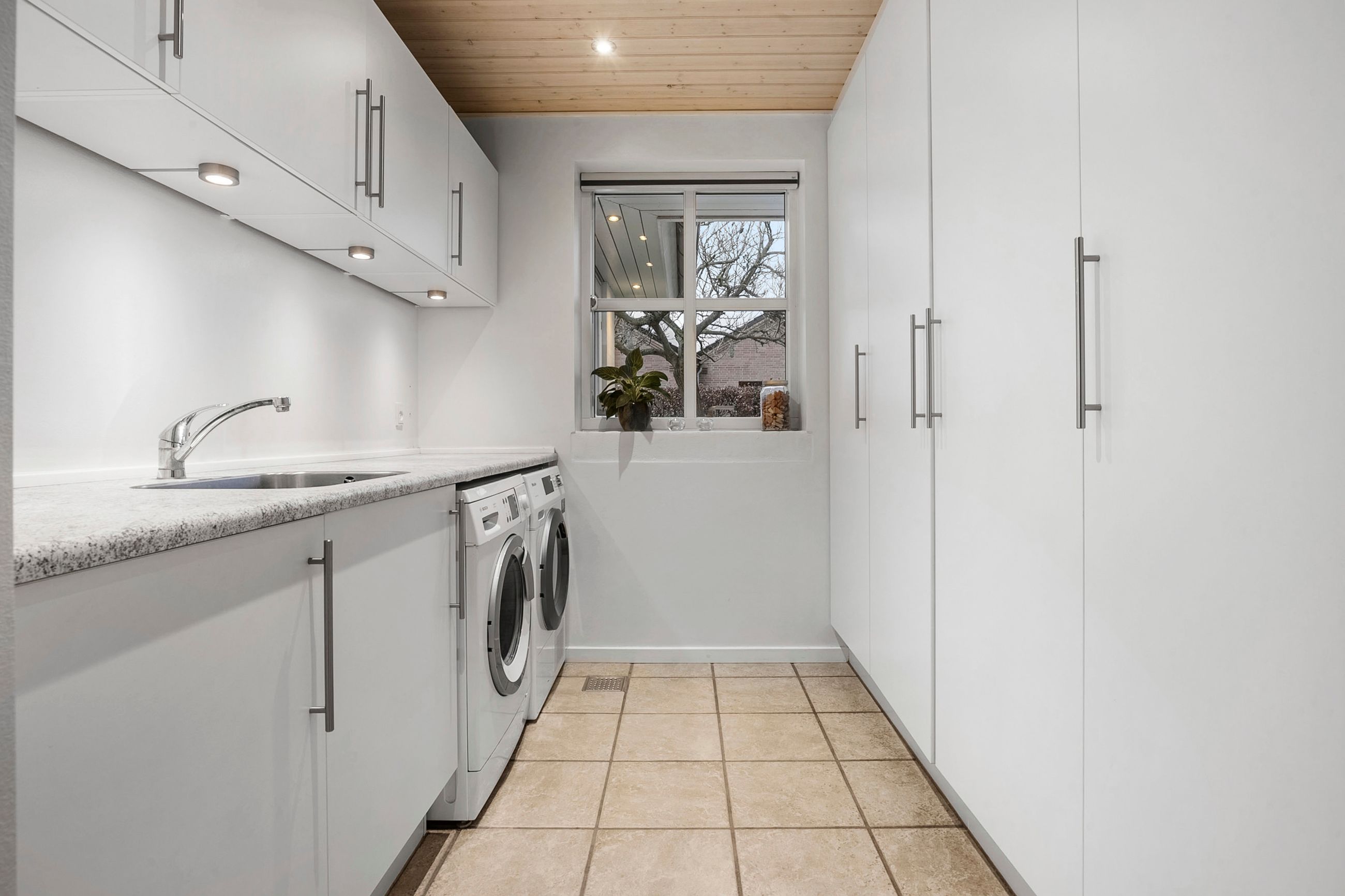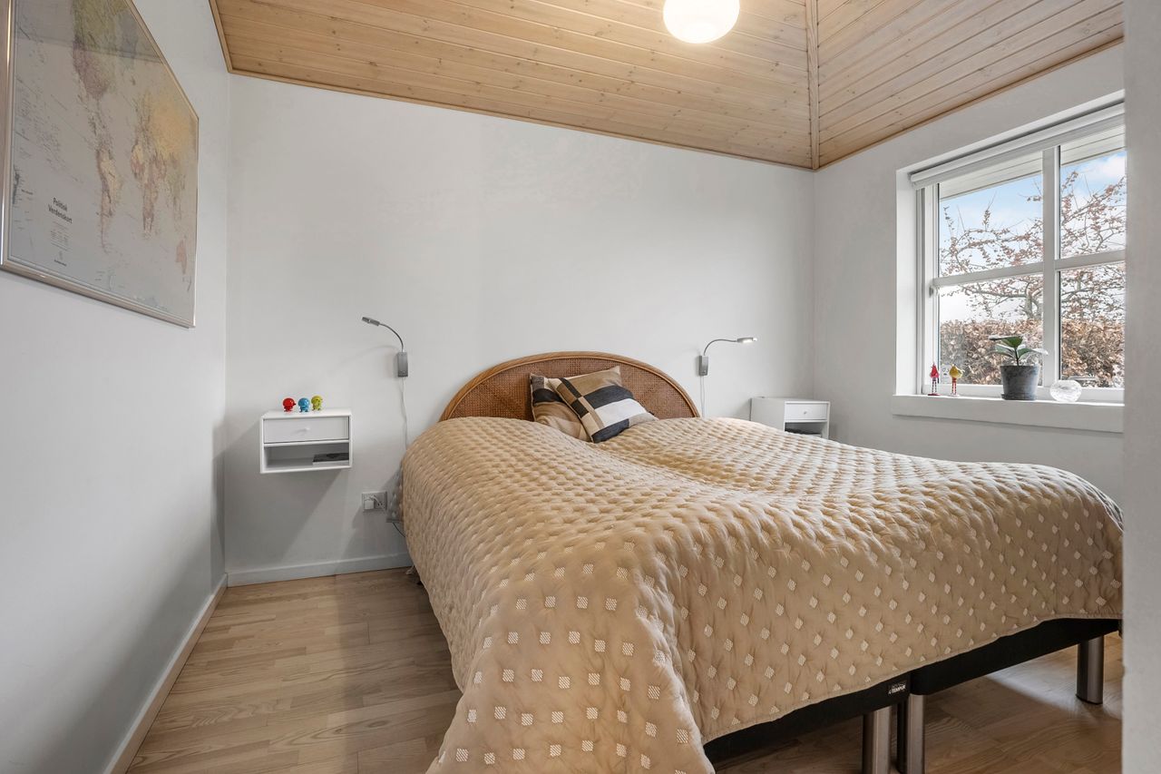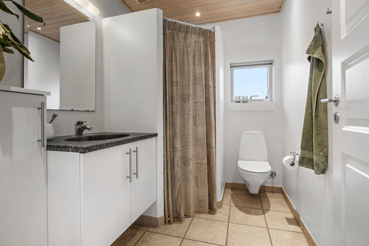 Fra den integrerede garage træder man tørskoet direkte ind i boligen, hvor entréen giver adgang til et praktisk bryggers med god skabsplads og vaskemiljø. Huset er gennemtænkt opdelt i en børne- og en forældreafdeling. I børneafdelingen findes to rummelige værelser og et badeværelse, mens forældreafdelingen byder på soveværelse med walk-through closet og et stort, elegant badeværelse. Derudover findes et ekstra værelse, som i dag er indrettet som kontor — også oplagt til endnu et børneværelse.