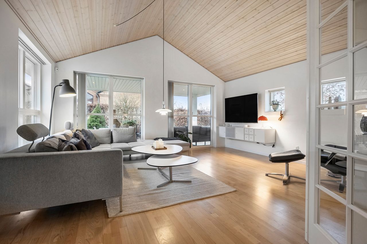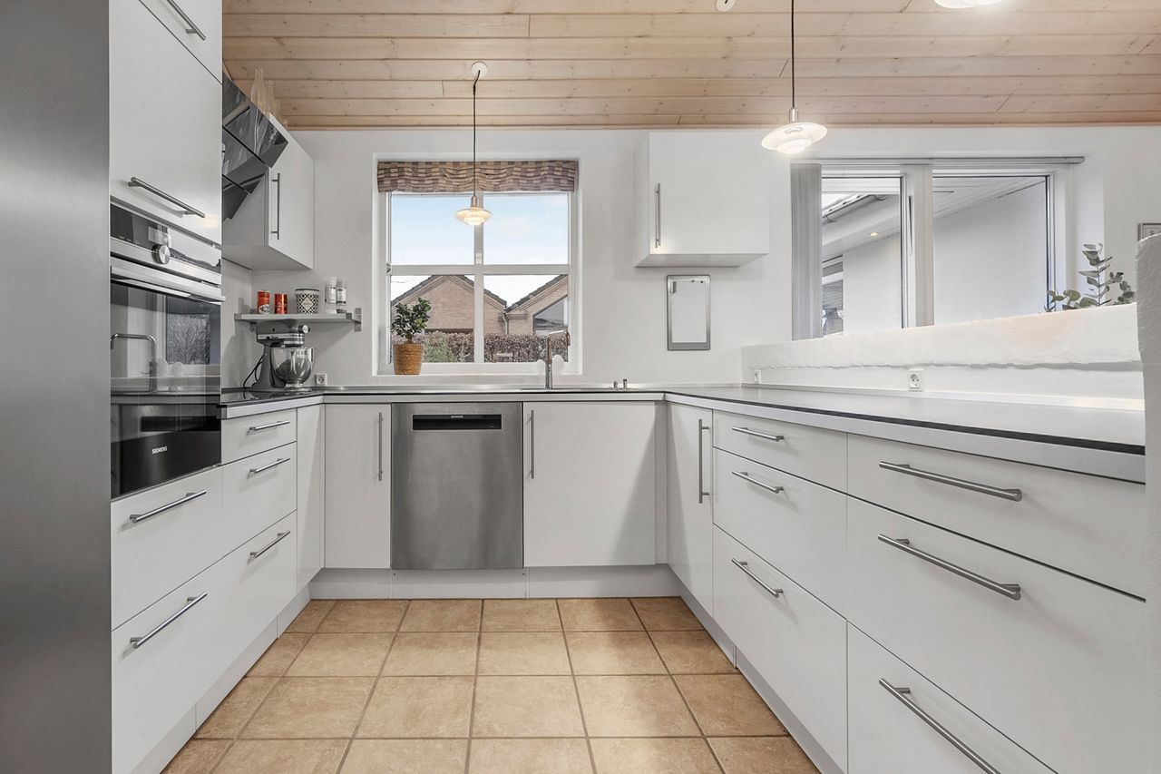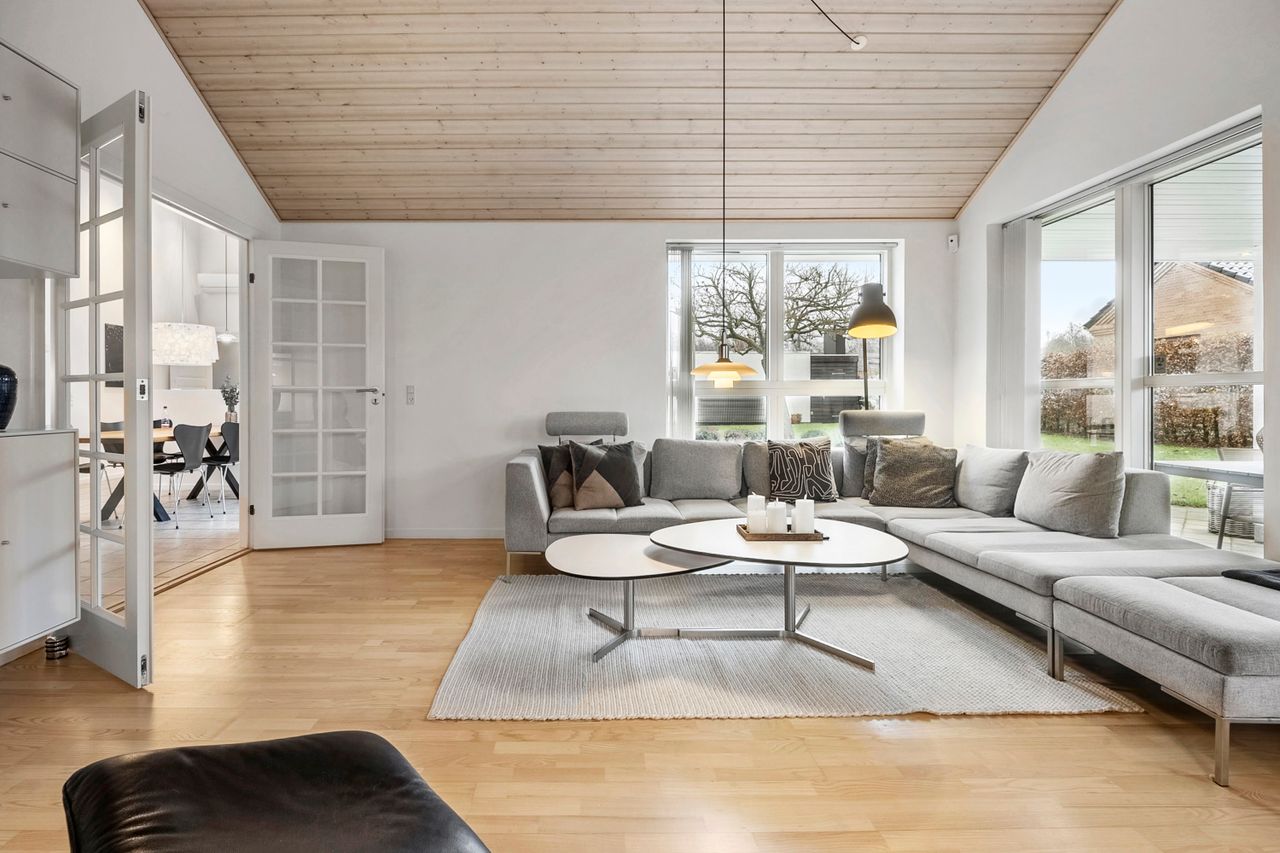 Boligens naturlige samlingspunkt er det åbne køkken-alrum, hvor loft til kip og ovenlysvinduer skaber en luftig og lys atmosfære. Det stilrene køkken ligger i forlængelse af spiseområdet og rummer plads til både hverdag og gæster, mens et praktisk viktualierum sørger for ekstra opbevaring. Fra alrummet fører dobbelte franske døre ind til opholdsstuen, som med sine store vinduespartier og loft til kip fremstår som et lyst og indbydende rum til afslapning og samvær.