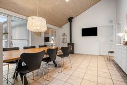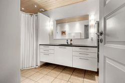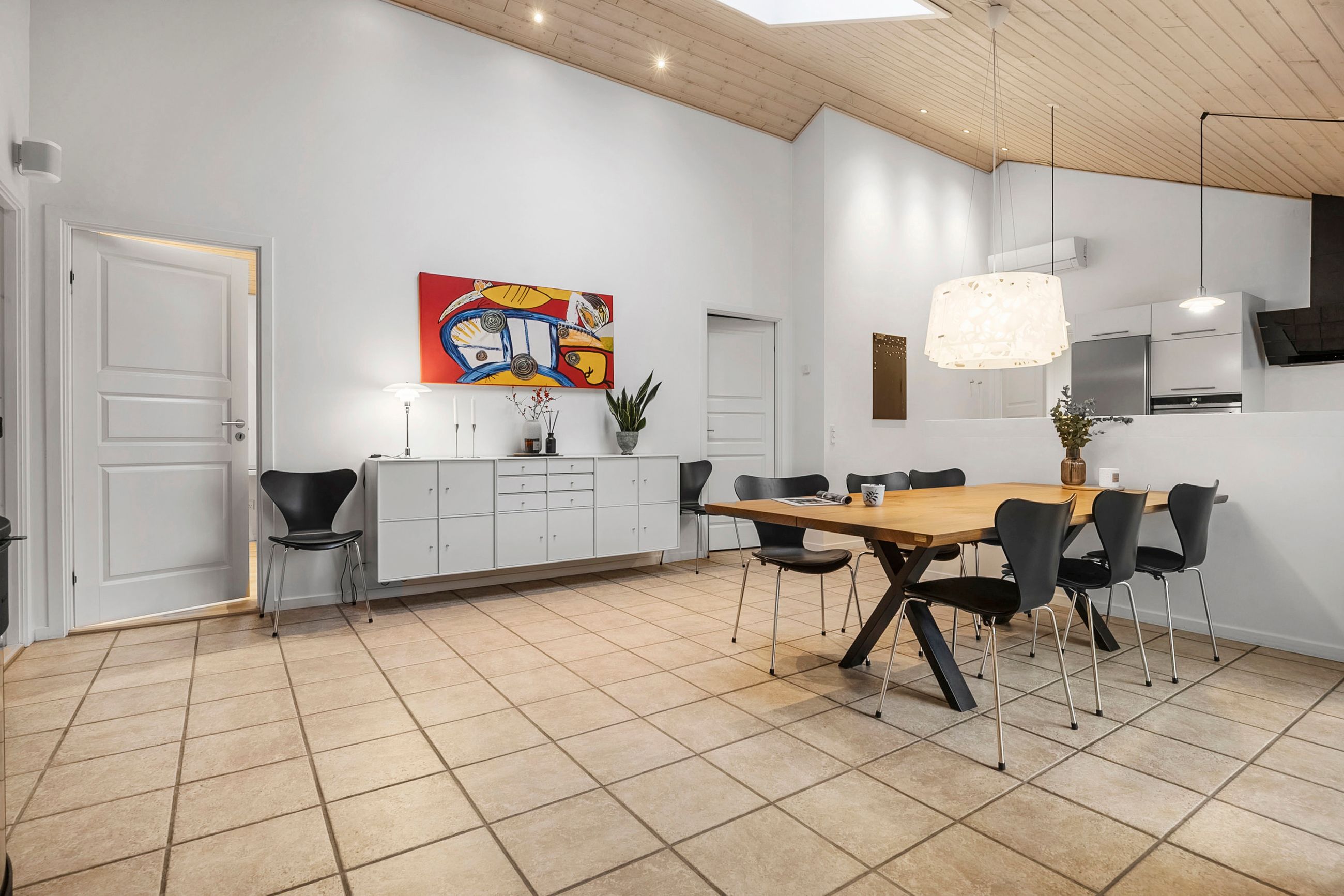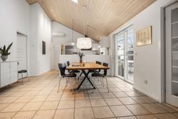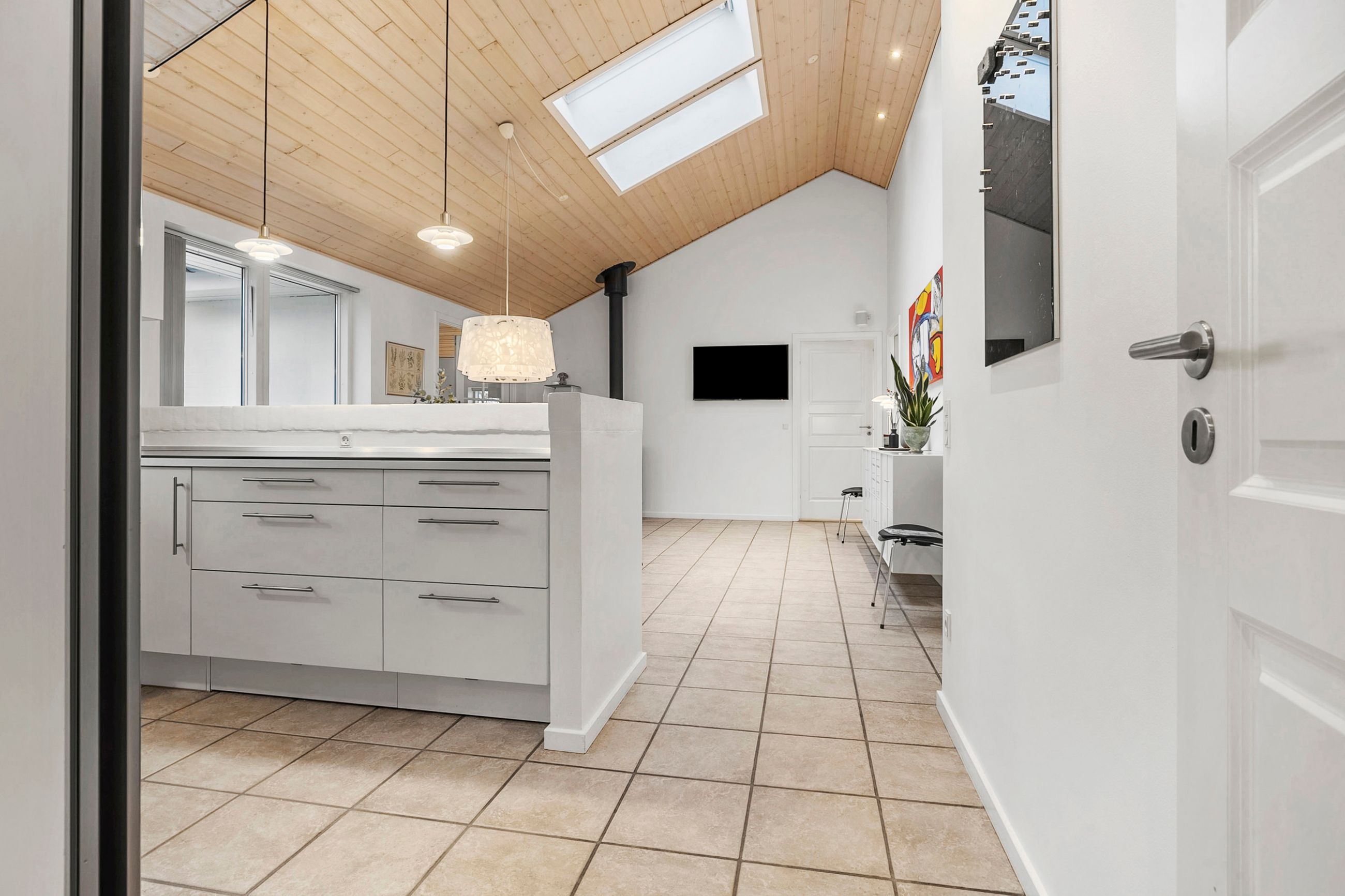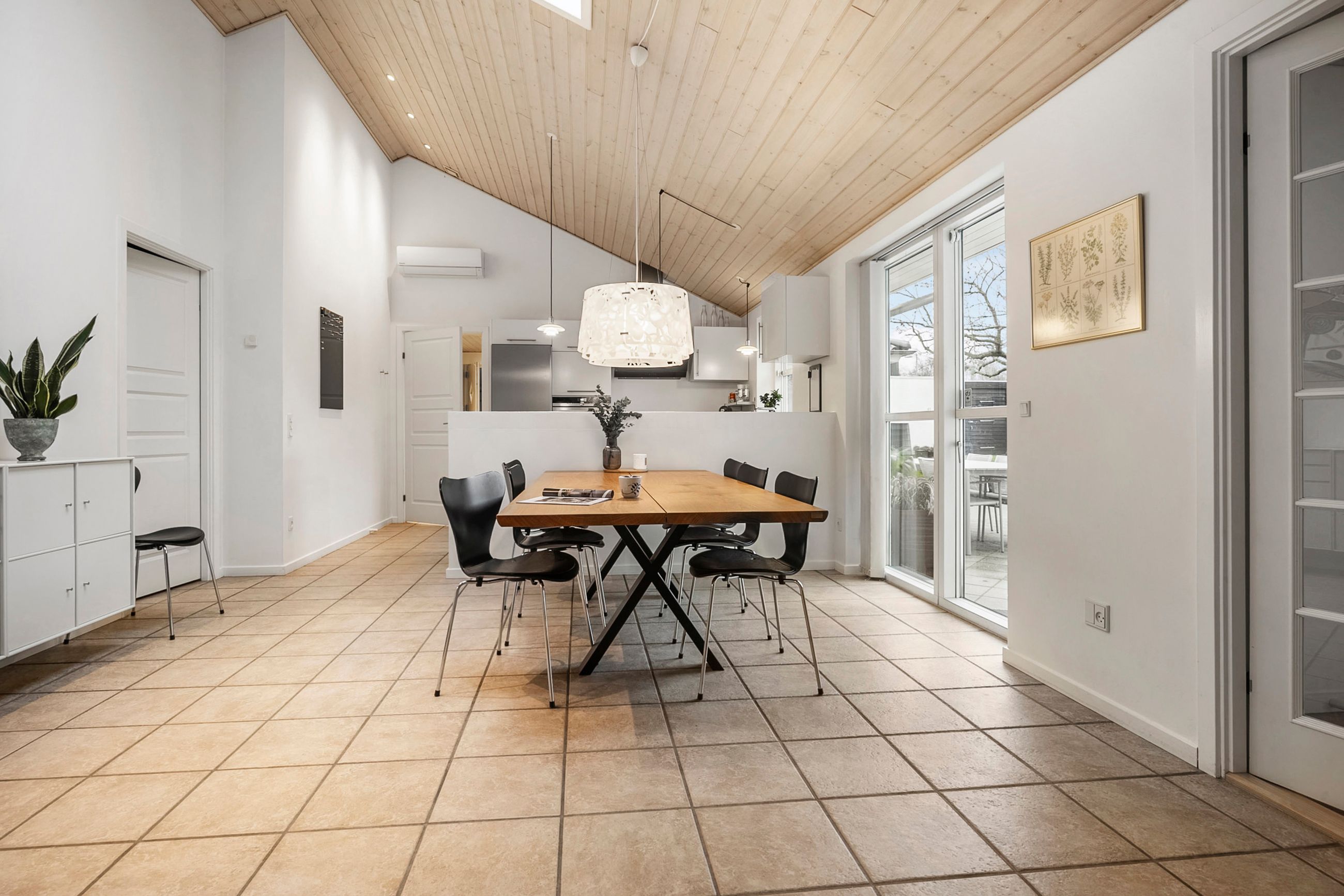 Boligens naturlige samlingspunkt er det åbne køkken-alrum, hvor loft til kip og ovenlysvinduer skaber en luftig og lys atmosfære. Det stilrene køkken ligger i forlængelse af spiseområdet og rummer plads til både hverdag og gæster, mens et praktisk viktualierum sørger for ekstra opbevaring. Fra alrummet fører dobbelte franske døre ind til opholdsstuen, som med sine store vinduespartier og loft til kip fremstår som et lyst og indbydende rum til afslapning og samvær.