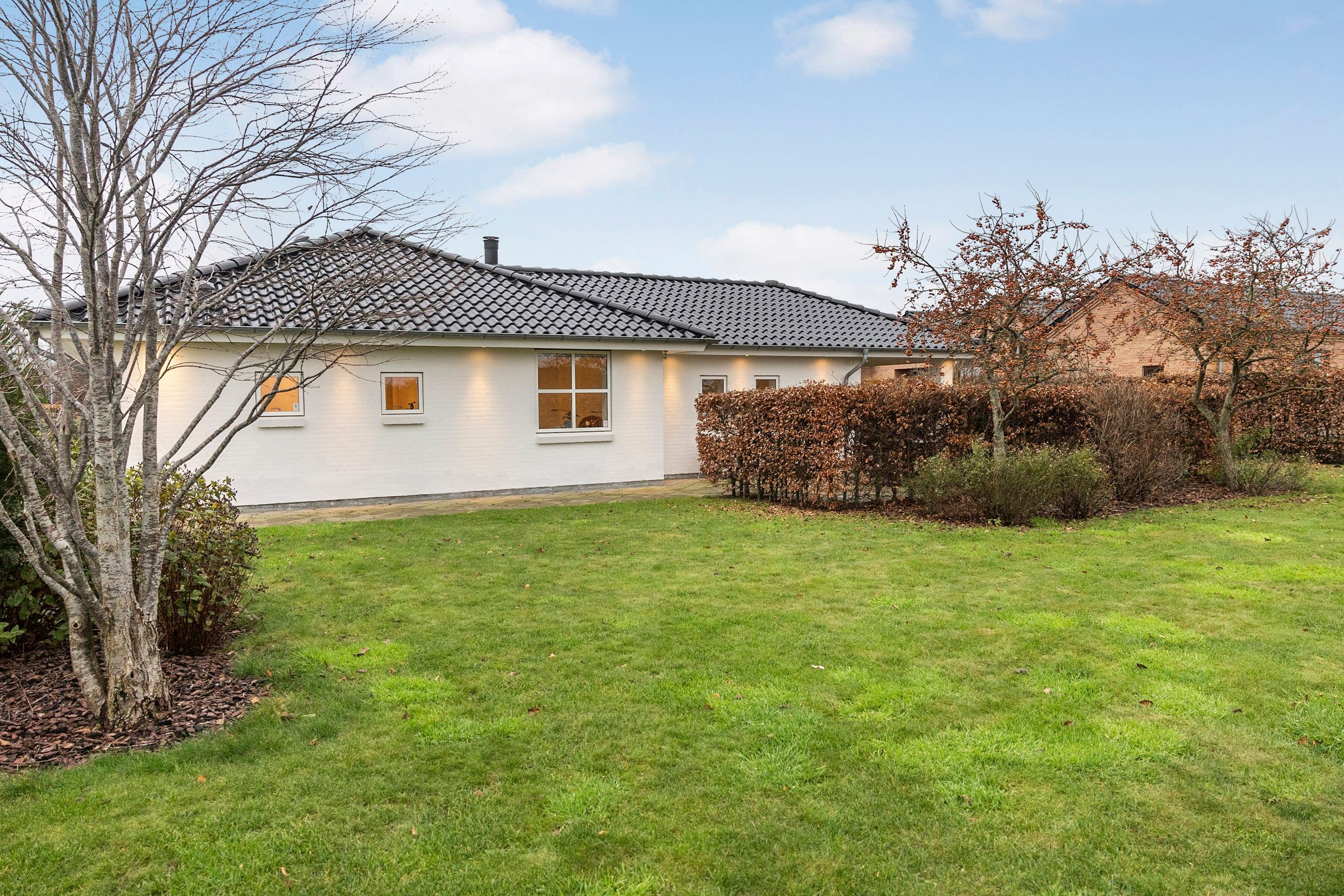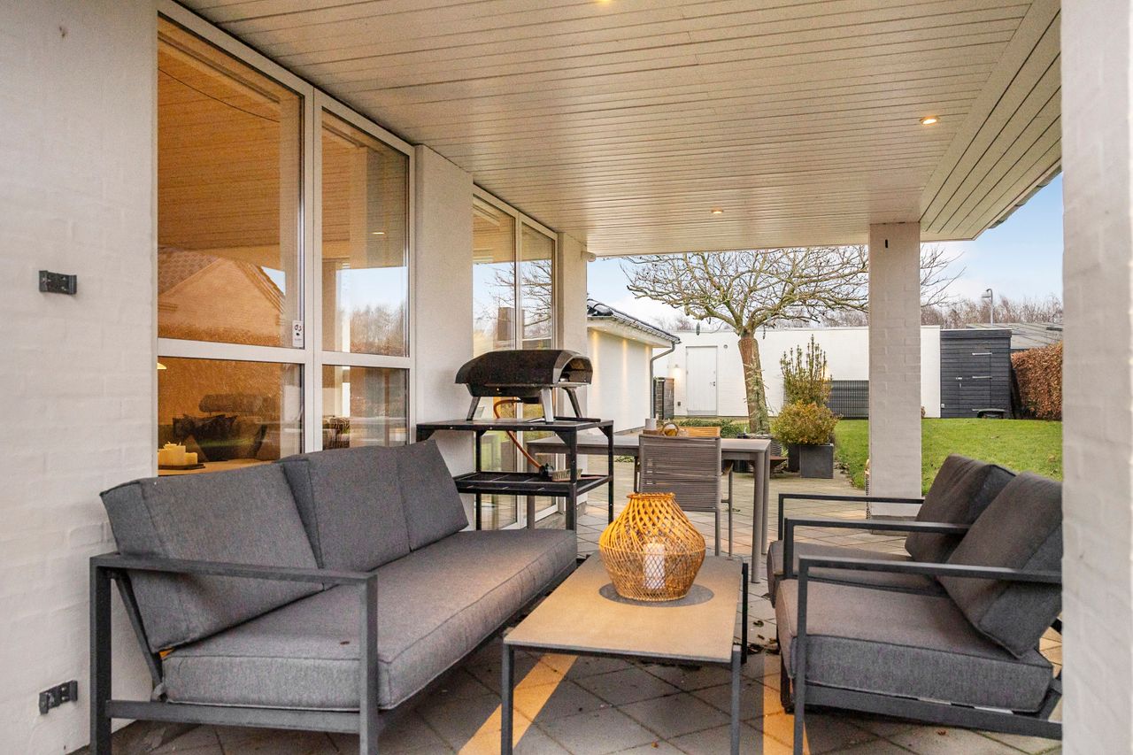 Udendørs byder ejendommen på et smukt og velanlagt have- og terrassemiljø. Flisebelægning hele vejen rundt om huset, flere solrige terrasser samt en overdækket terrasse giver mulighed for at nyde udelivet hele dagen. Den opvoksede have skaber privatliv og grønne omgivelser, som fuldender denne skønne ejendom – en rummelig og indflytningsklar familievilla i et af Jellings mest attraktive kvarterer.