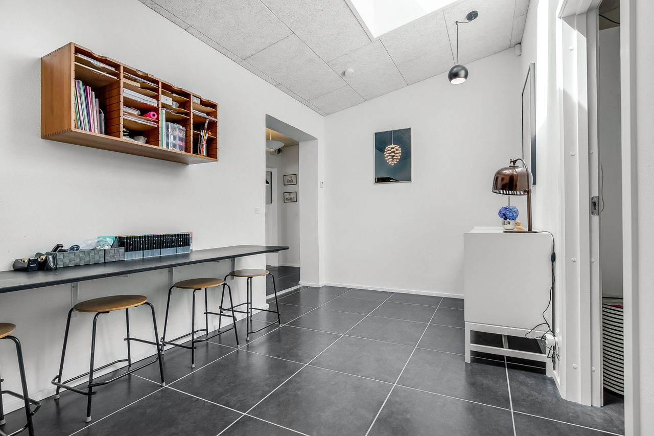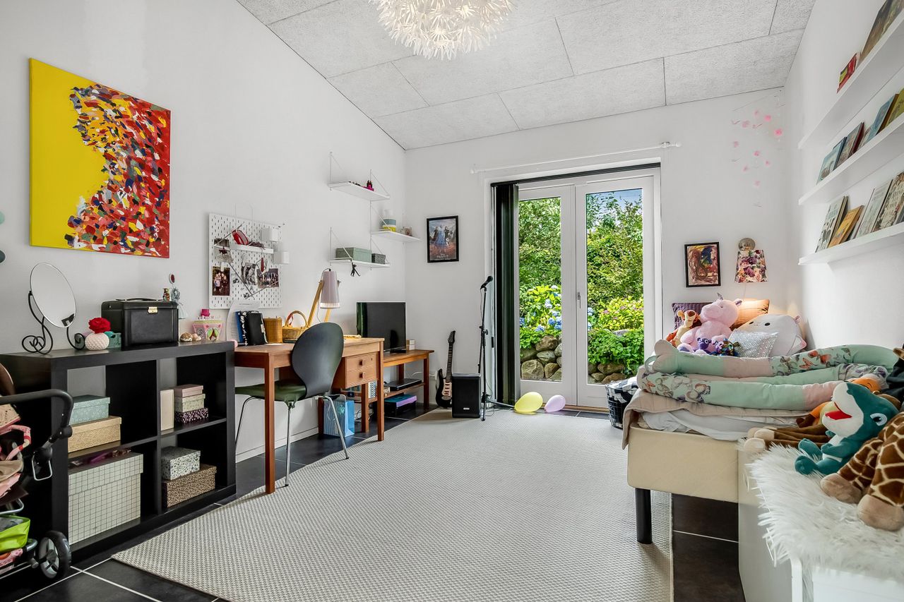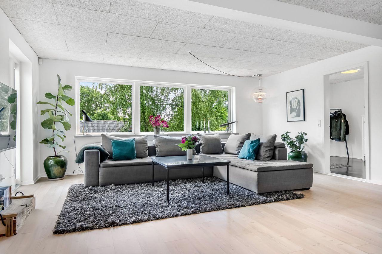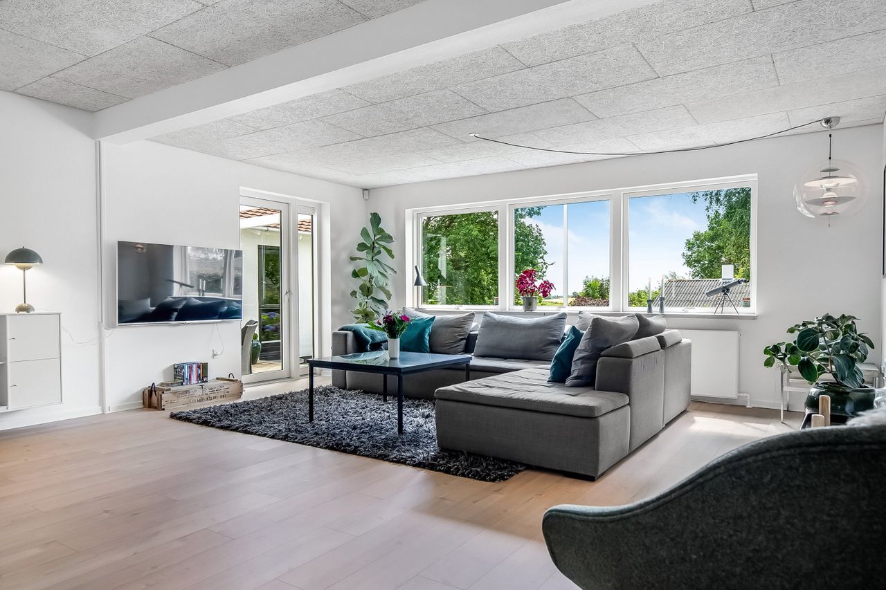 Boligen ligger højt på grunden, hvilket især mærkes i den store, lyse stue, hvor vinduerne åbner op for et flot kig over de grønne omgivelser. Stuen fungerer som hjemmets naturlige samlingspunkt med plads til både sofaafdeling og et stort spisebord. Herfra er der direkte adgang til en sydvendt terrassekrog, hvor solen og haven kan nydes i fulde drag.