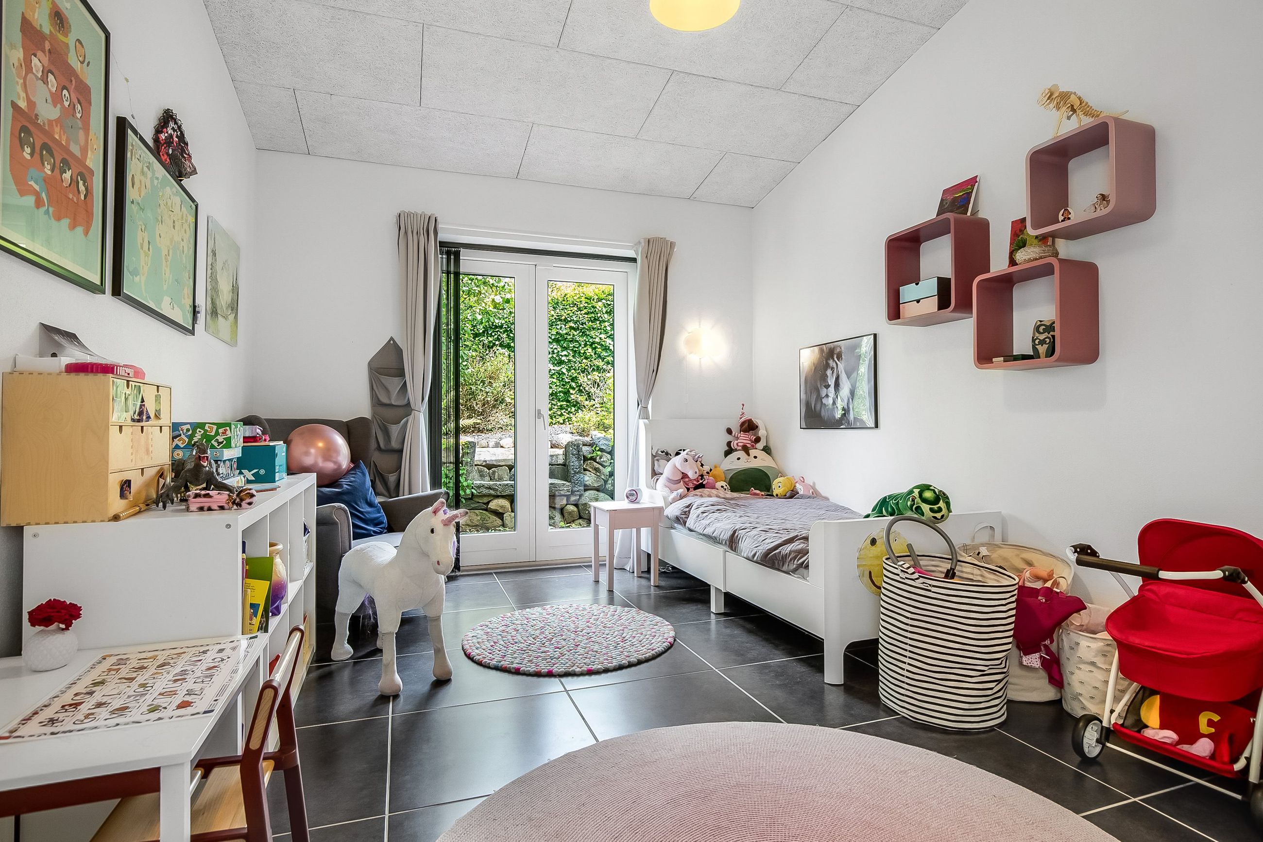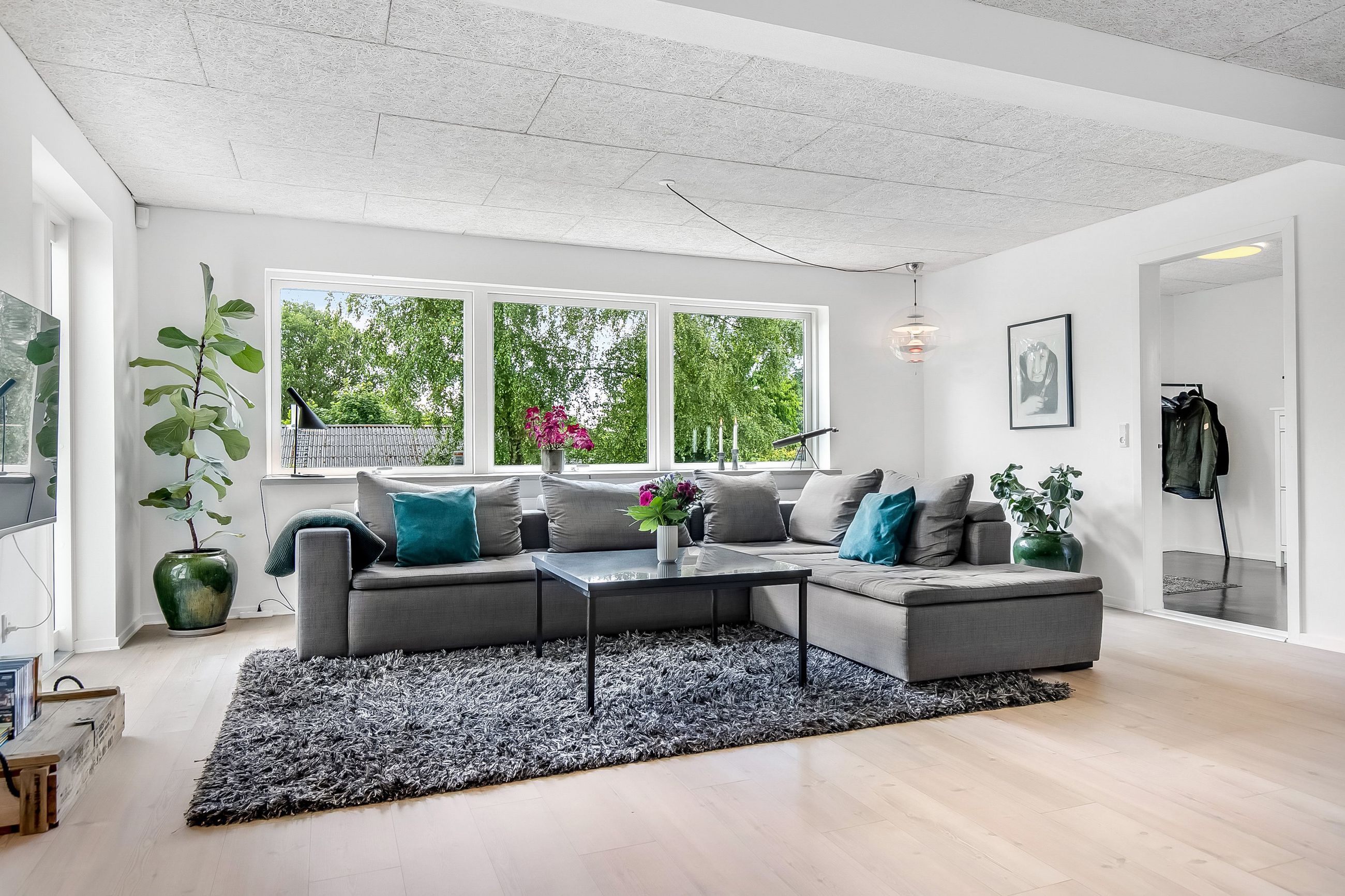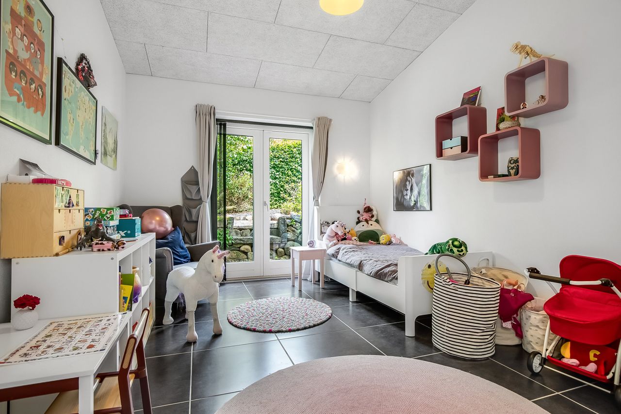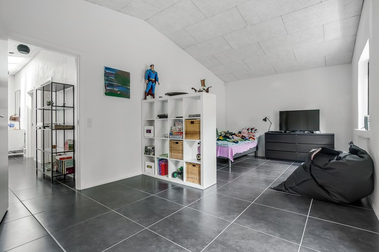 Boligen ligger højt på grunden, hvilket især mærkes i den store, lyse stue, hvor vinduerne åbner op for et flot kig over de grønne omgivelser. Stuen fungerer som hjemmets naturlige samlingspunkt med plads til både sofaafdeling og et stort spisebord. Herfra er der direkte adgang til en sydvendt terrassekrog, hvor solen og haven kan nydes i fulde drag.