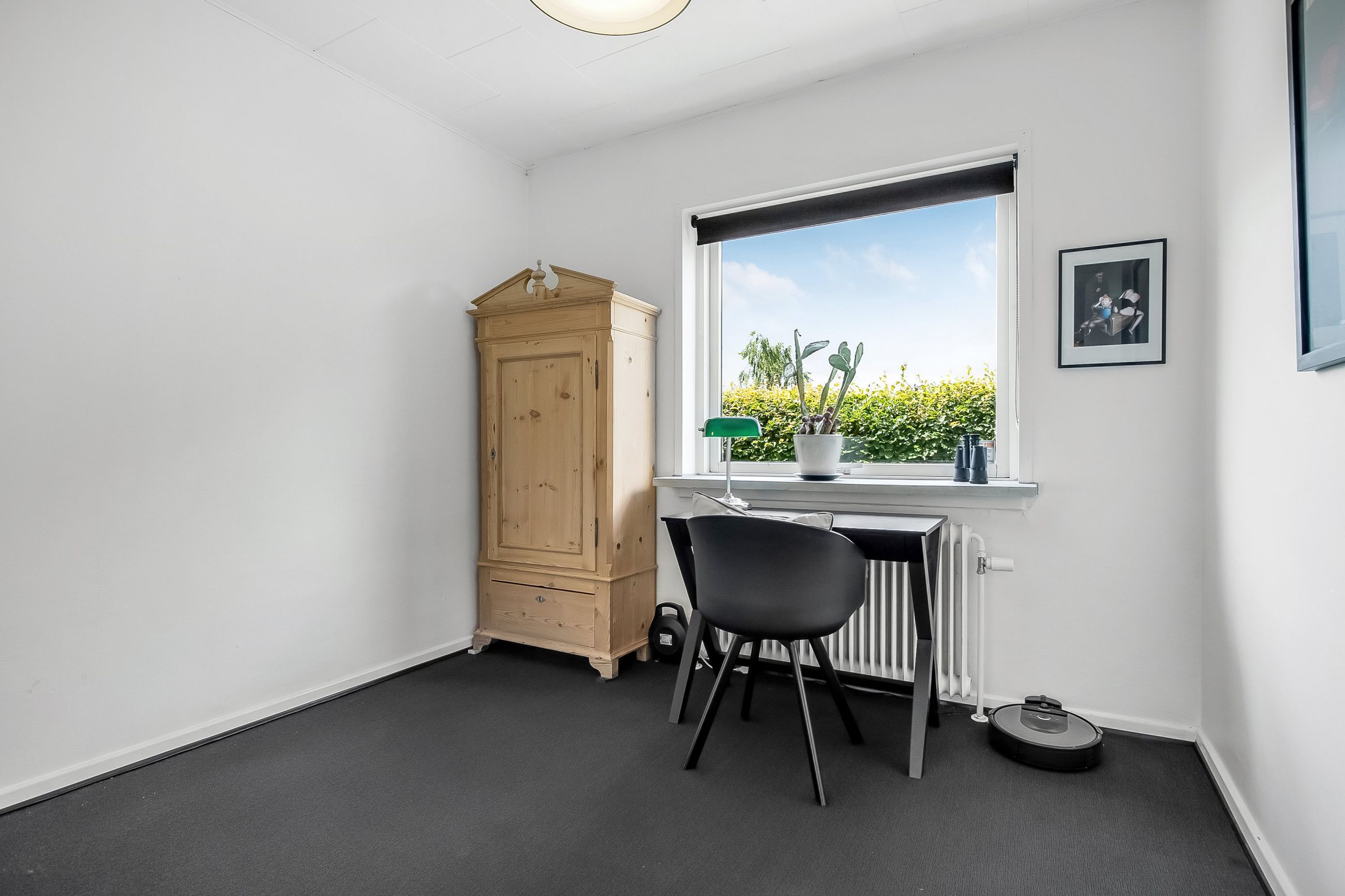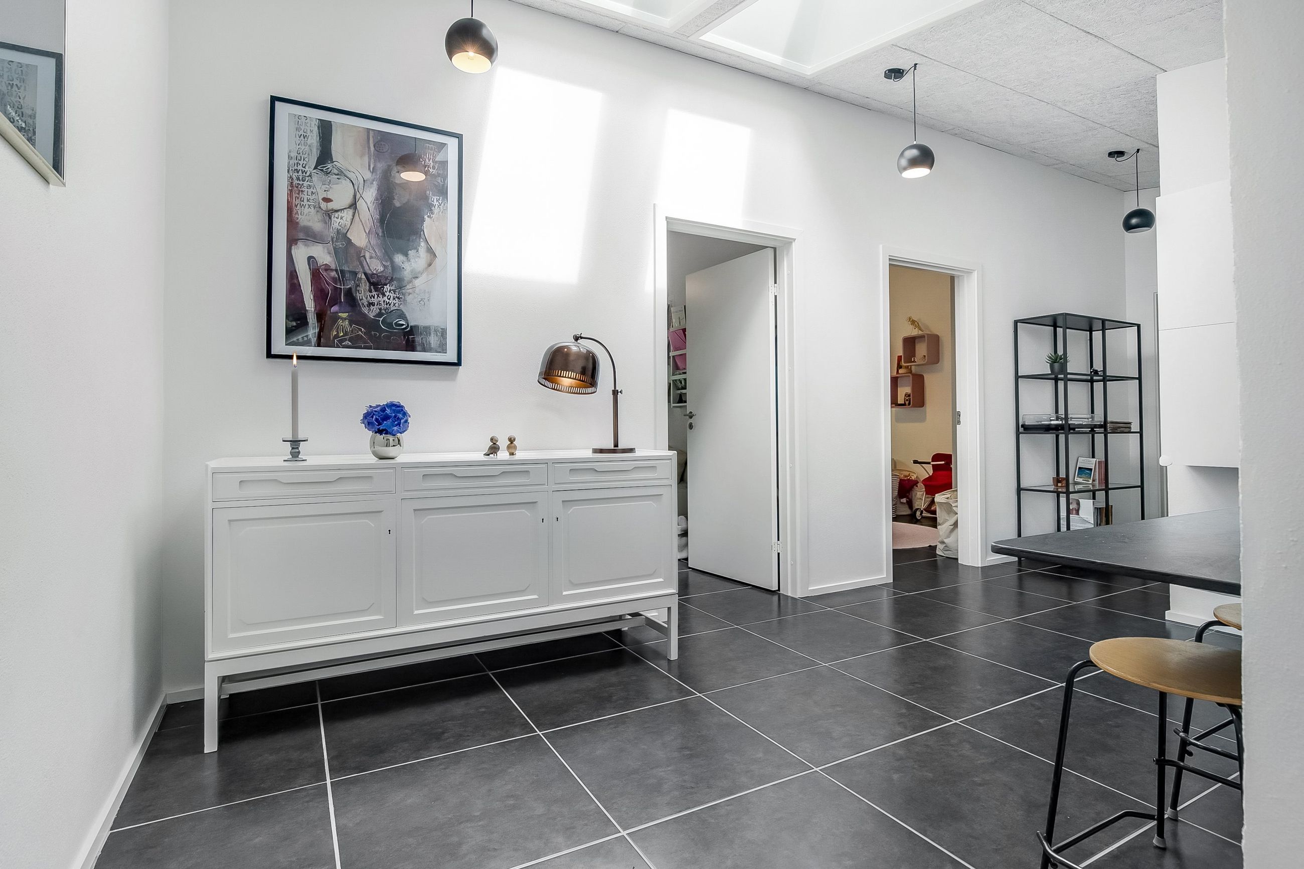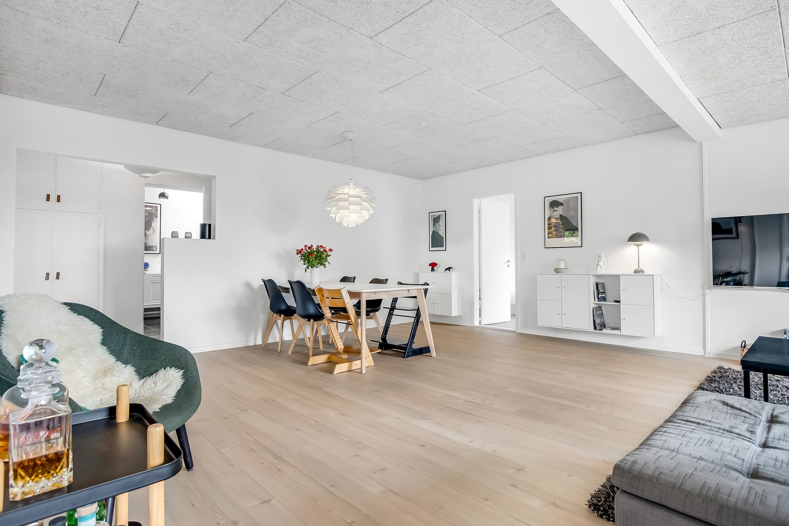 Boligen ligger højt på grunden, hvilket især mærkes i den store, lyse stue, hvor vinduerne åbner op for et flot kig over de grønne omgivelser. Stuen fungerer som hjemmets naturlige samlingspunkt med plads til både sofaafdeling og et stort spisebord. Herfra er der direkte adgang til en sydvendt terrassekrog, hvor solen og haven kan nydes i fulde drag.