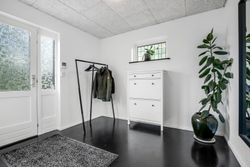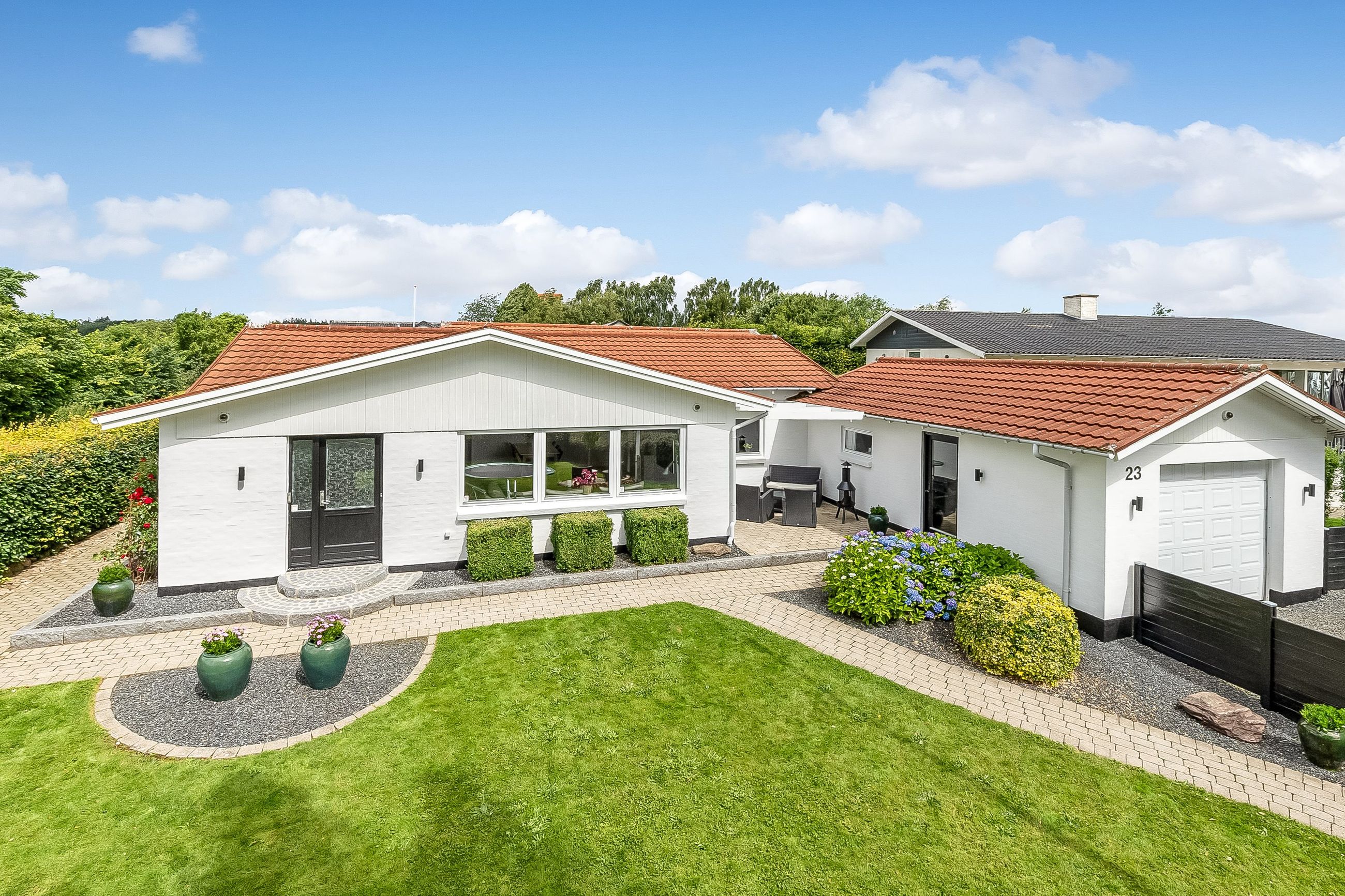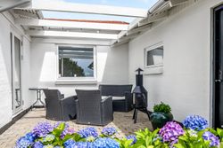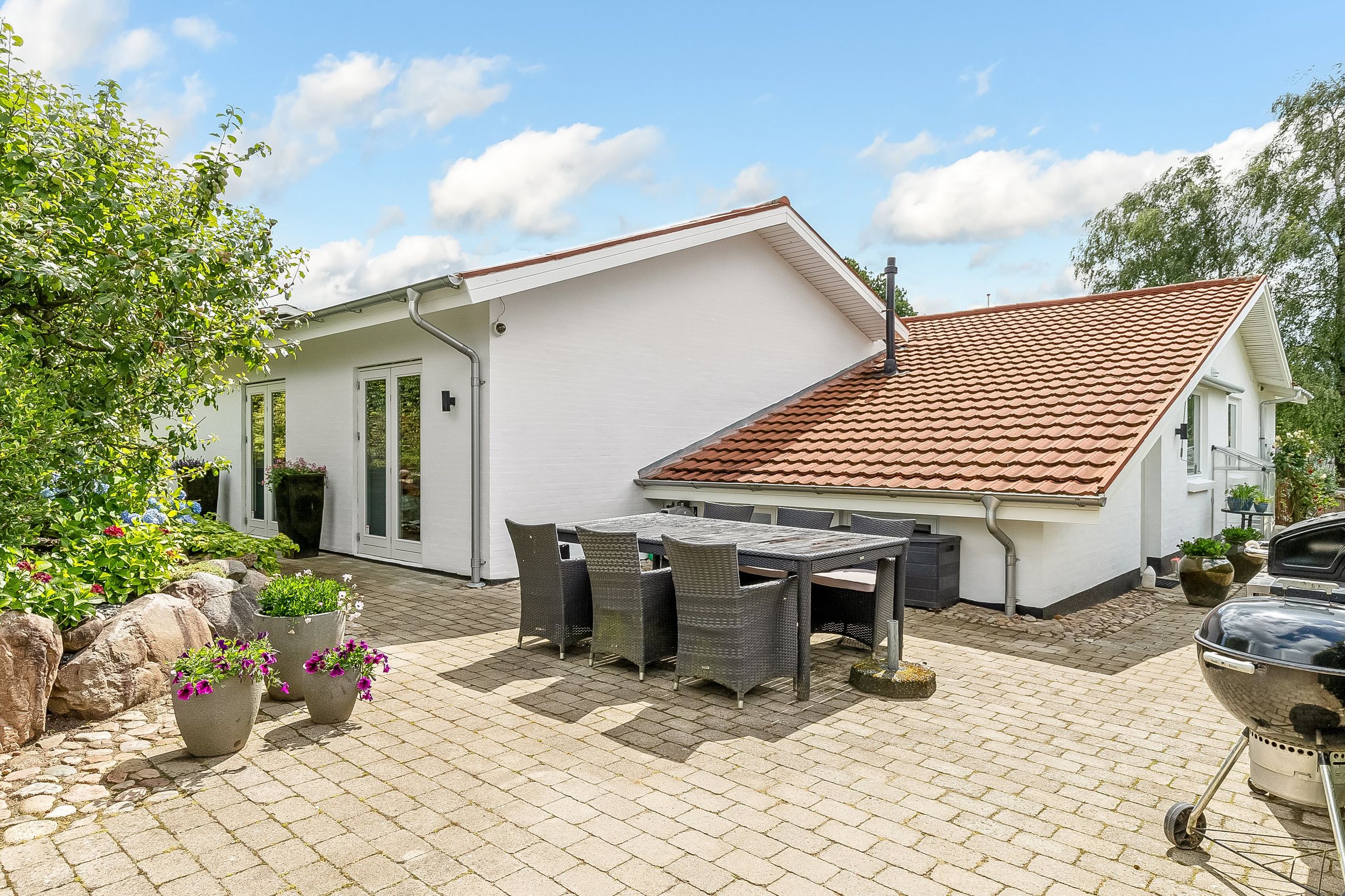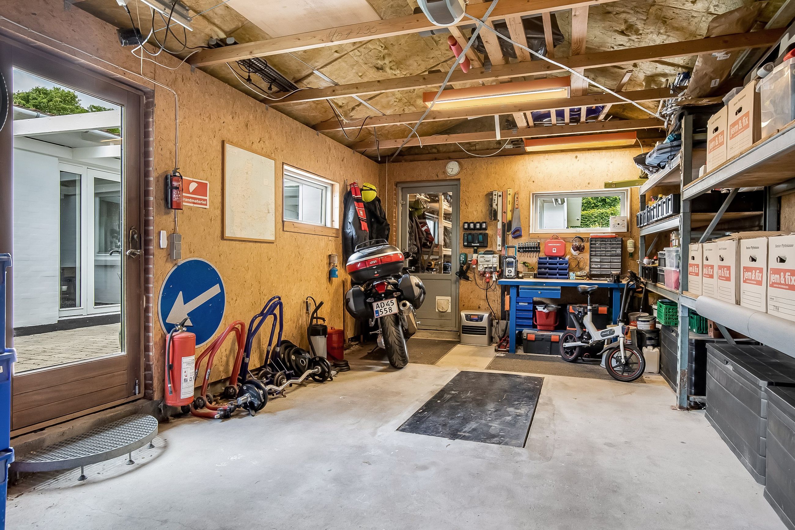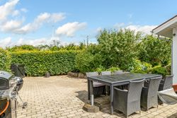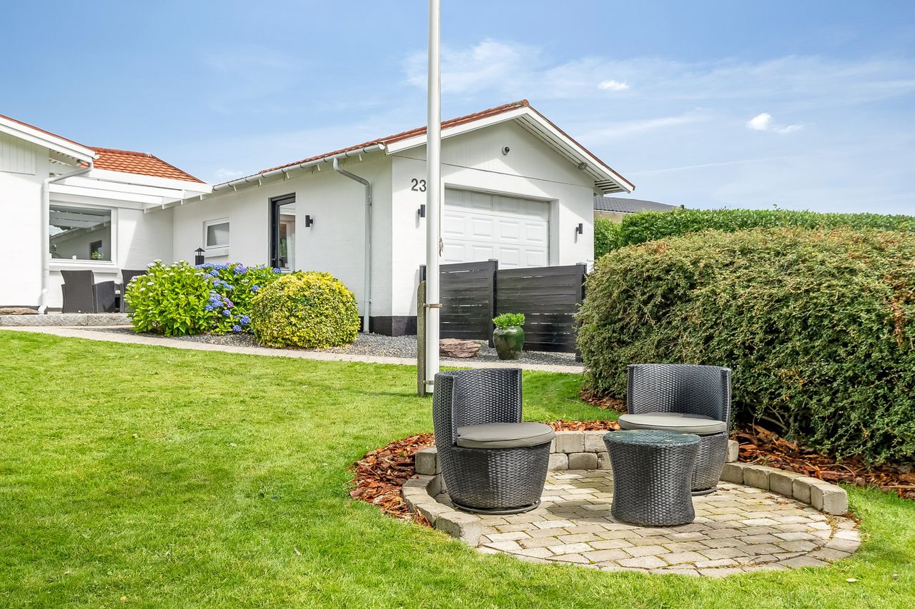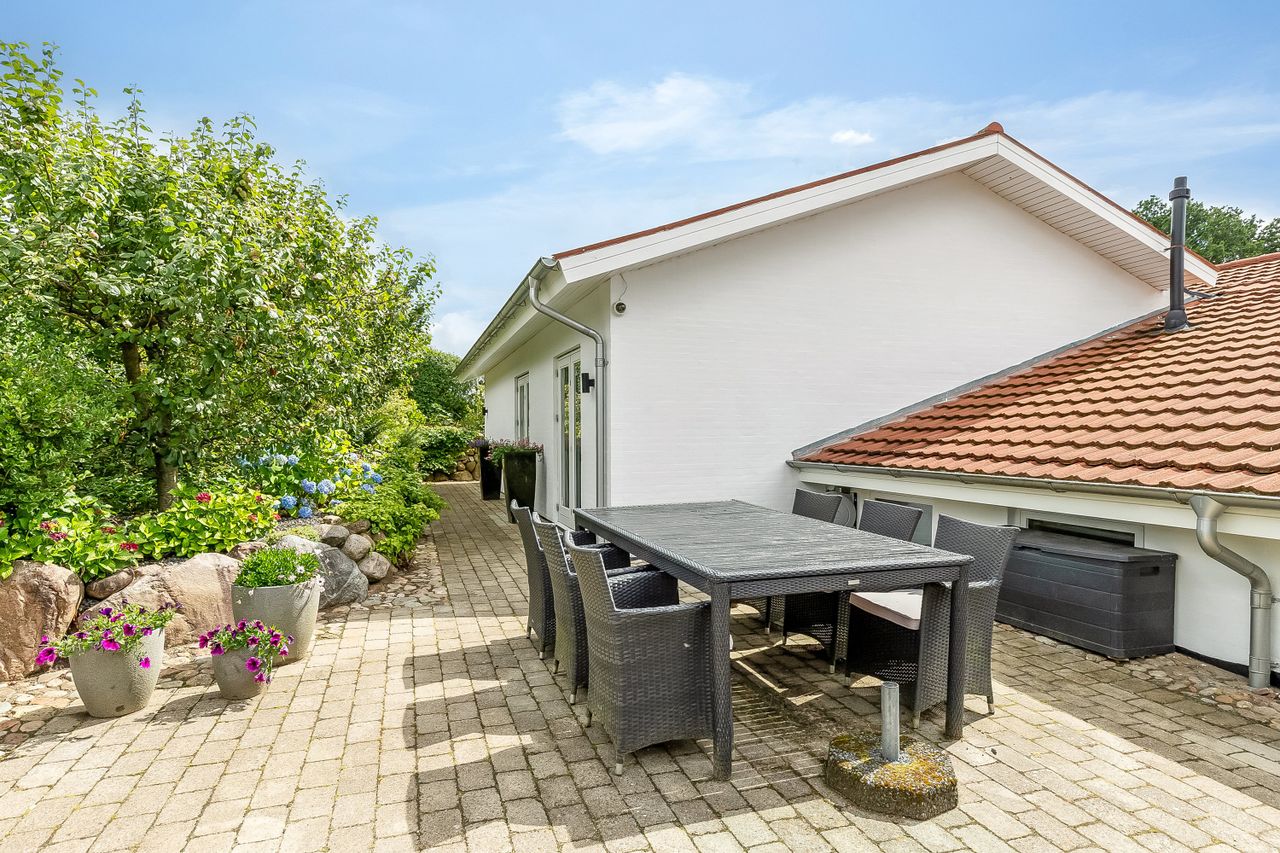 Udenfor venter endnu et hyggeligt terrassemiljø, den vestvendte terrasse, som danner den perfekte ramme om sommeraftener med sol, grill og hyggeligt samvær. Til ejendommen hører desuden en solid, muret garage med el-port, MC-lift og tilstødende redskabsrum – ideelt til både hobby og opbevaring.