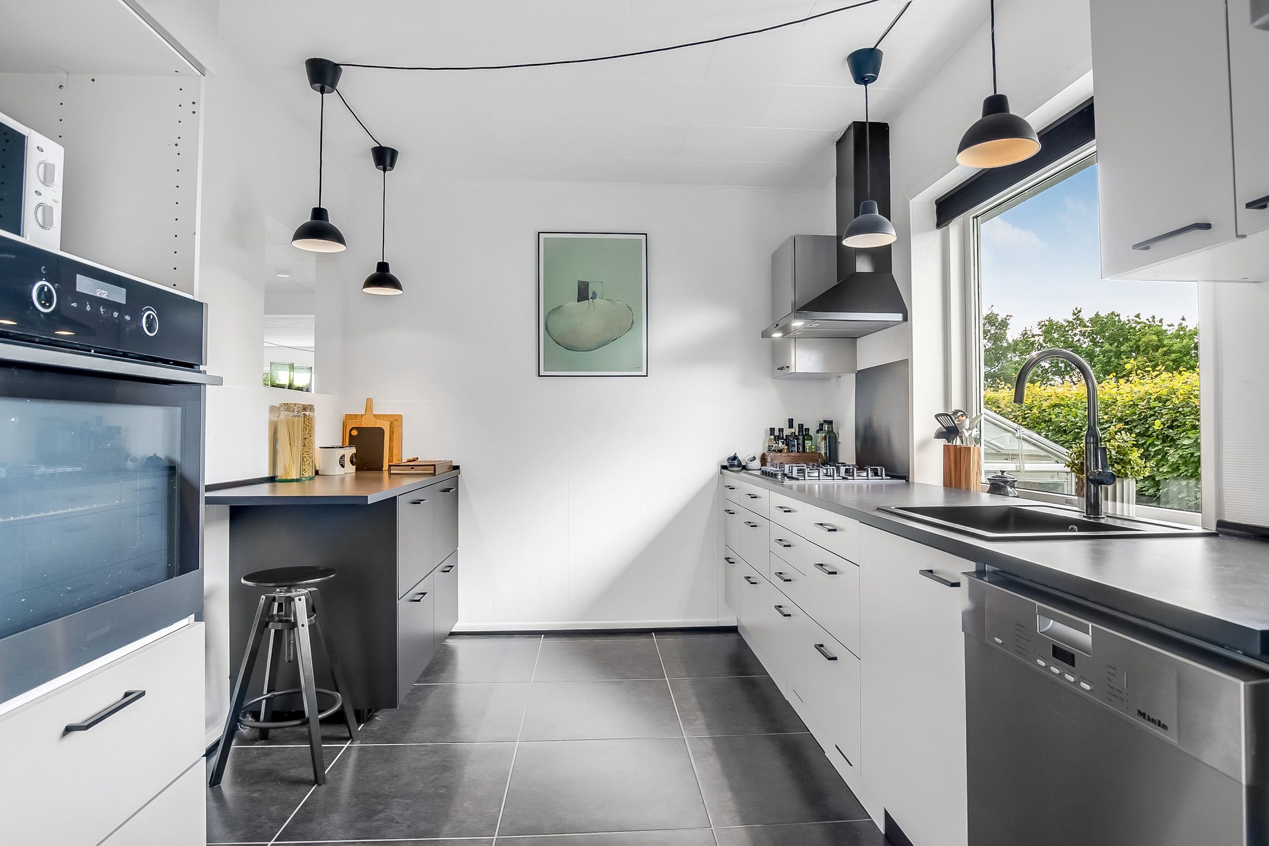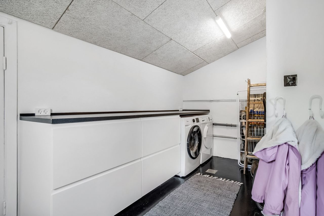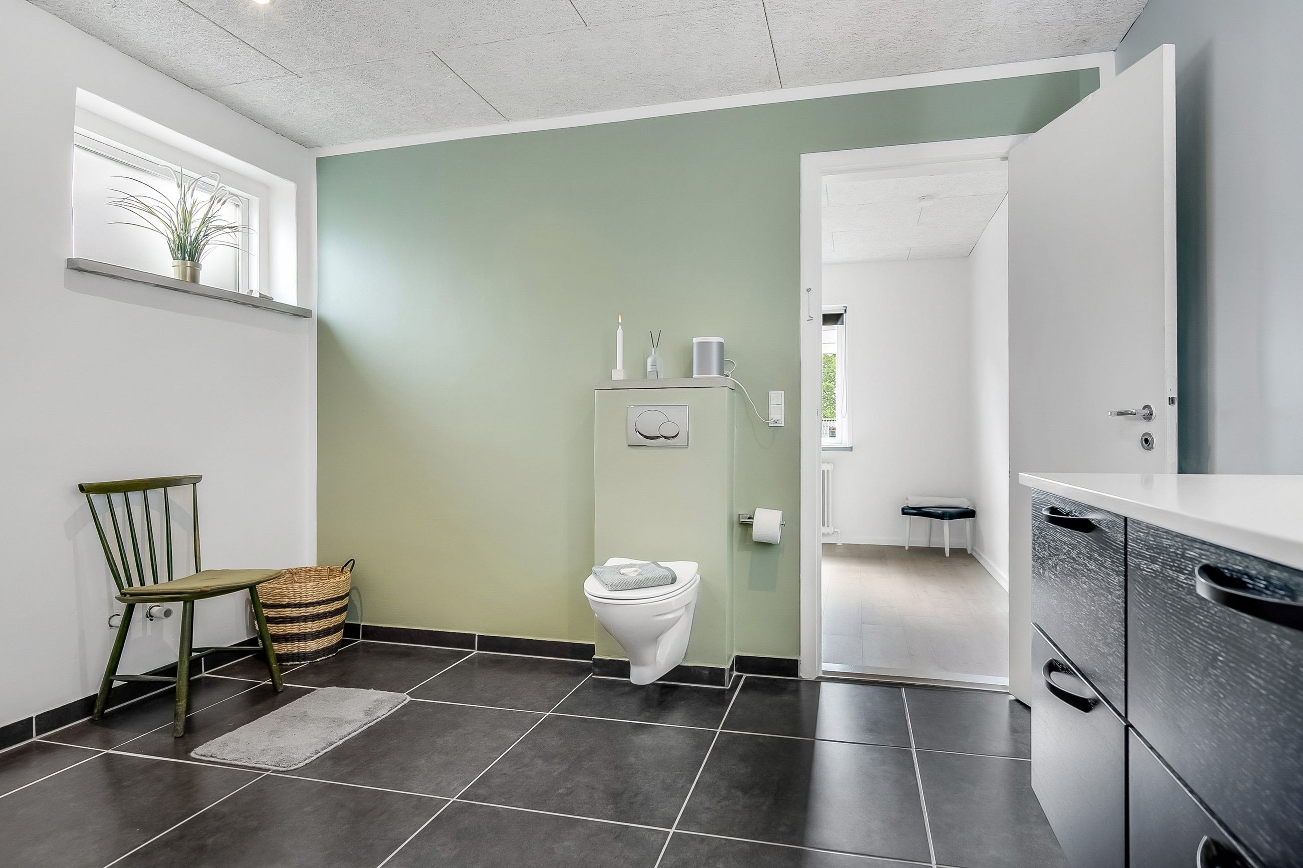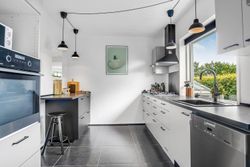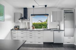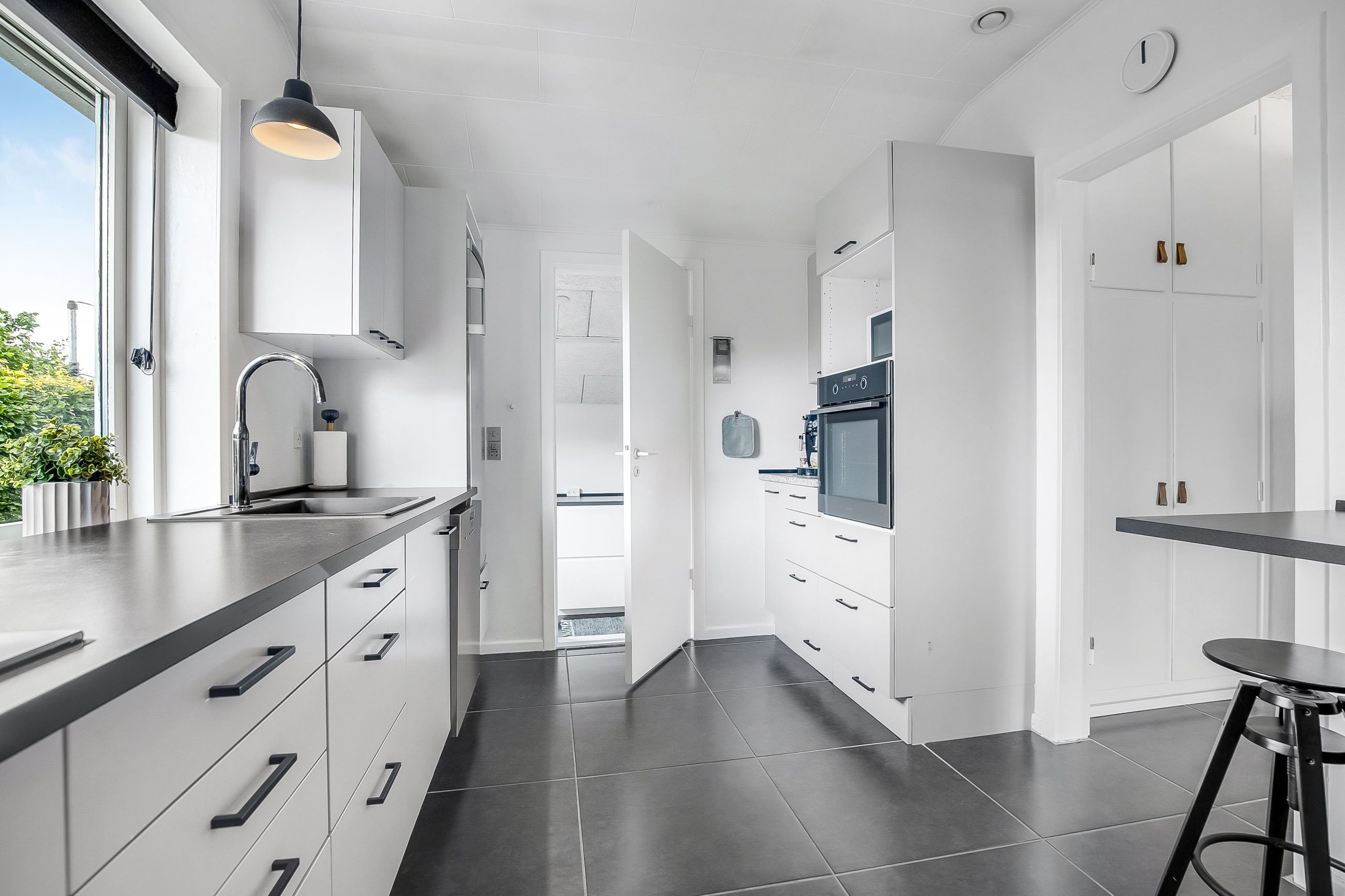 Køkkenet er holdt i et tidløst, gråt design og byder på god skabsplads samt direkte adgang til et praktisk bryggers og et viktualierum. Ønsker man et større køkken/alrum, kan det tilstødende værelse let inddrages, så der skabes et åbent leverum med plads til hele familien.
