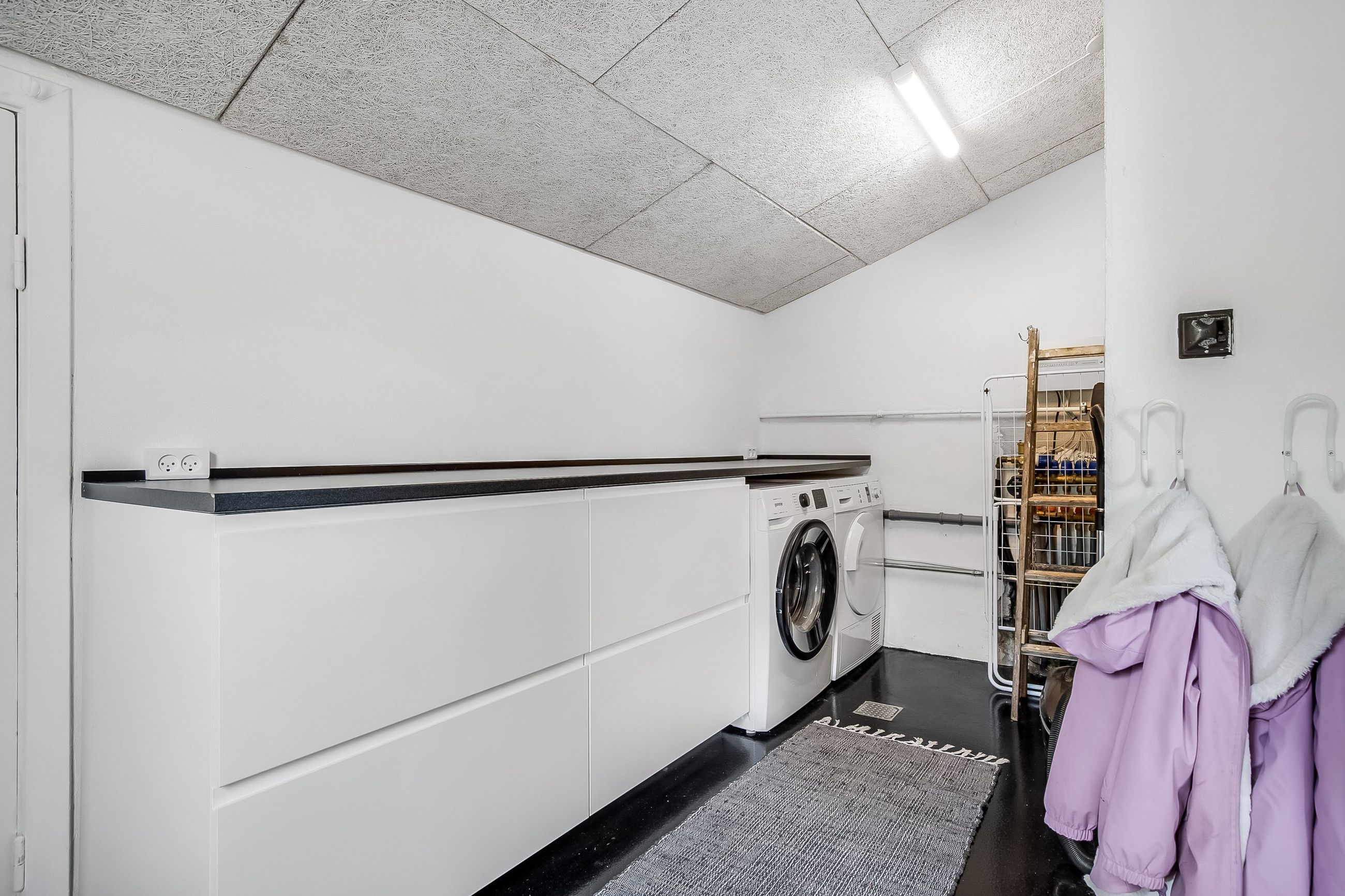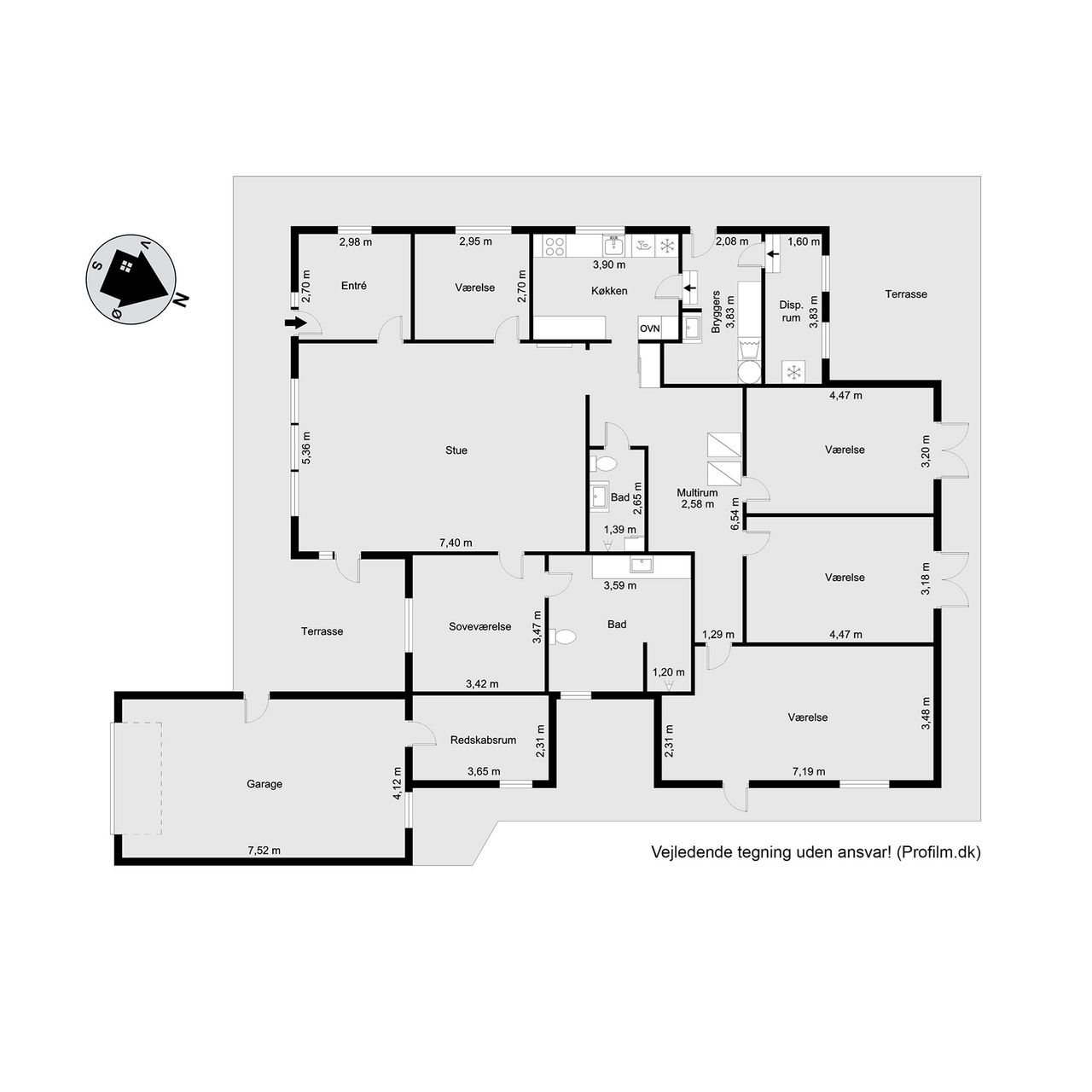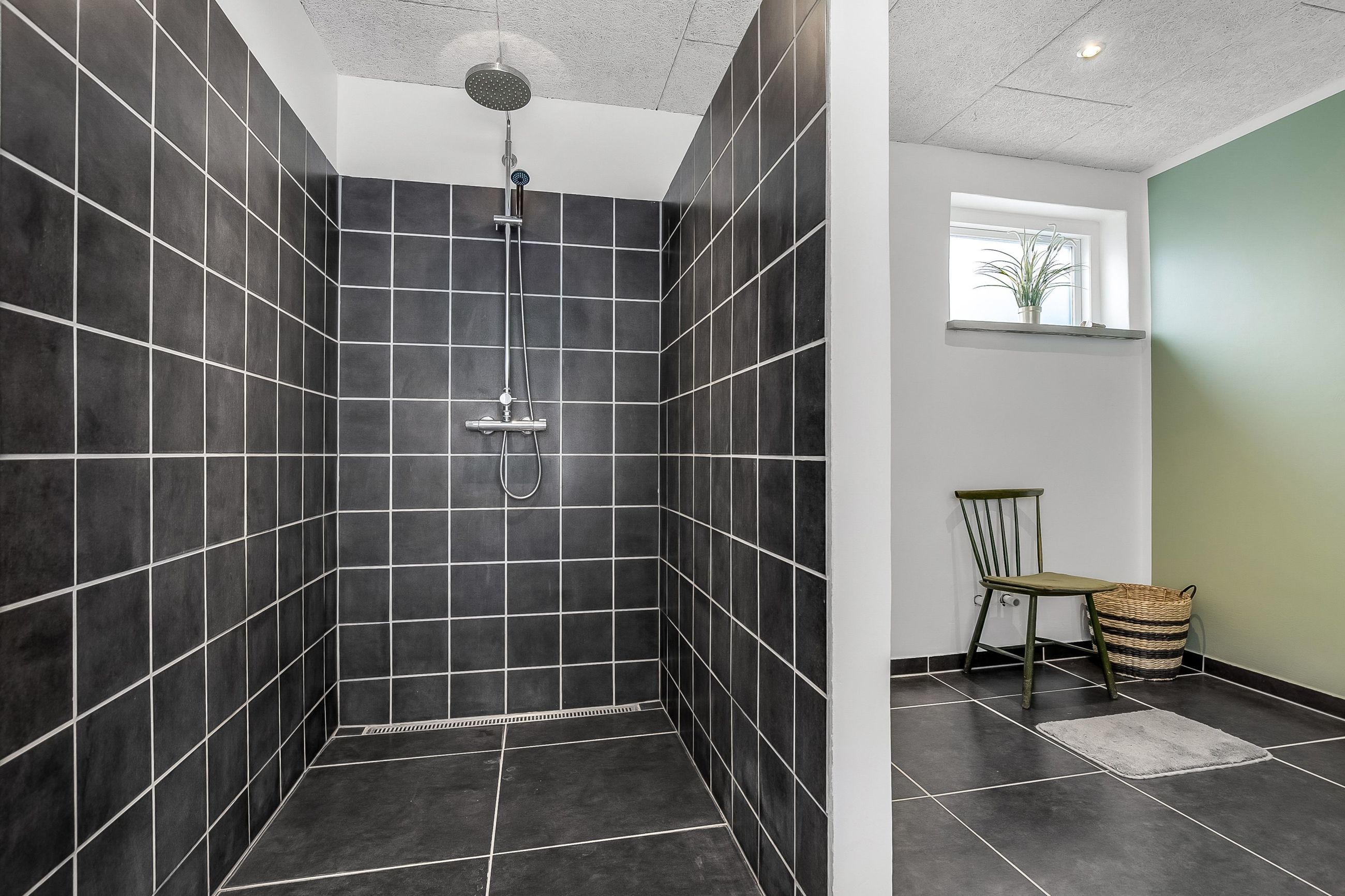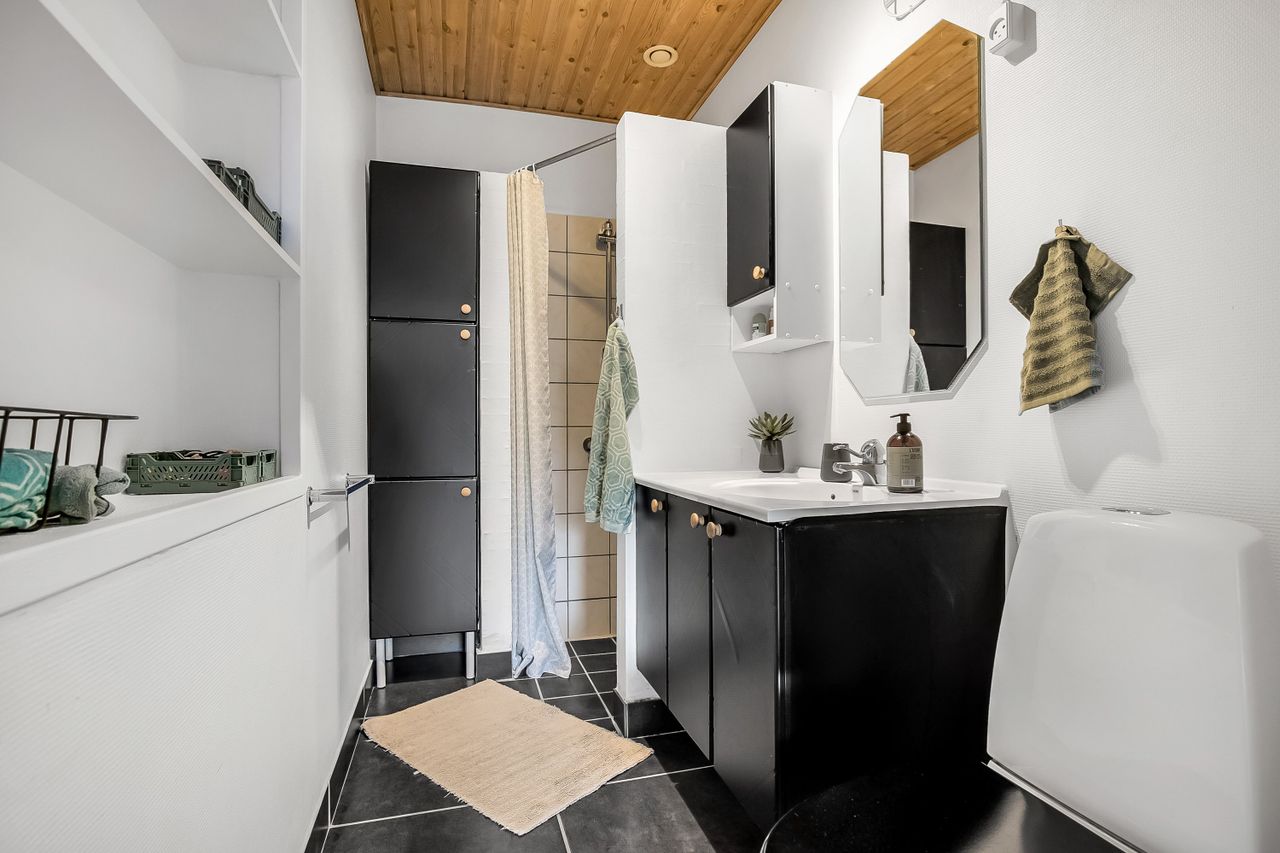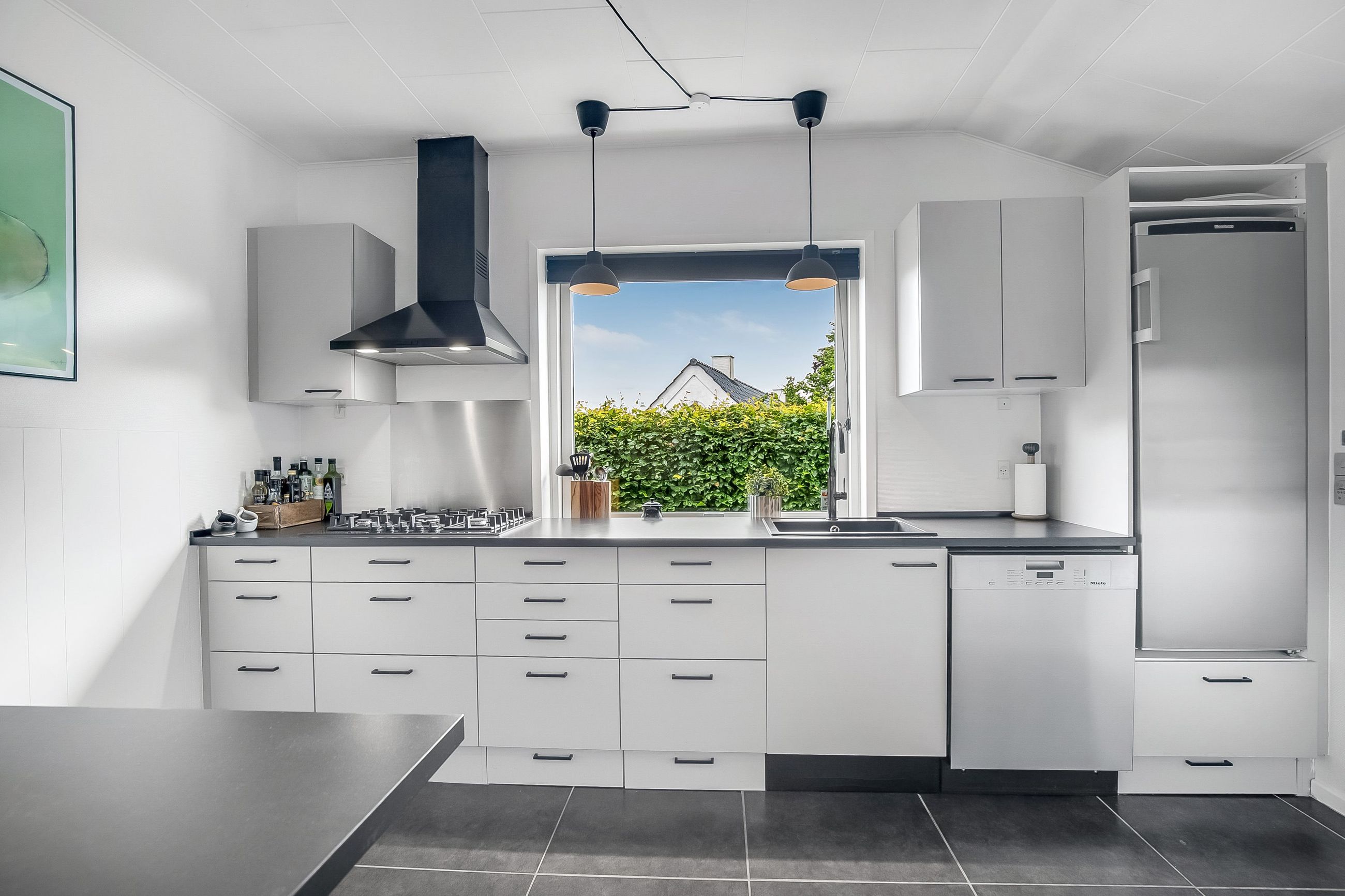 Køkkenet er holdt i et tidløst, gråt design og byder på god skabsplads samt direkte adgang til et praktisk bryggers og et viktualierum. Ønsker man et større køkken/alrum, kan det tilstødende værelse let inddrages, så der skabes et åbent leverum med plads til hele familien.
