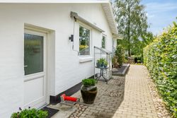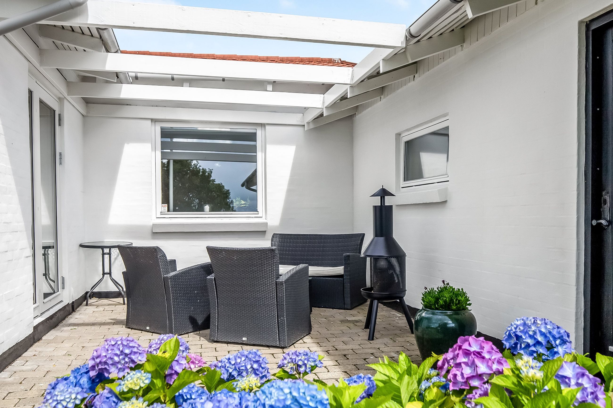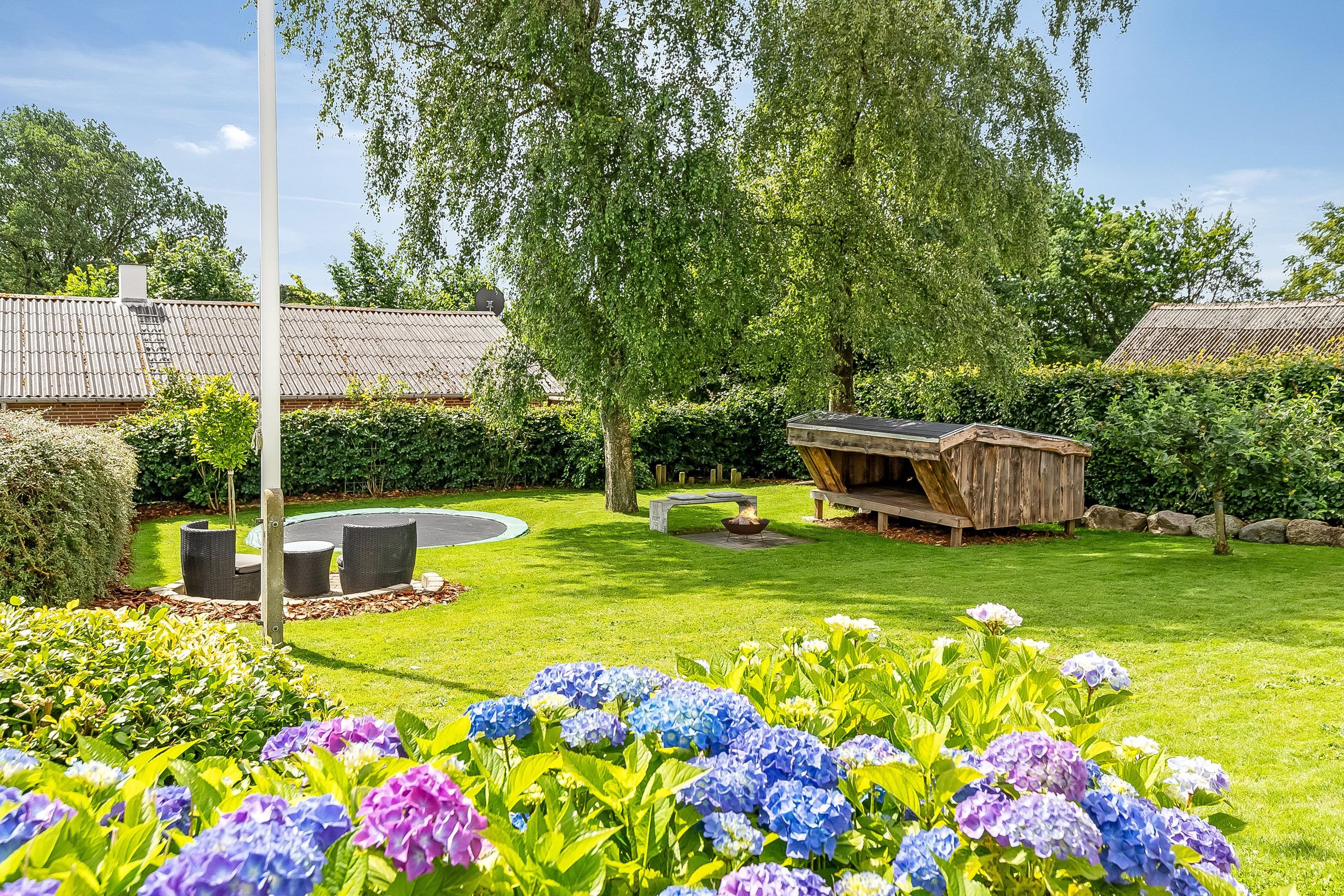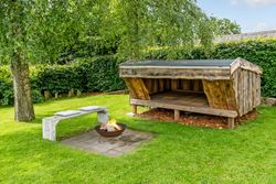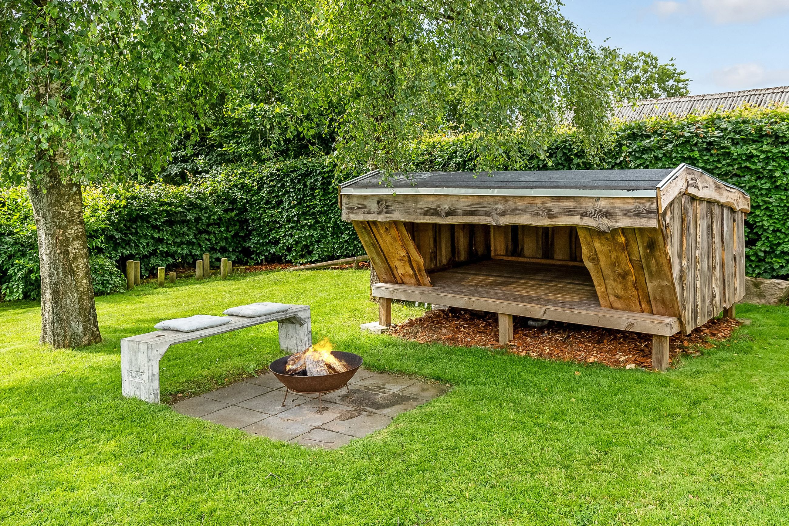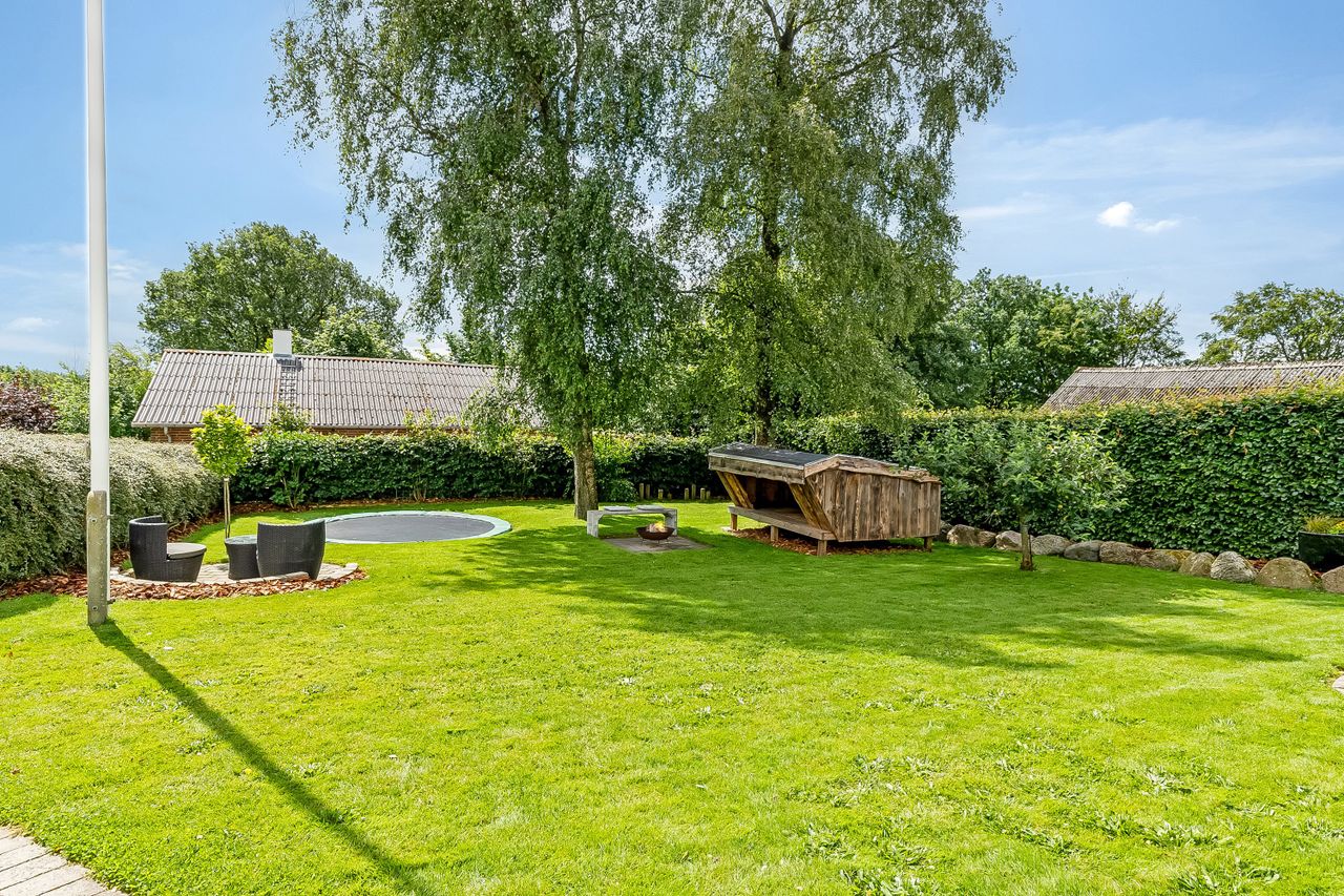Allerede ved ankomsten fornemmer man den hyggelige og private atmosfære, som omgiver ejendommen. Haven er grøn og frodig med høje træer, et hyggeligt shelter og en bålplads – perfekte omgivelser til afslappede sommeraftener og gode stunder i det fri.