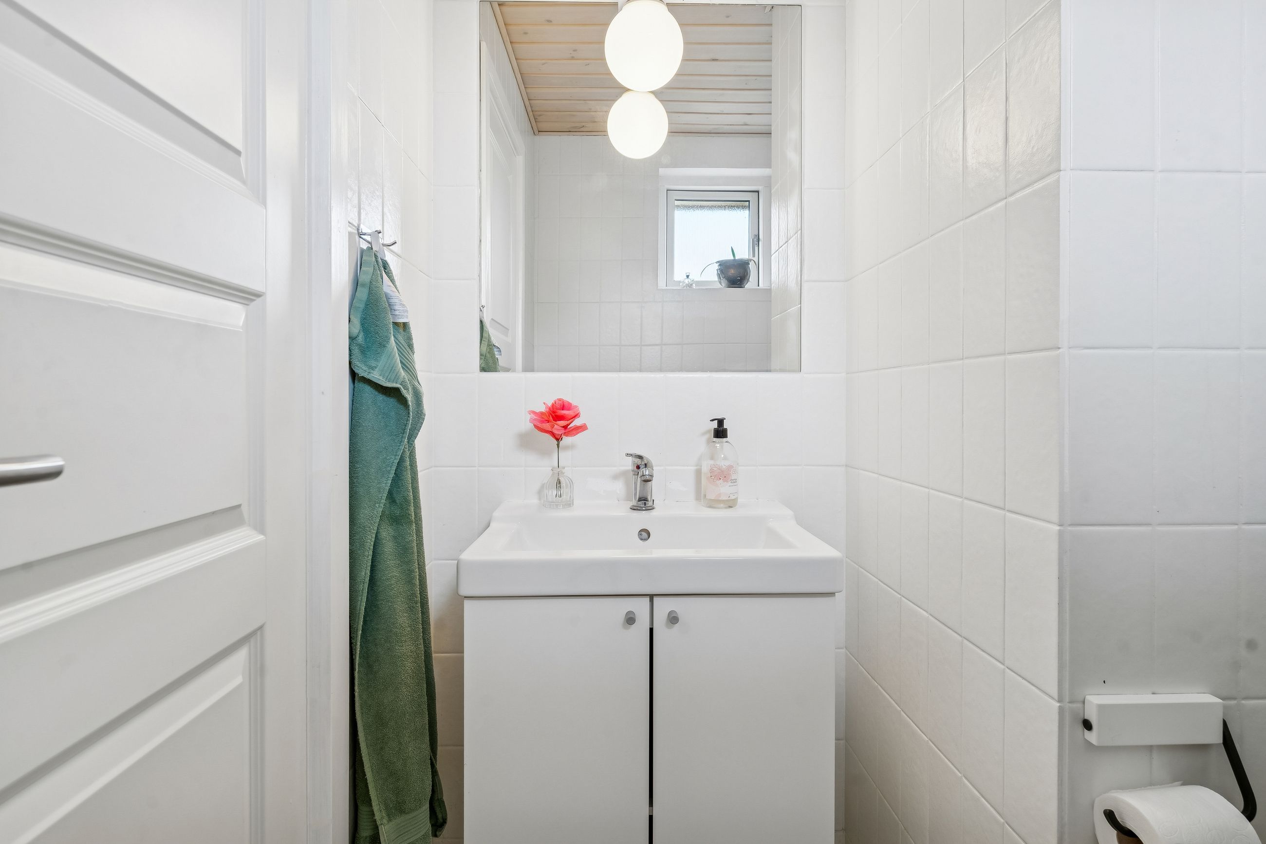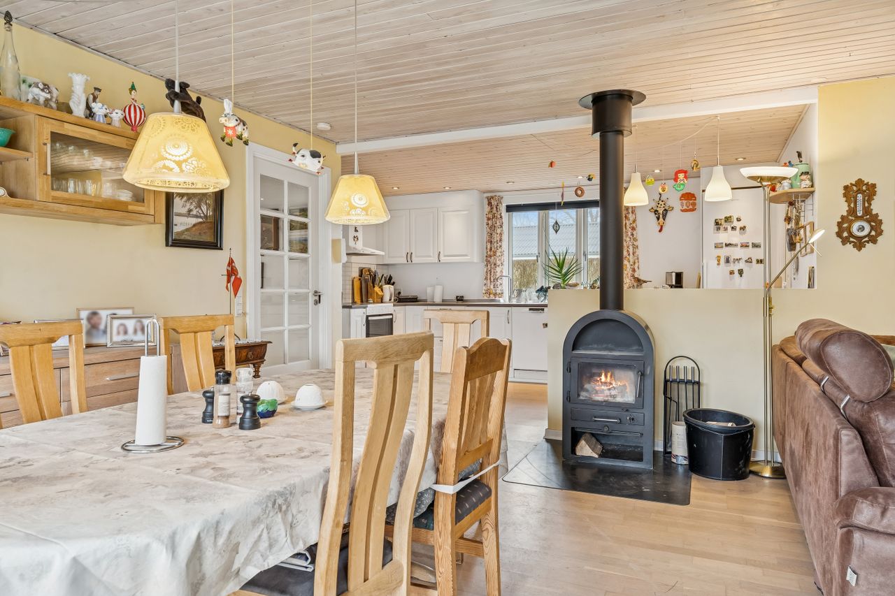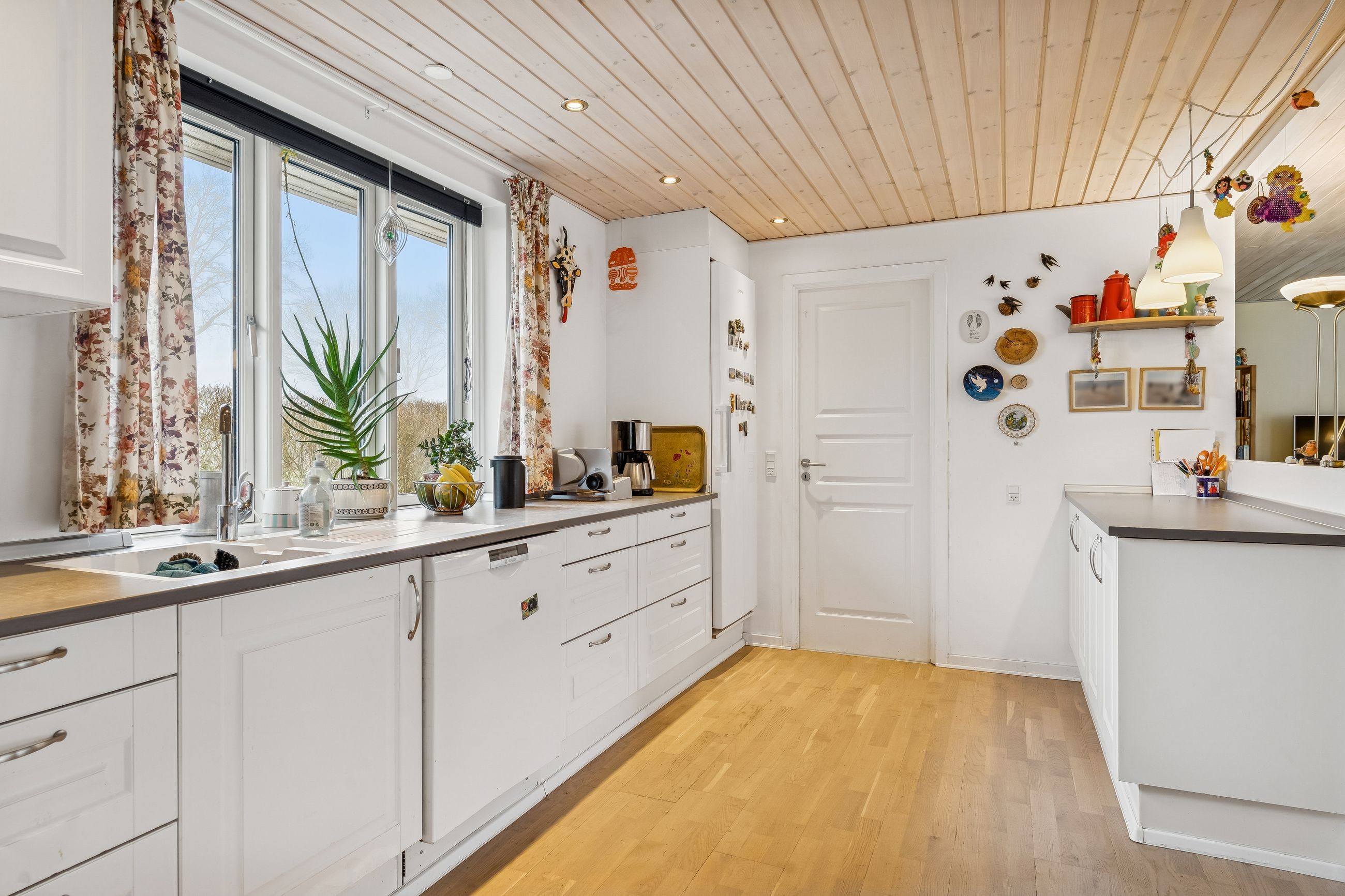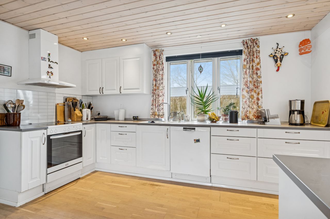 Indgangen til huset sker via en lys entré med god plads til overtøj. Køkkenet er integreret med både spiseafdeling og stue, hvilket skaber en åben og indbydende atmosfære med masser af naturligt lys. Det er indrettet med lyse elementer, indbyggede spots, træbordplade og parketgulve, som går igen i størstedelen af huset. I spisestue og stue sørger store vinduer for et dejligt lysindfald, og der er rigeligt med plads til både spisebord og hyggelig sofasektion. Det klinkebelagte badeværelse har gulvvarme, bruseniche, badekar, toilet, vask og skabsplads, mens gæstetoilettet byder på små klinker, toilet, vask og skab.