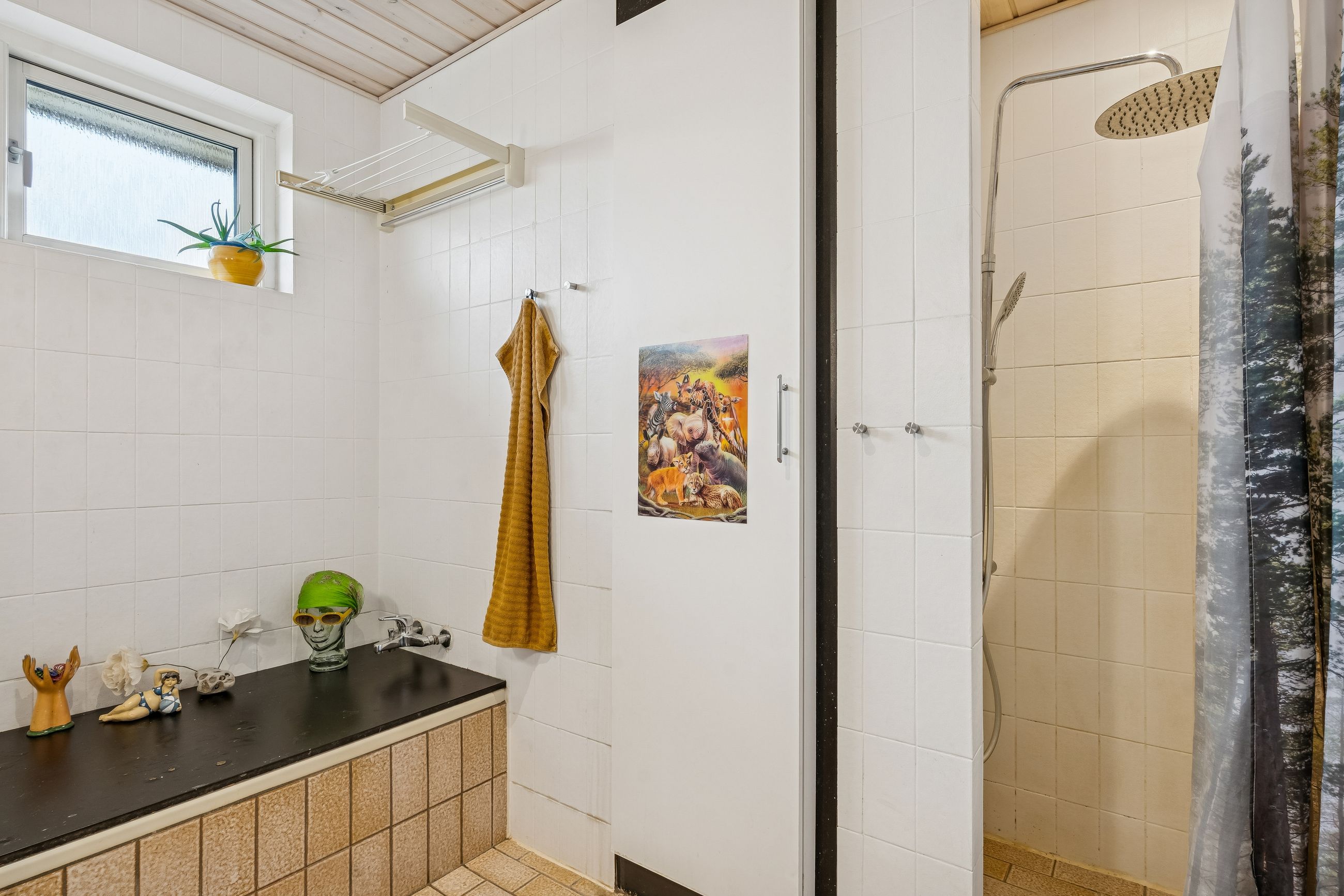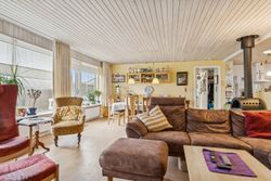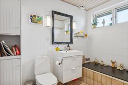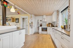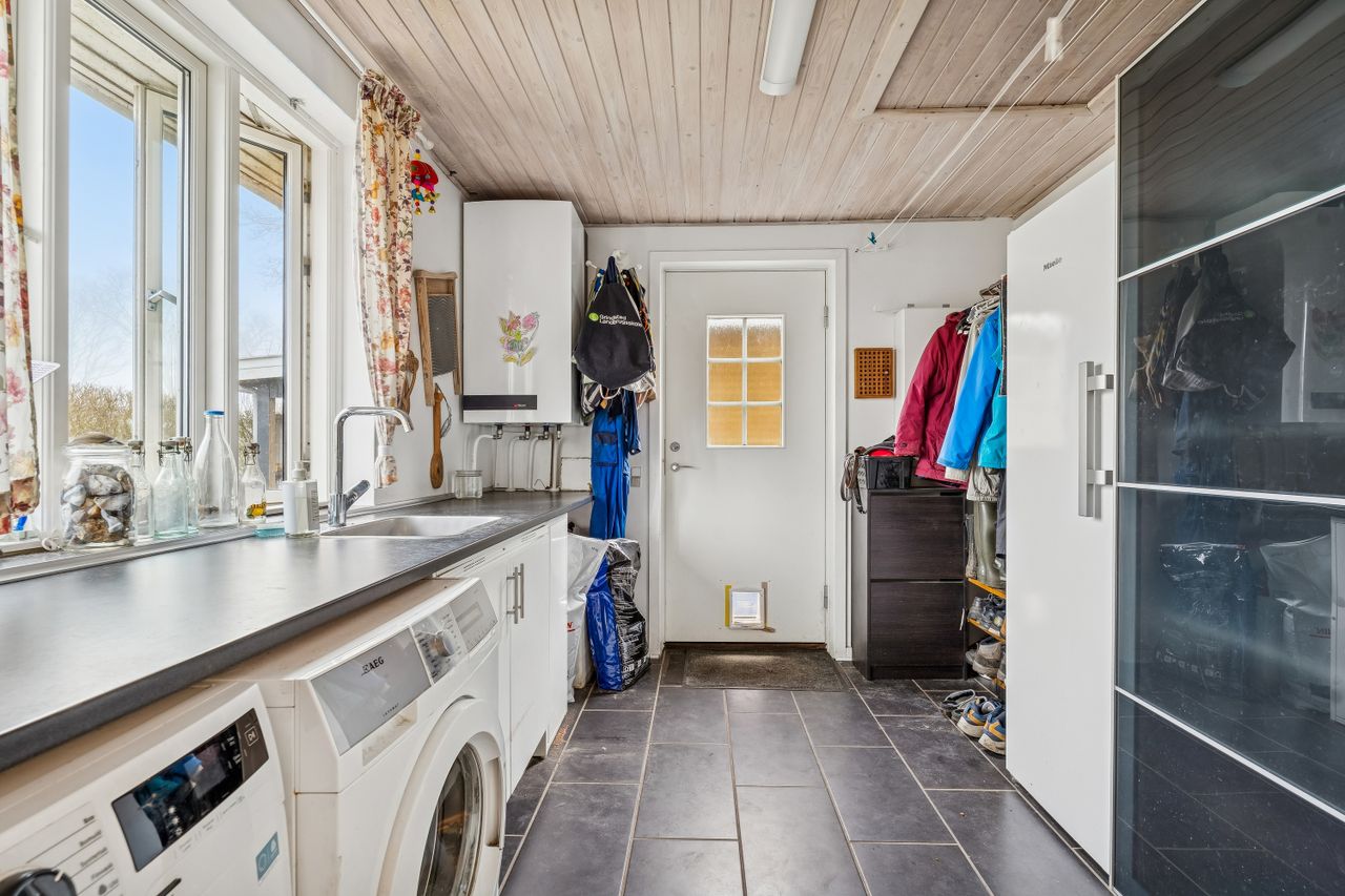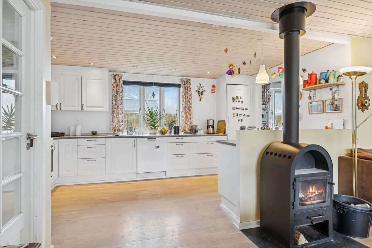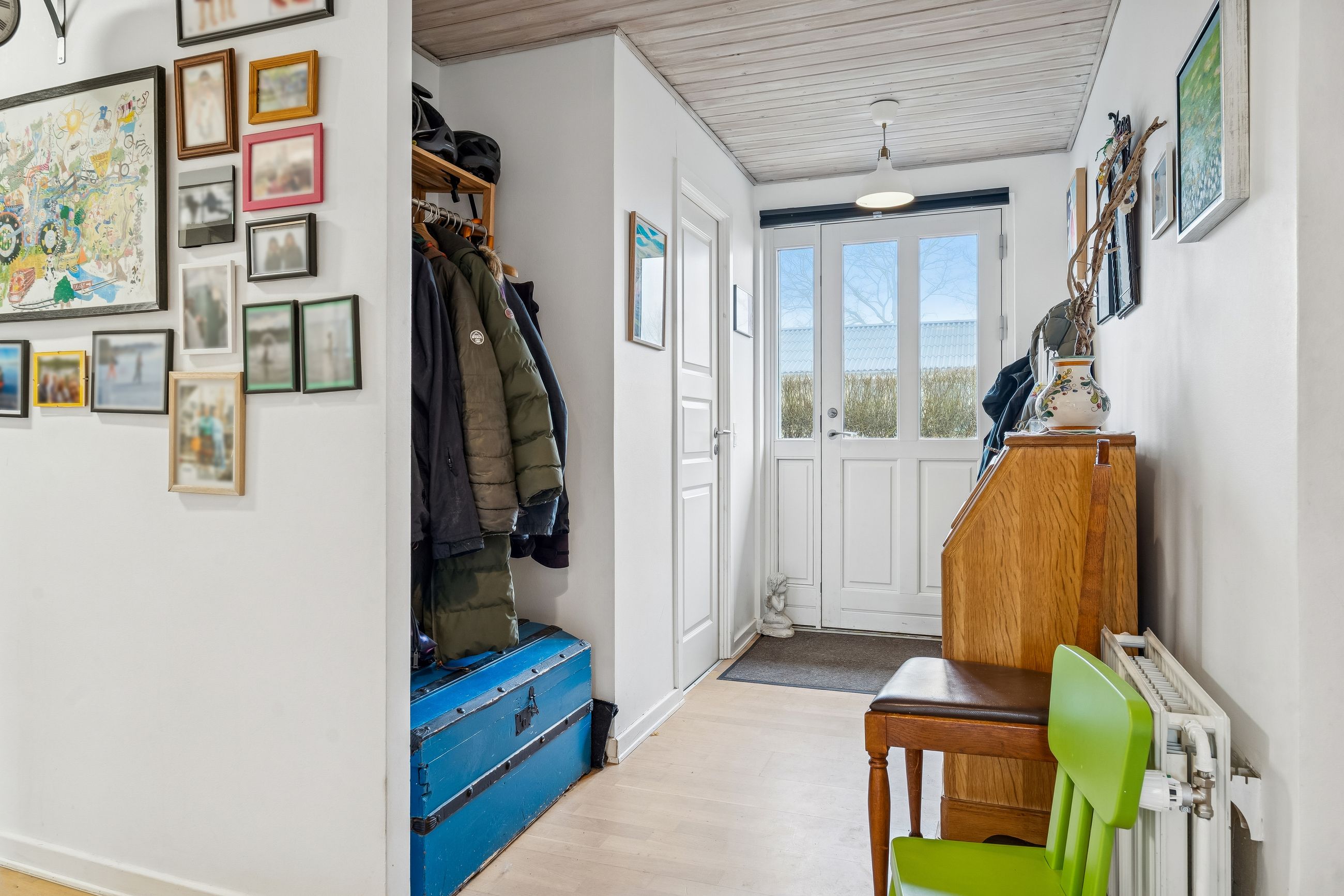 Indgangen til huset sker via en lys entré med god plads til overtøj. Køkkenet er integreret med både spiseafdeling og stue, hvilket skaber en åben og indbydende atmosfære med masser af naturligt lys. Det er indrettet med lyse elementer, indbyggede spots, træbordplade og parketgulve, som går igen i størstedelen af huset. I spisestue og stue sørger store vinduer for et dejligt lysindfald, og der er rigeligt med plads til både spisebord og hyggelig sofasektion. Det klinkebelagte badeværelse har gulvvarme, bruseniche, badekar, toilet, vask og skabsplads, mens gæstetoilettet byder på små klinker, toilet, vask og skab.