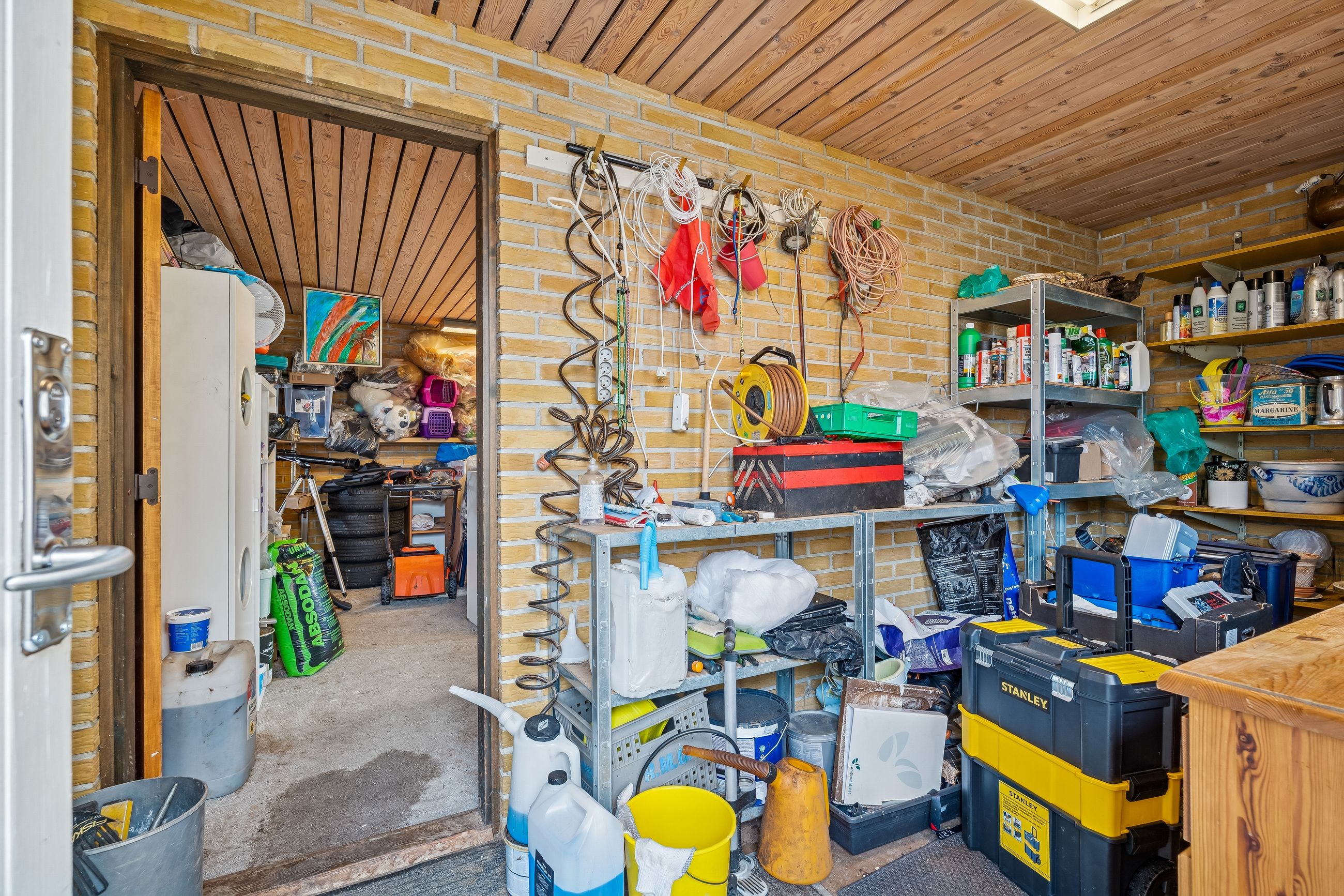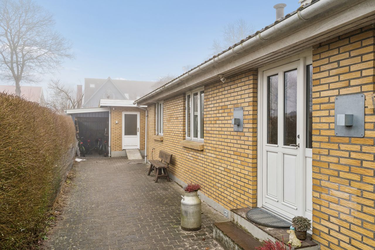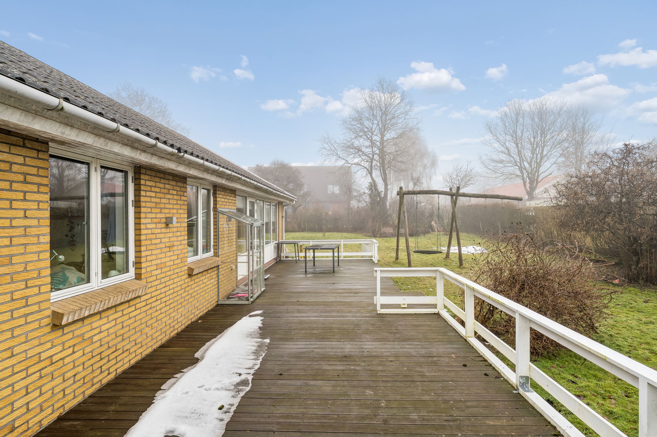 Udendørs finder man en stor træterrasse med gode solforhold – perfekt til sommerdage. Derudover rummer grunden et større udhus/anneks med to rum; det ene fungerer som opbevaringsplads til haveudstyr, mens det andet kan omdannes til eksempelvis hobbyrum eller teenageafdeling med relativt få tilpasninger. Herudover er der i 2019 opført et godt overdækket areal til opbevaring af brænde og cykler. Grunden er på 800 m2 og primært udlagt som græsplæne.