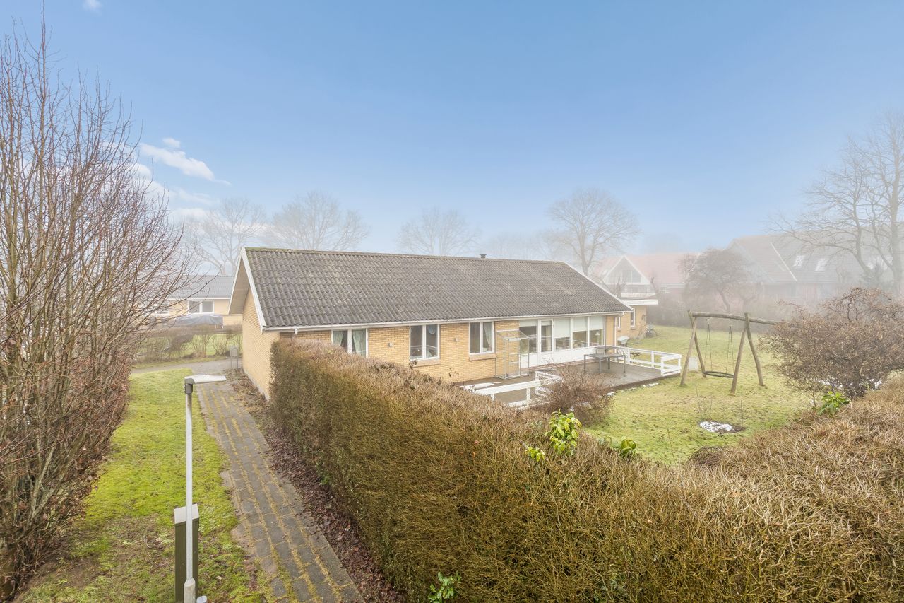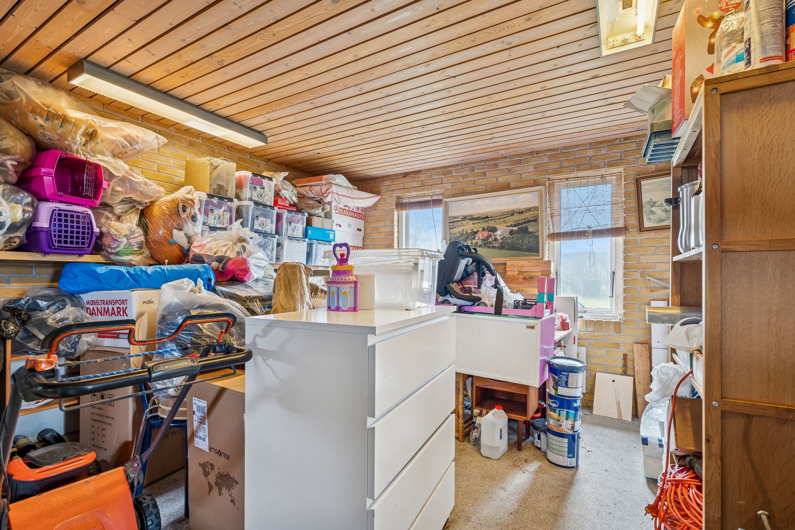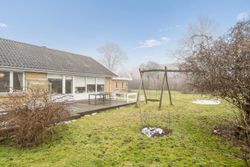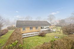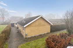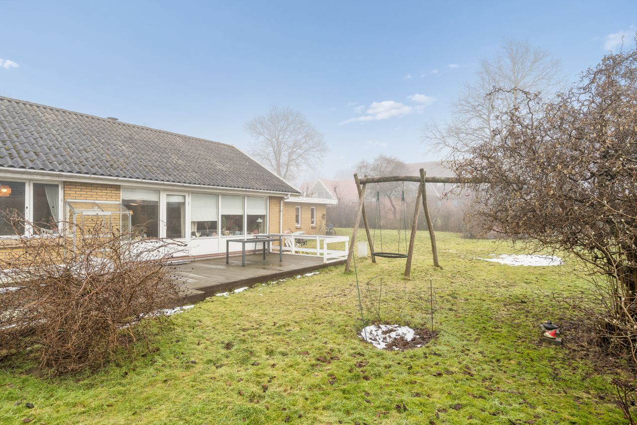 Udendørs finder man en stor træterrasse med gode solforhold – perfekt til sommerdage. Derudover rummer grunden et større udhus/anneks med to rum; det ene fungerer som opbevaringsplads til haveudstyr, mens det andet kan omdannes til eksempelvis hobbyrum eller teenageafdeling med relativt få tilpasninger. Herudover er der i 2019 opført et godt overdækket areal til opbevaring af brænde og cykler. Grunden er på 800 m2 og primært udlagt som græsplæne.
